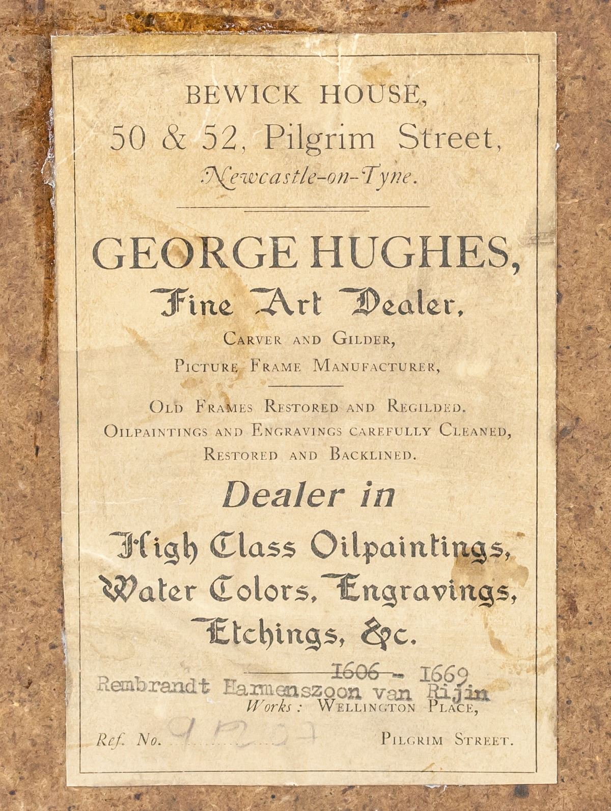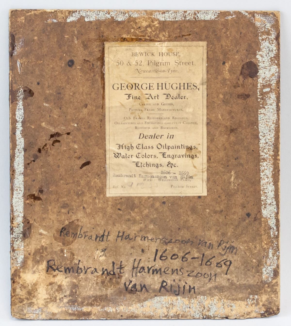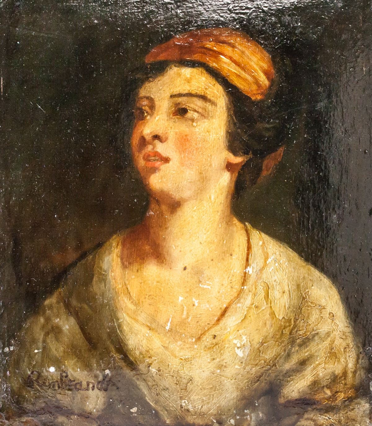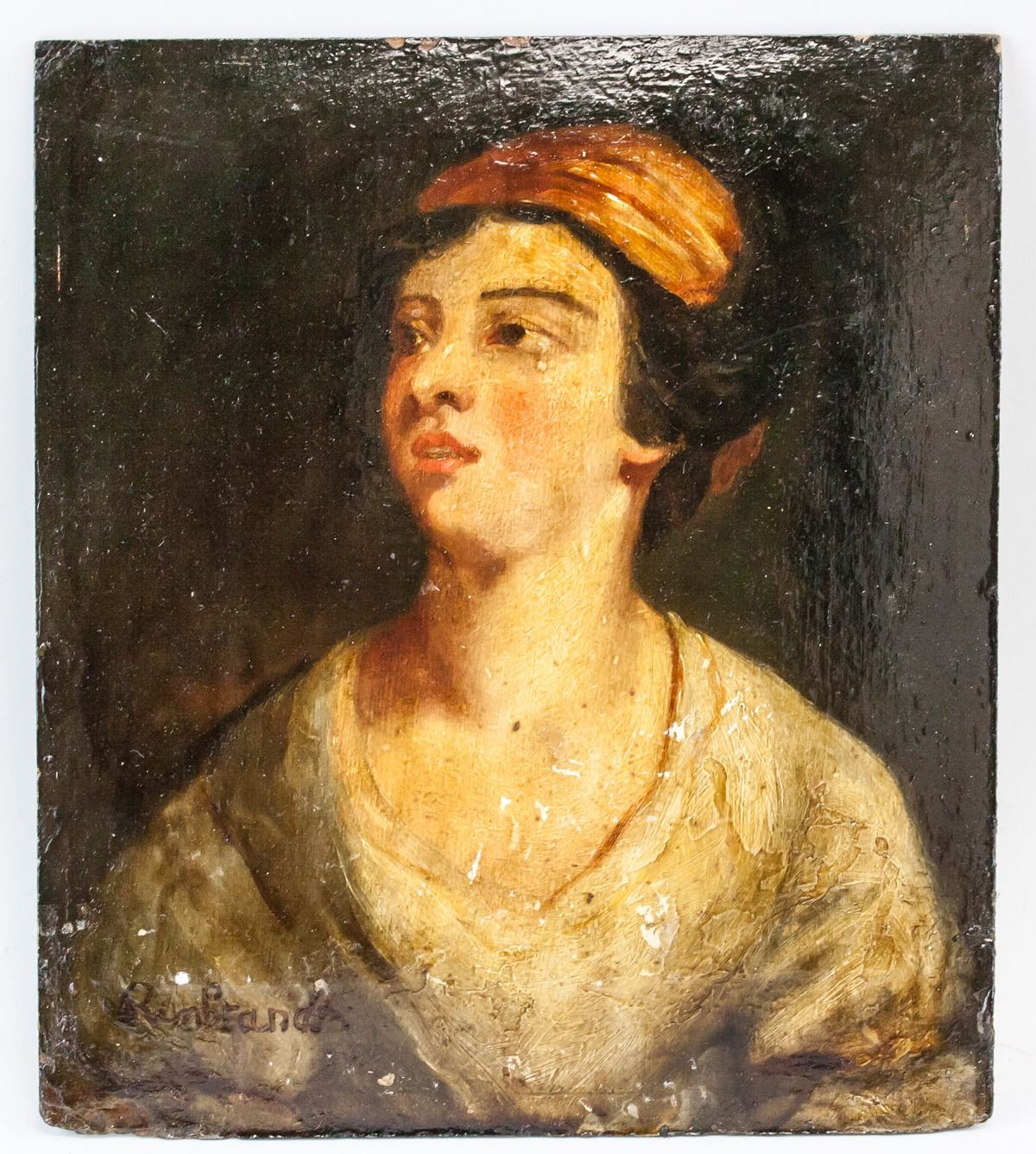Oil on board. Featuring portrait of a woman. Signed "Rembrandt" in the bottom left corner. Label on verso reads "GEORGE HUGHES Fine Art Dealer". "Rembrandt Harmenszoon Van Rijn 1606-1669" inscribed on verso. After Rembrandt (1606-1669, Dutch). 26 x 22 cm (10 x 8.95 in).