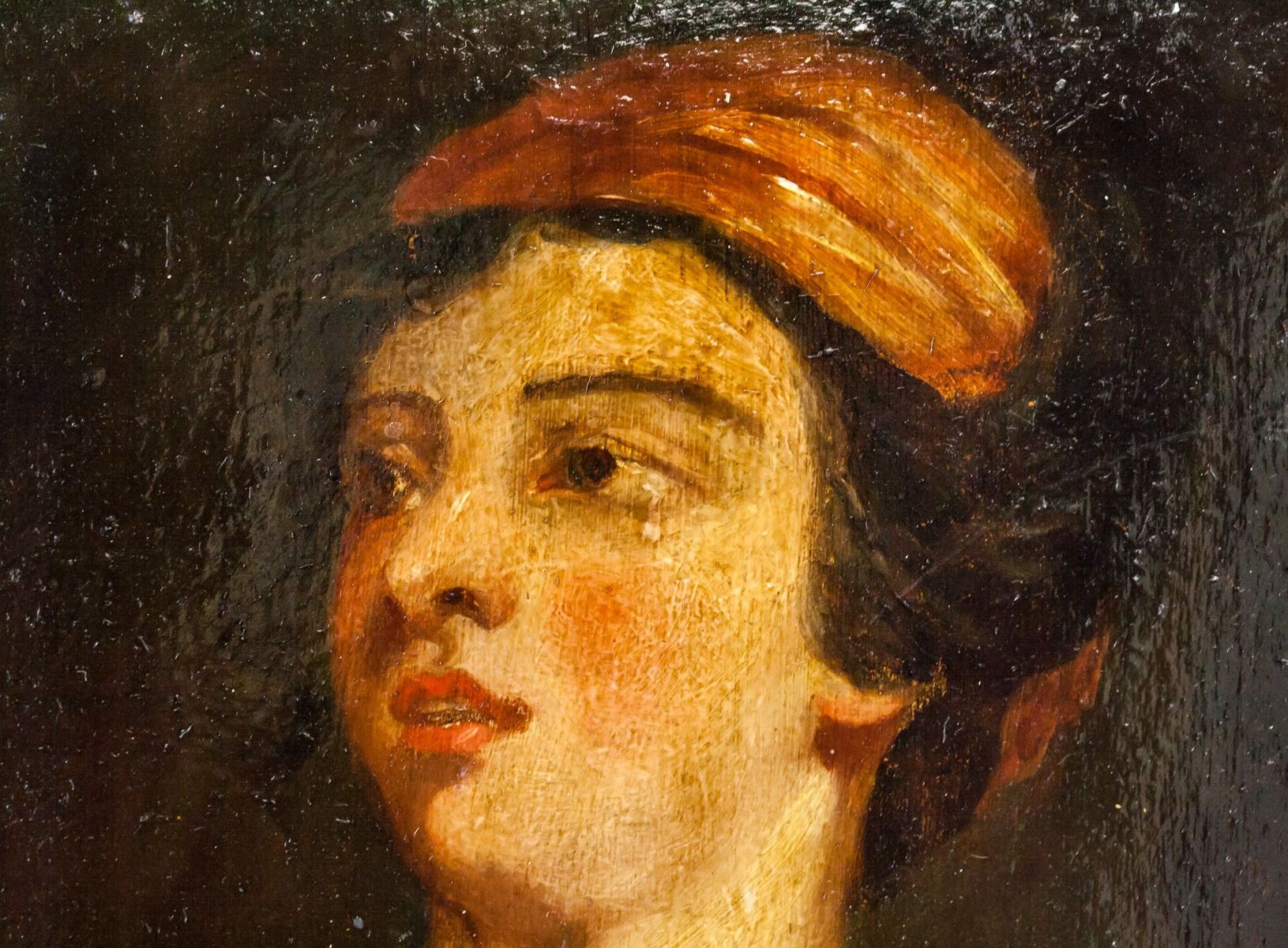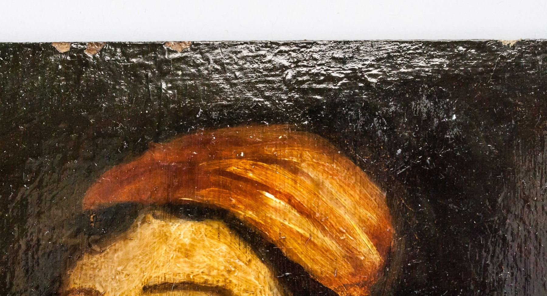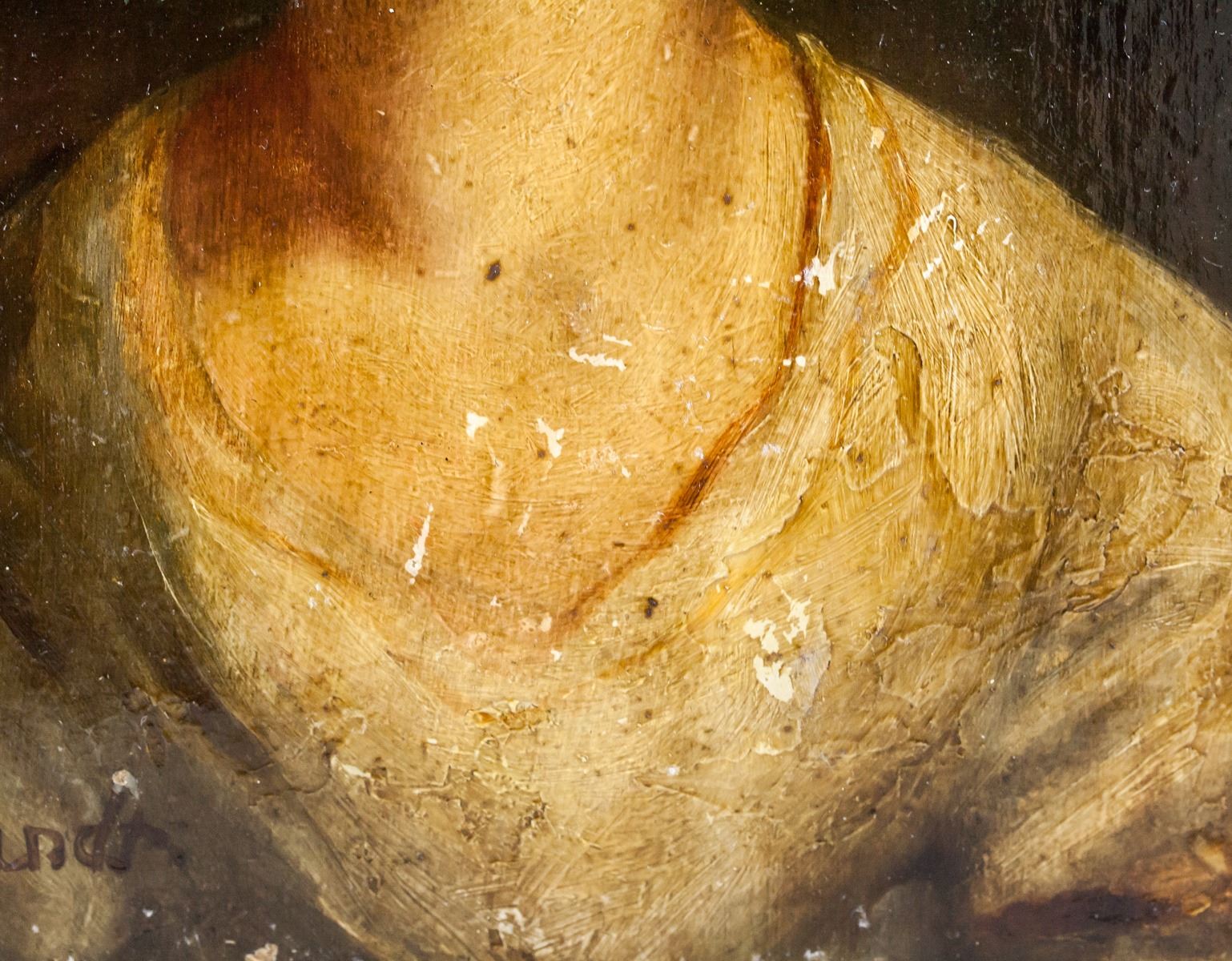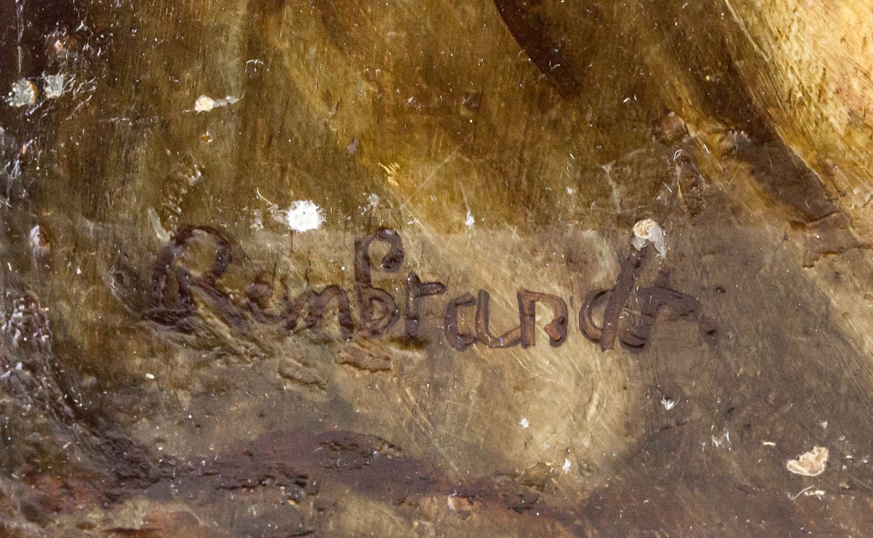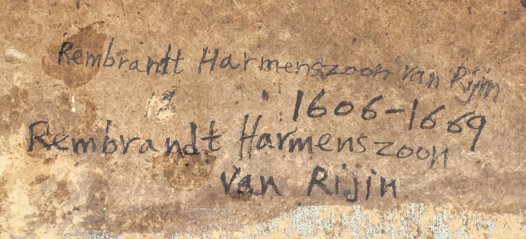 Oil on board. Featuring portrait of a woman. Signed "Rembrandt" in the bottom left corner. Label on verso reads "GEORGE HUGHES Fine Art Dealer". "Rembrandt Harmenszoon Van Rijn 1606-1669" inscribed on verso. After Rembrandt (1606-1669, Dutch). 26 x 22 cm (10 x 8.95 in).