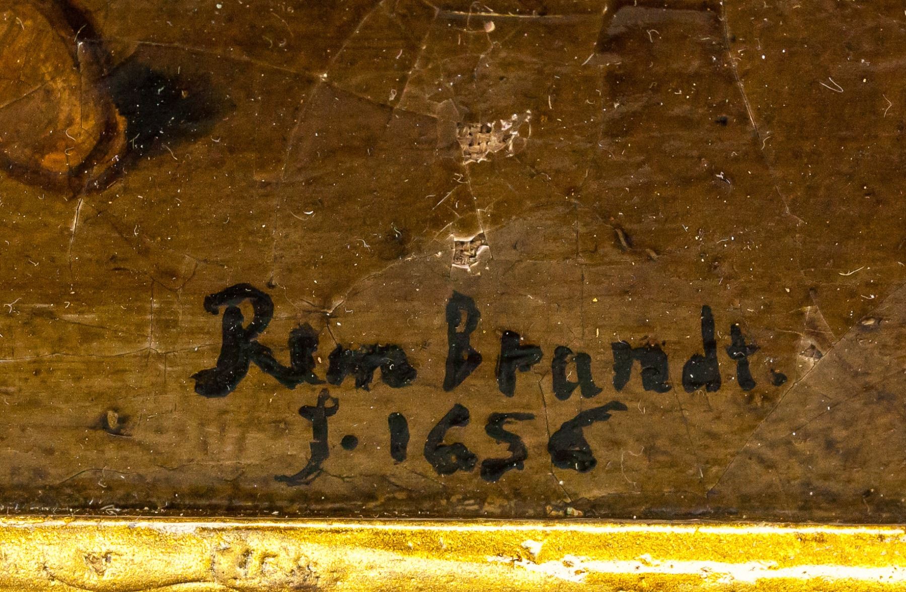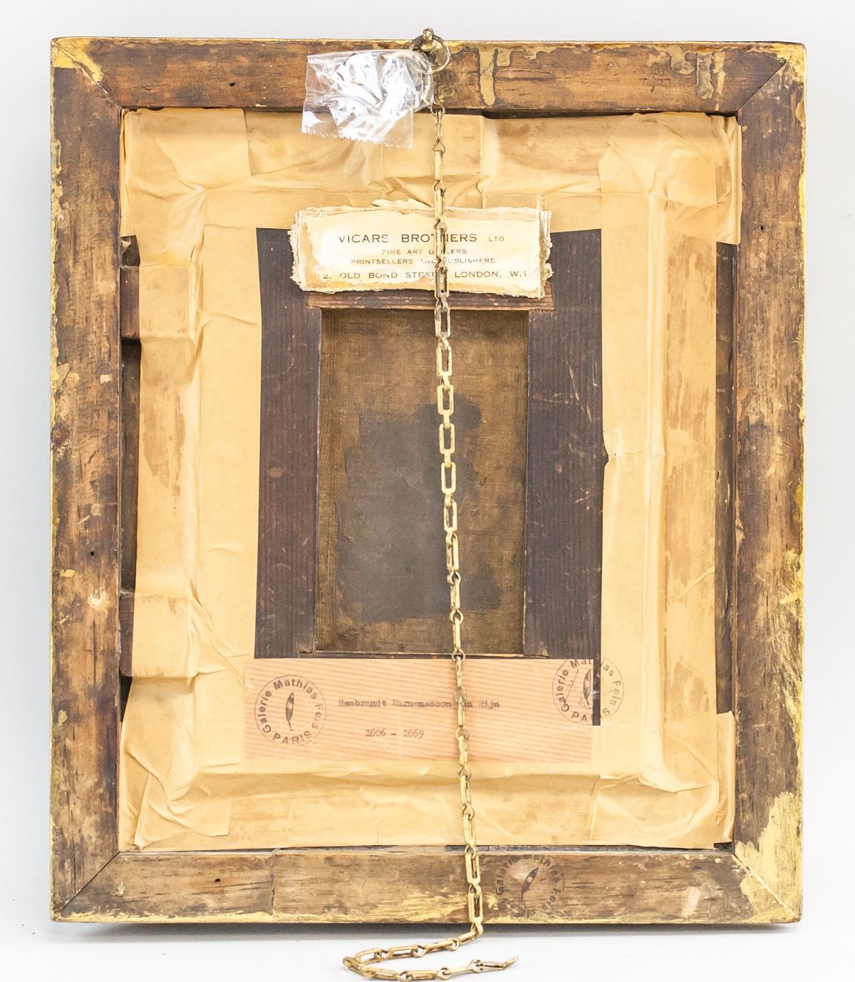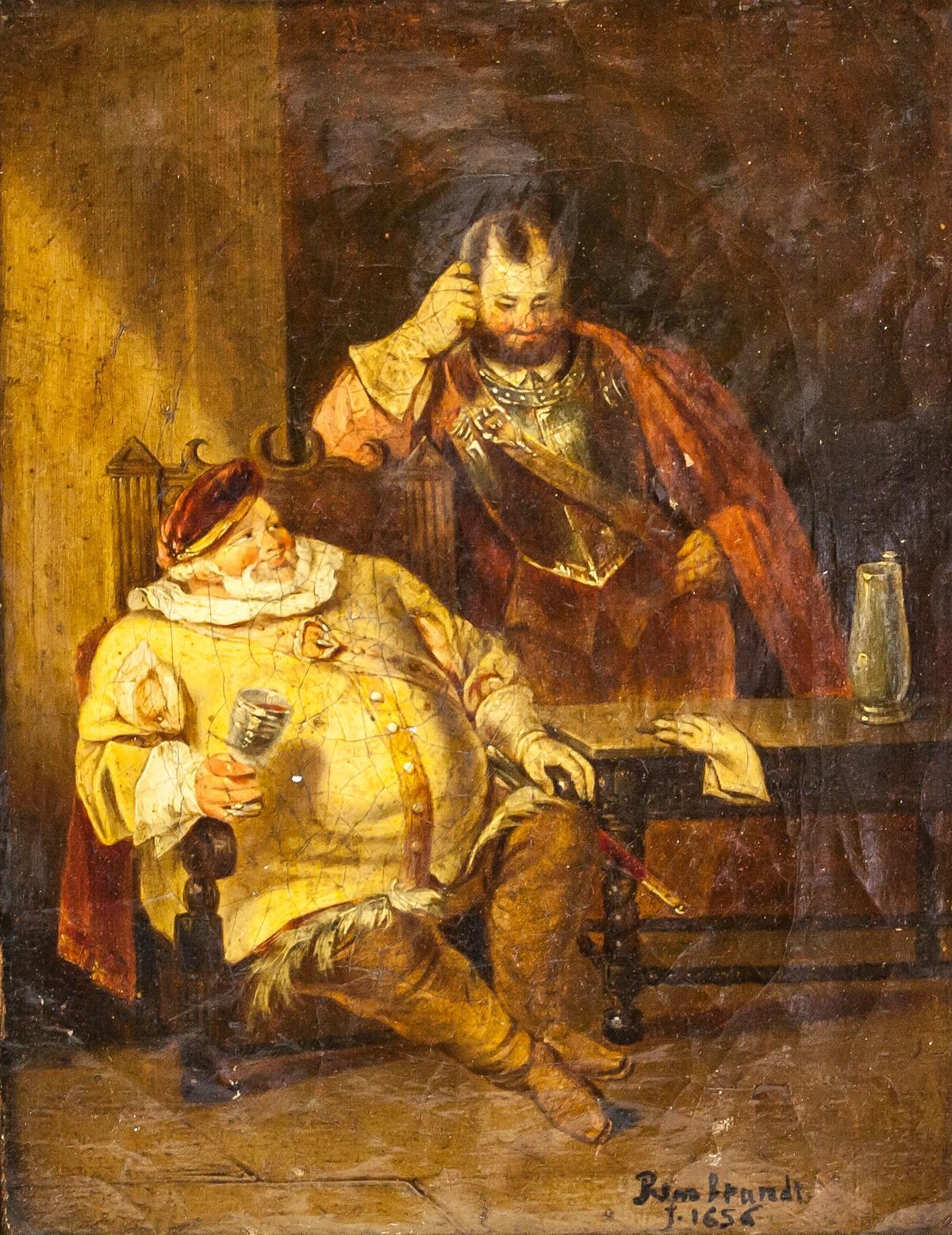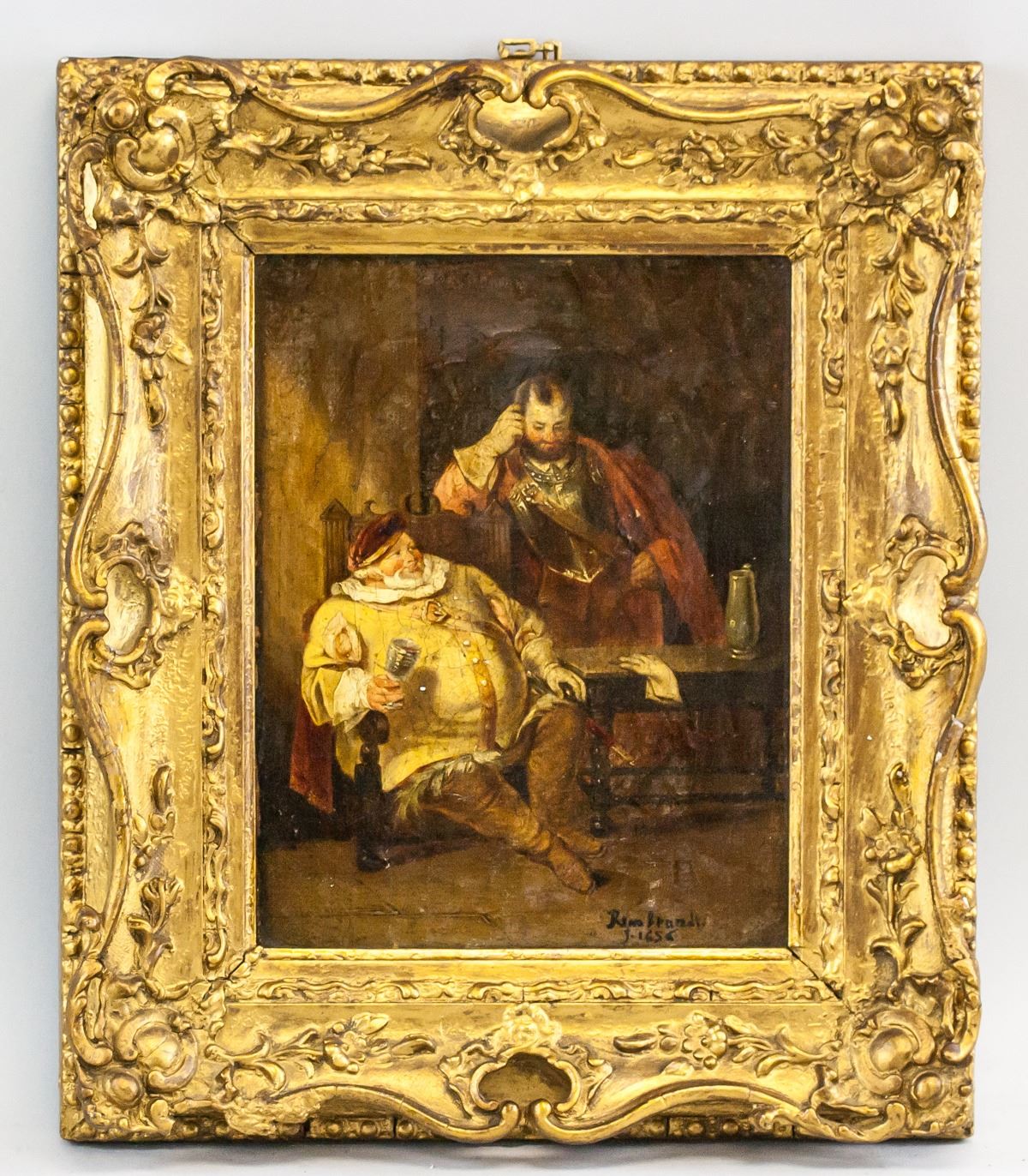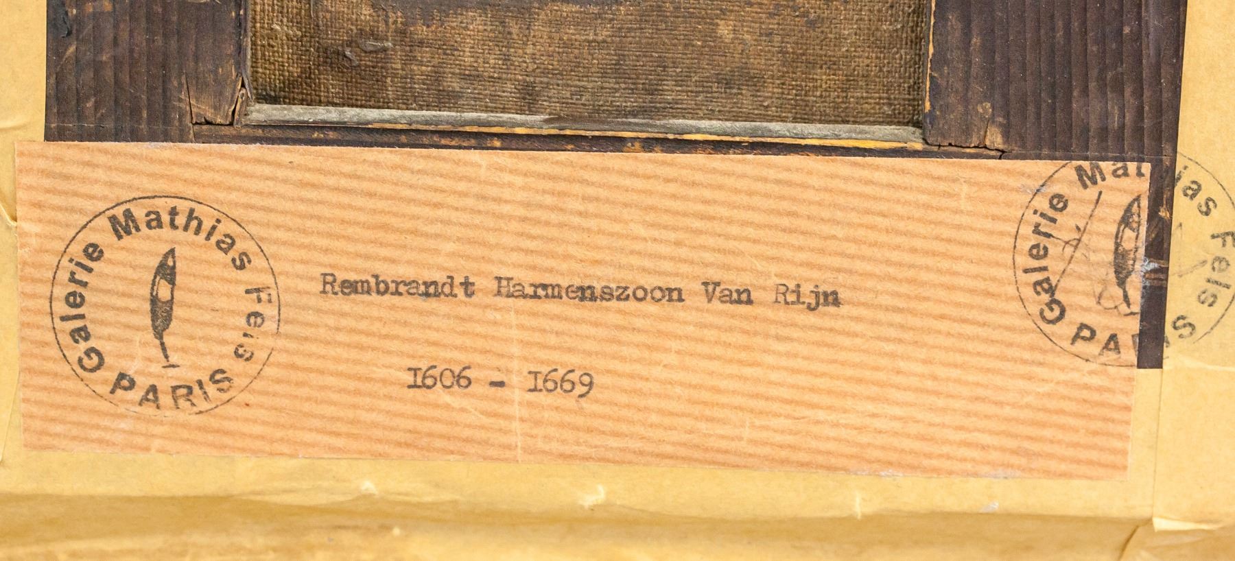 Oil on canvas, framed. Featuring portrait of two well-dressed men. One in a yellow coat with a large belly, the other standing behind the table in a red cloak. Signed "RemBrandt" in the bottom right corner. With "1656" inscribed beneath the signature. Cracking throughout image surface. Label affixed to verso reads "VICARS BROTHERS LTD FINE ART DEALERS". Stamped with "Rembrandt Harmenszoon Van Rijn 1606-1669" and "Galerie Mathias Fels PARIS". After Rembrandt (1606-1669, Dutch). 22 x 17 cm (8.7 x 6.5 inches), framed size: 35 x 29 cm (13.5 x 11.5 inches). Provenance: This lot carries limited provenance from a Private English collection