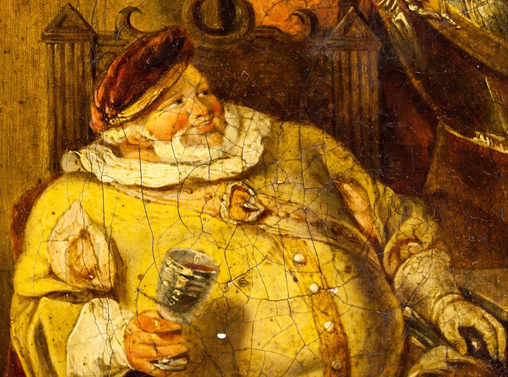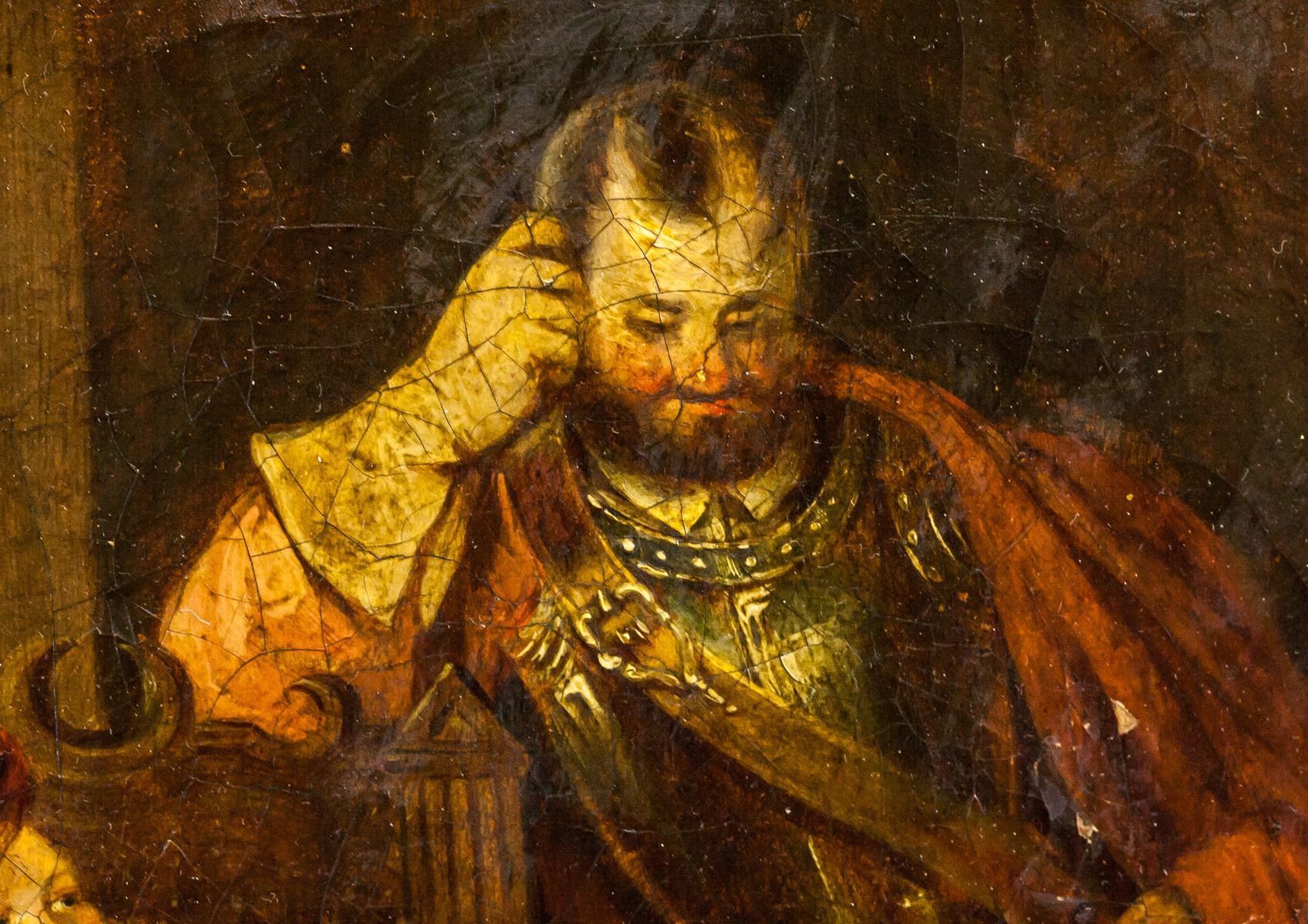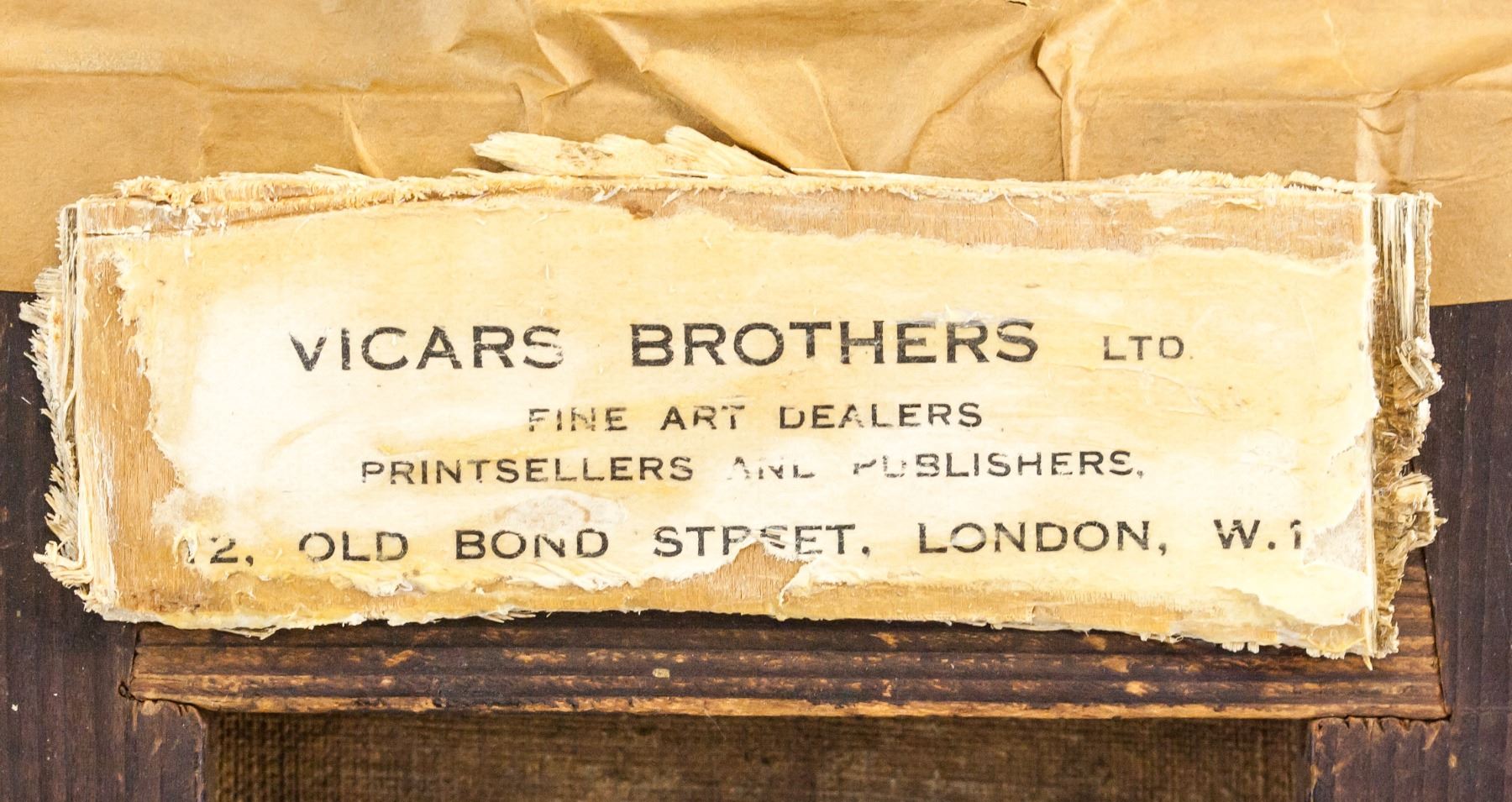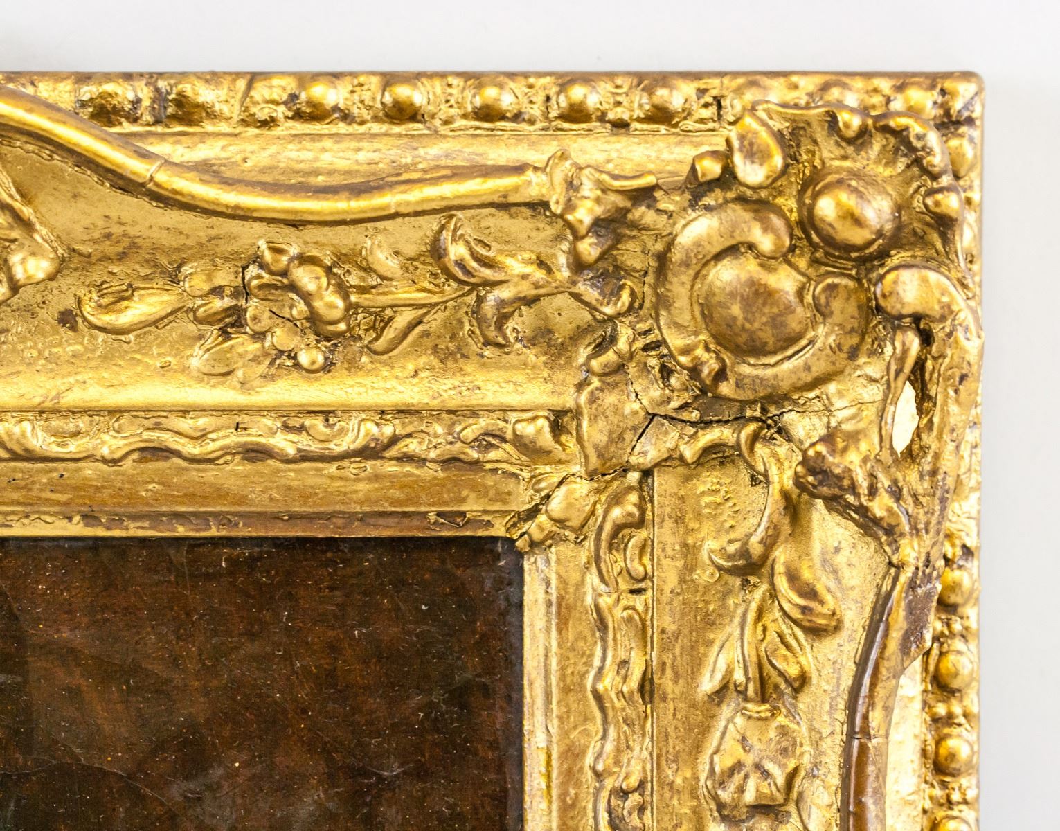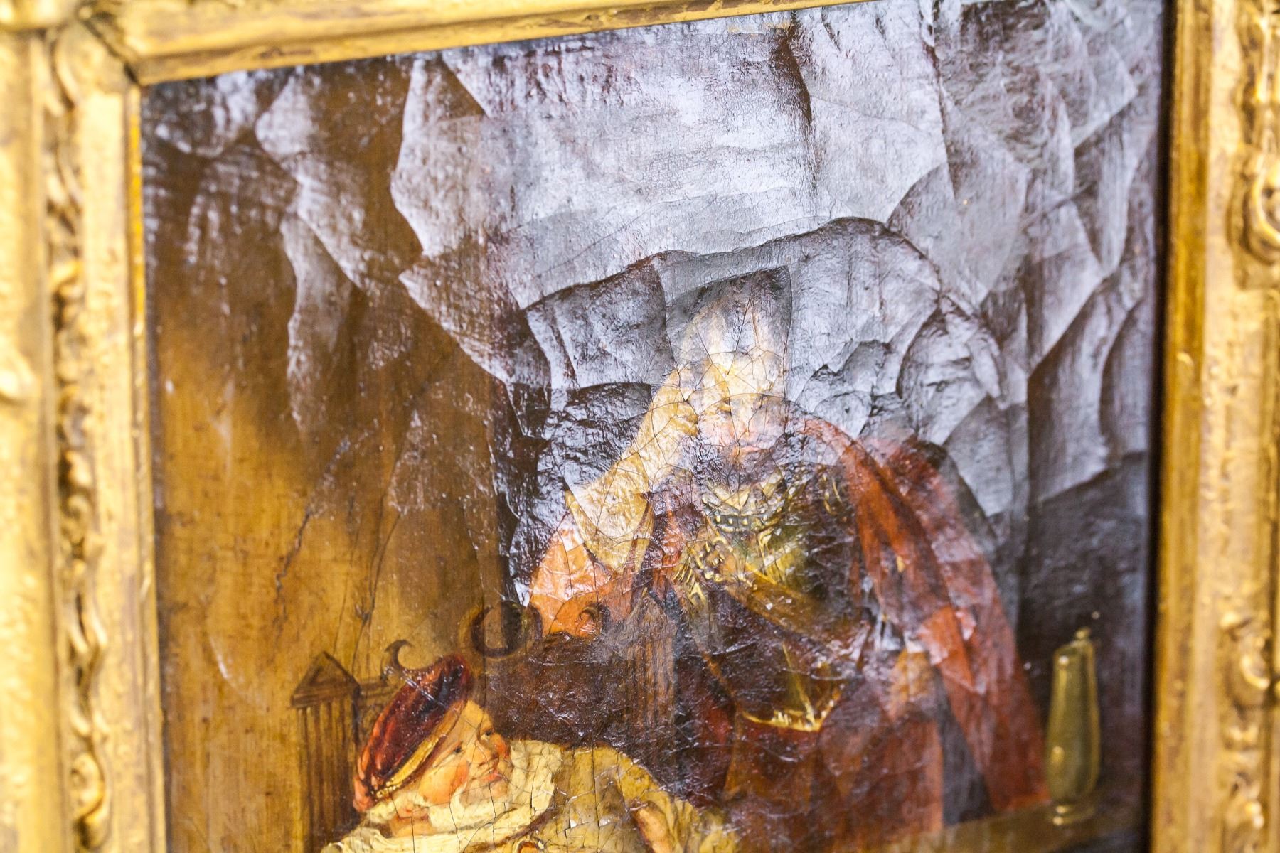 Oil on canvas, framed. Featuring portrait of two well-dressed men. One in a yellow coat with a large belly, the other standing behind the table in a red cloak. Signed "RemBrandt" in the bottom right corner. With "1656" inscribed beneath the signature. Cracking throughout image surface. Label affixed to verso reads "VICARS BROTHERS LTD FINE ART DEALERS". Stamped with "Rembrandt Harmenszoon Van Rijn 1606-1669" and "Galerie Mathias Fels PARIS". After Rembrandt (1606-1669, Dutch). 22 x 17 cm (8.7 x 6.5 inches), framed size: 35 x 29 cm (13.5 x 11.5 inches). Provenance: This lot carries limited provenance from a Private English collection