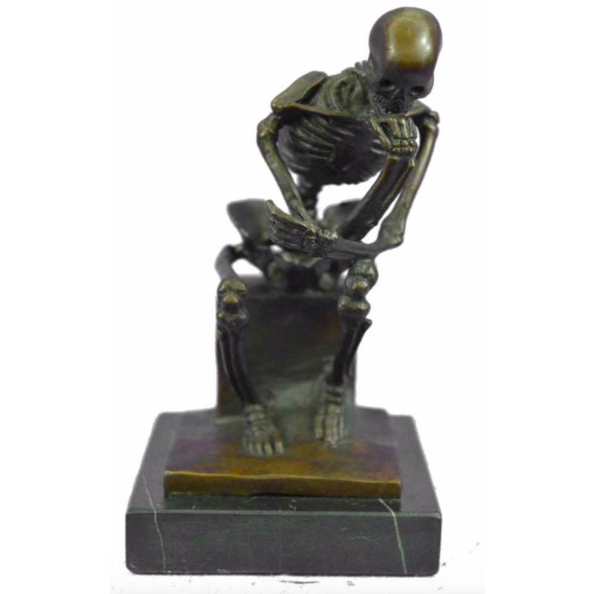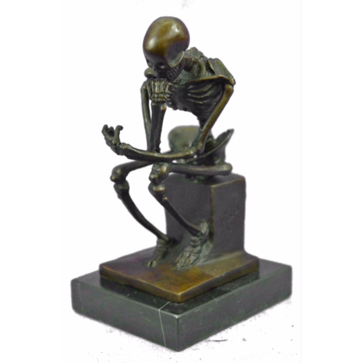 After Rodin's famous sculpture, a sculpture of a sitting skeleton thinker. Lost wax casting method bronze, with brown patina, mounted on marble base. 6" H X 4" W. 2lbs.