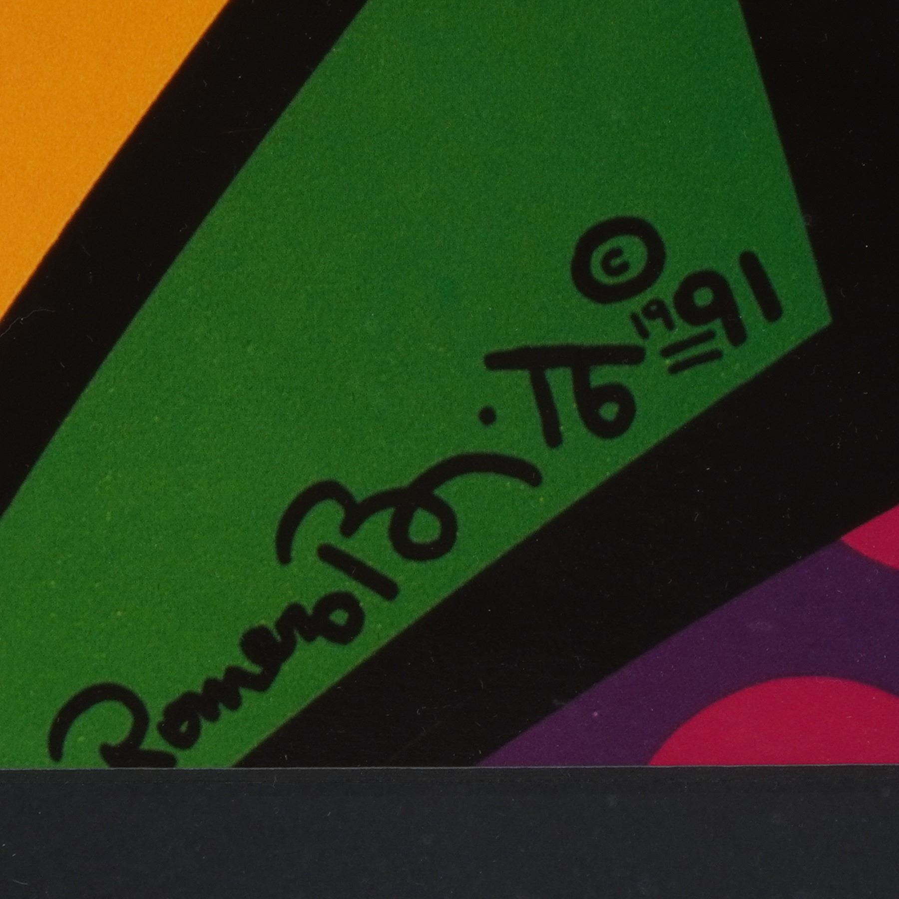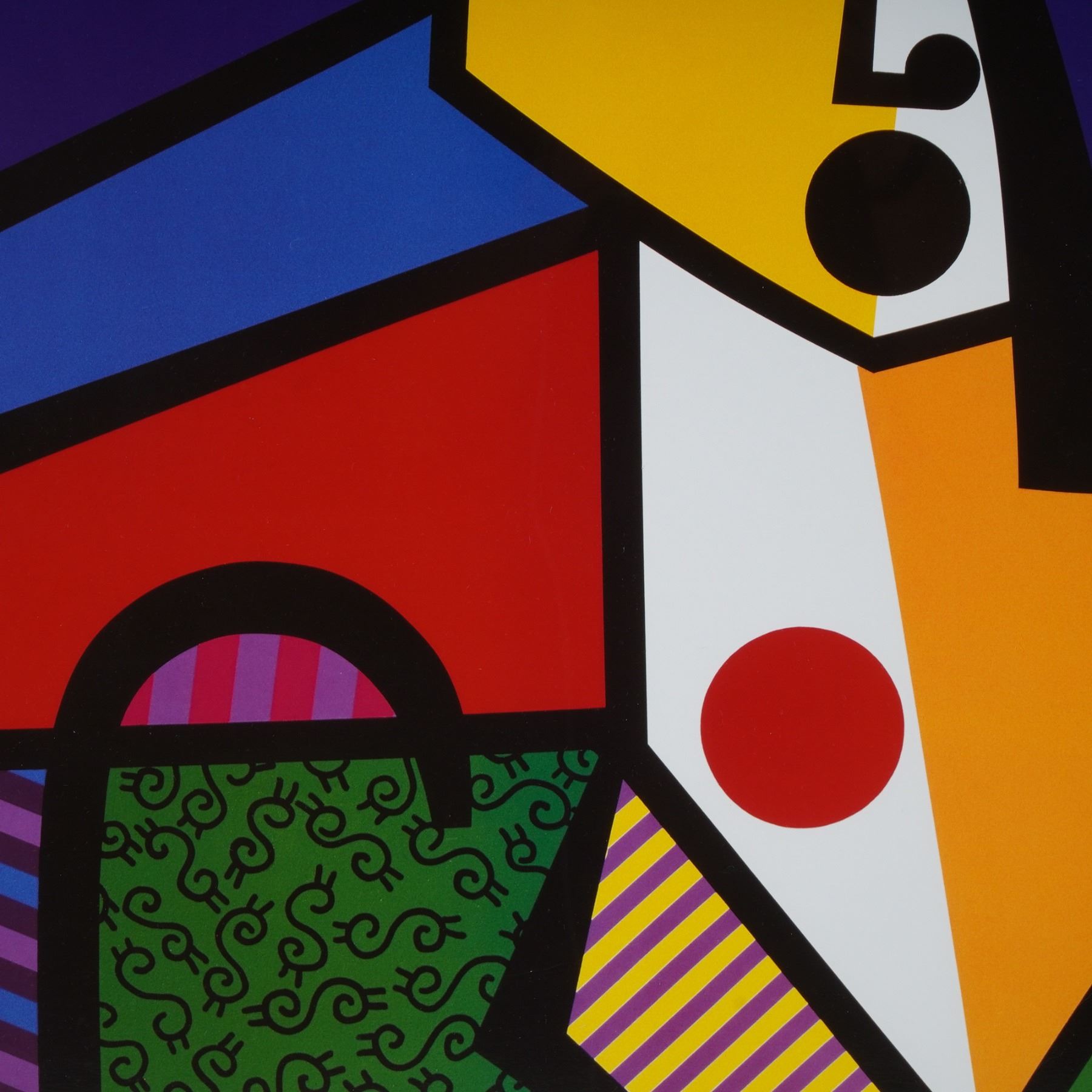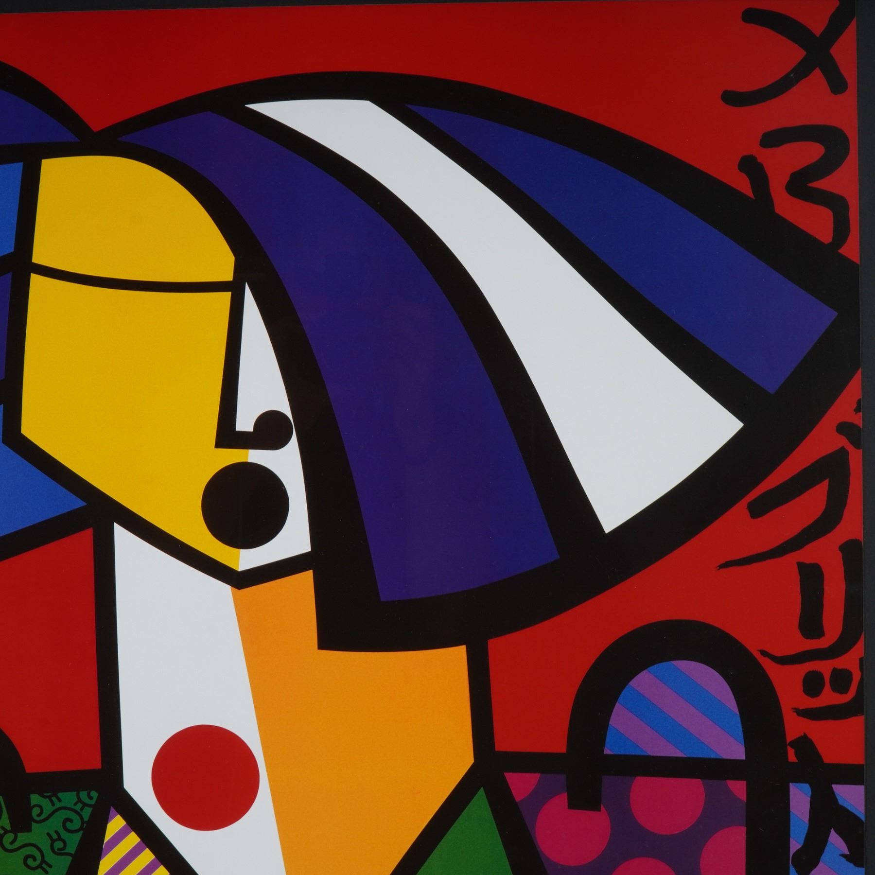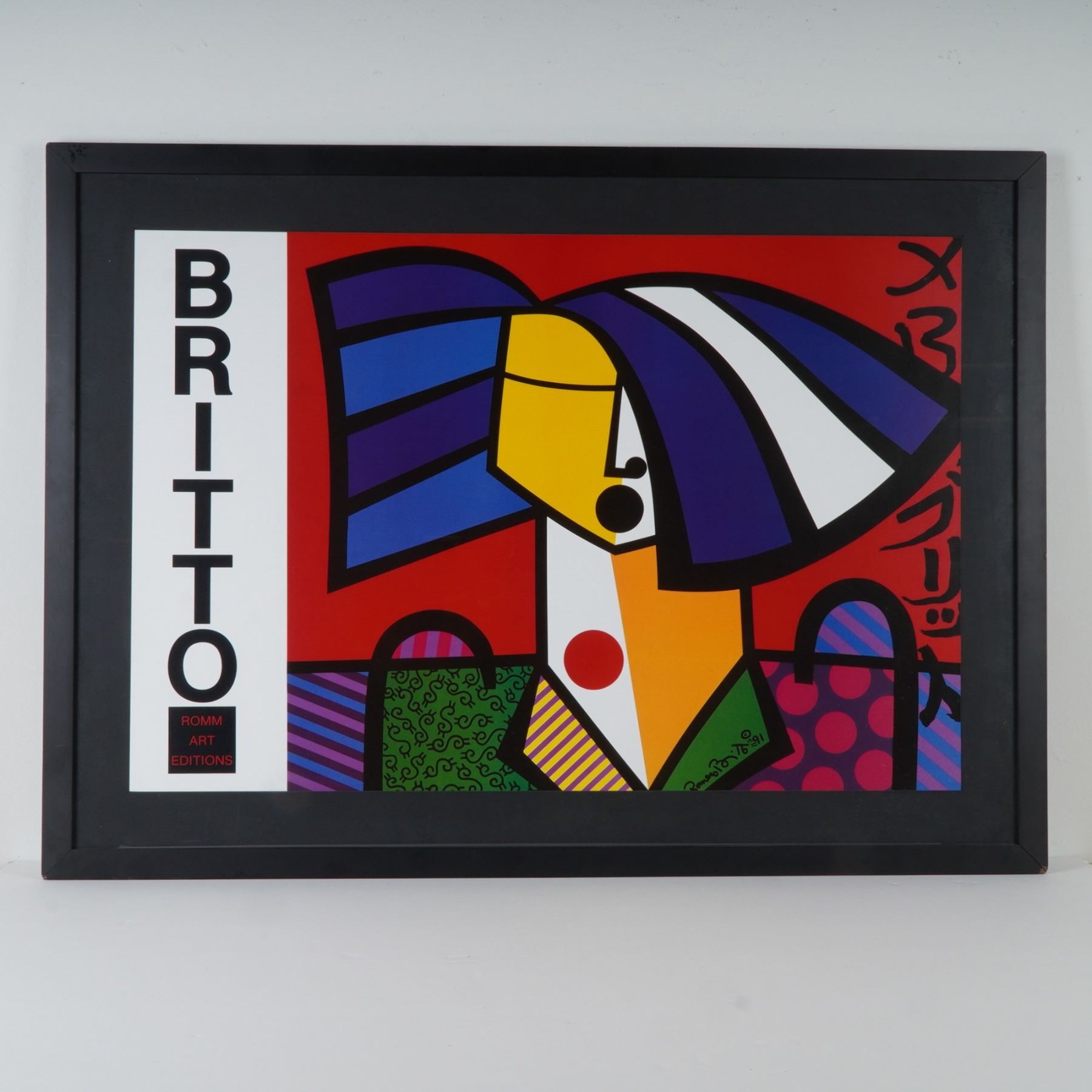 Vibrant and iconic serigraph on paper after celebrated Brazilian artist Romero Britto, titled Japanese Woman, published by Romm Art Editions. This striking composition features Britto's signature pop-cubist style, blending bold geometric forms, saturated color fields, and dynamic black contour lines to create a joyous, modern interpretation of a stylized female figure. The artwork masterfully fuses elements of Cubism and Pop Art, rendered in vivid blues, yellows, reds, and greens, punctuated with playful patterns and rhythmic design. Professionally framed and ready to hang, this piece exemplifies Britto's optimistic and instantly recognizable aesthetic, celebrating color, movement, and emotion in perfect harmony. Signed and dated in the plate at lower right.
