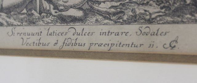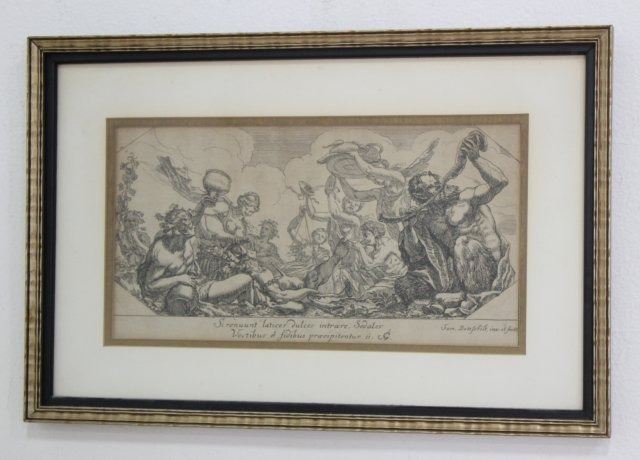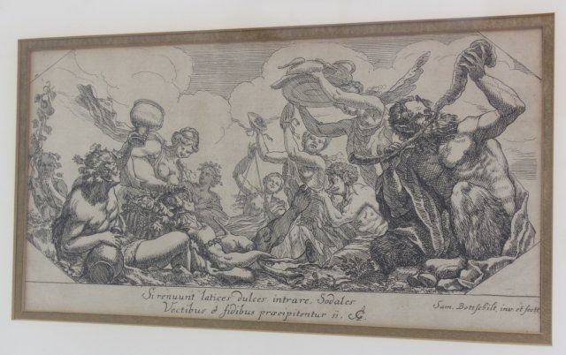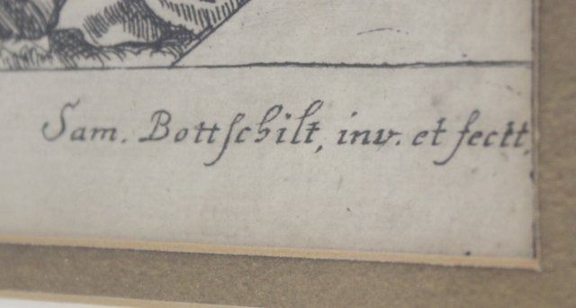 17th/18th century. Germany. Approx. 6 1/2" H x 12" W sight, 12" H x 17 1/2" W framed. (6093)