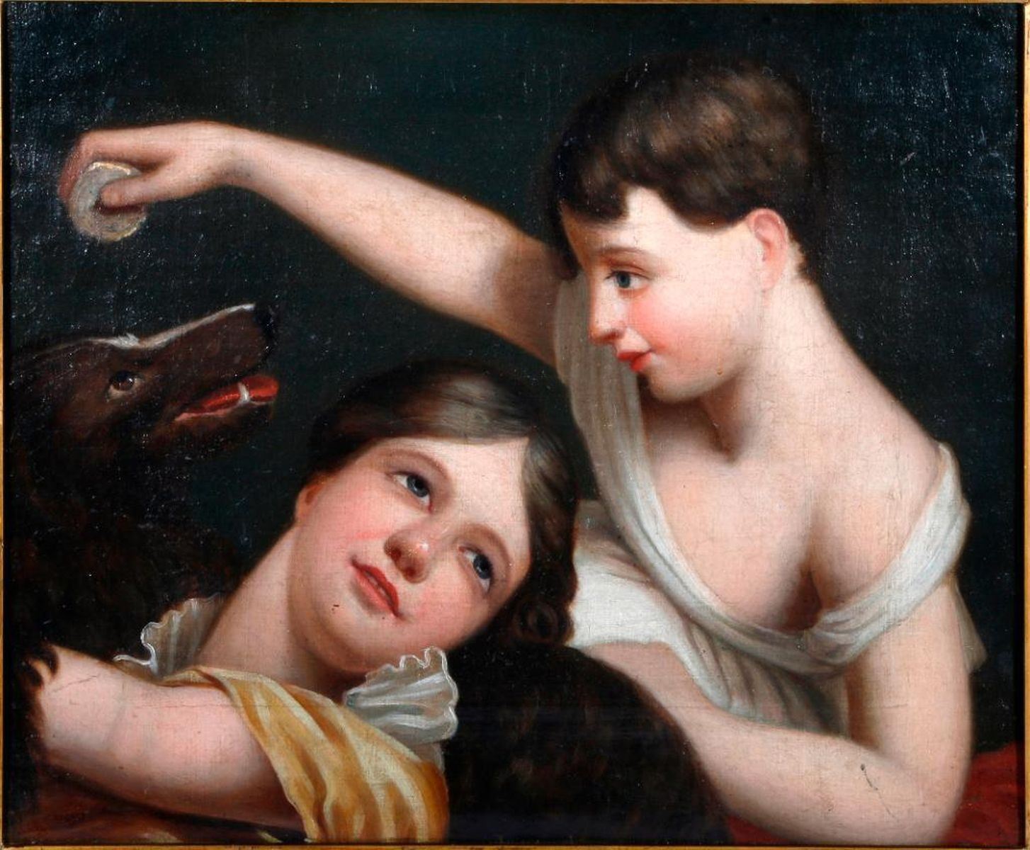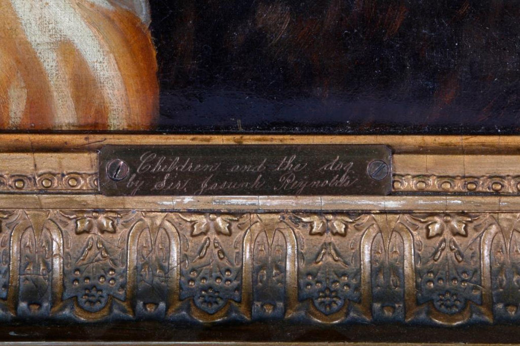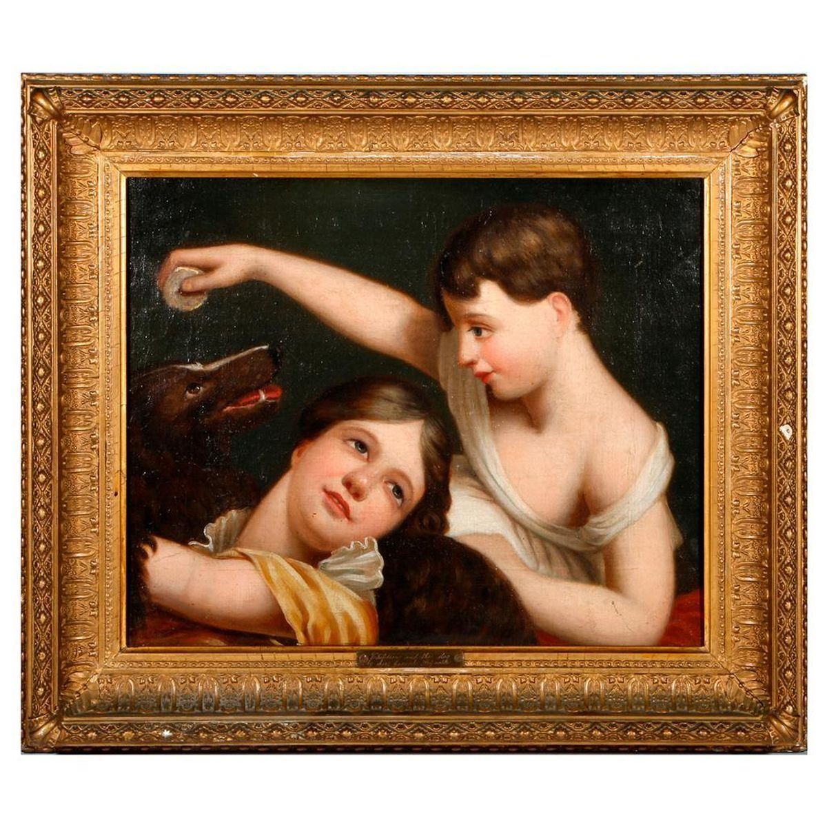 Artist: After Sir Joshua Reynolds. Title/Subject: "Children and the Dog". Signature: None. Medium: Oil on canvas. Size image: H - 14" W - 17". Size frame: H - 19 1/2 " W - 22 1/2". Created: 19th century. Condition: Good, frame slightly chipped.