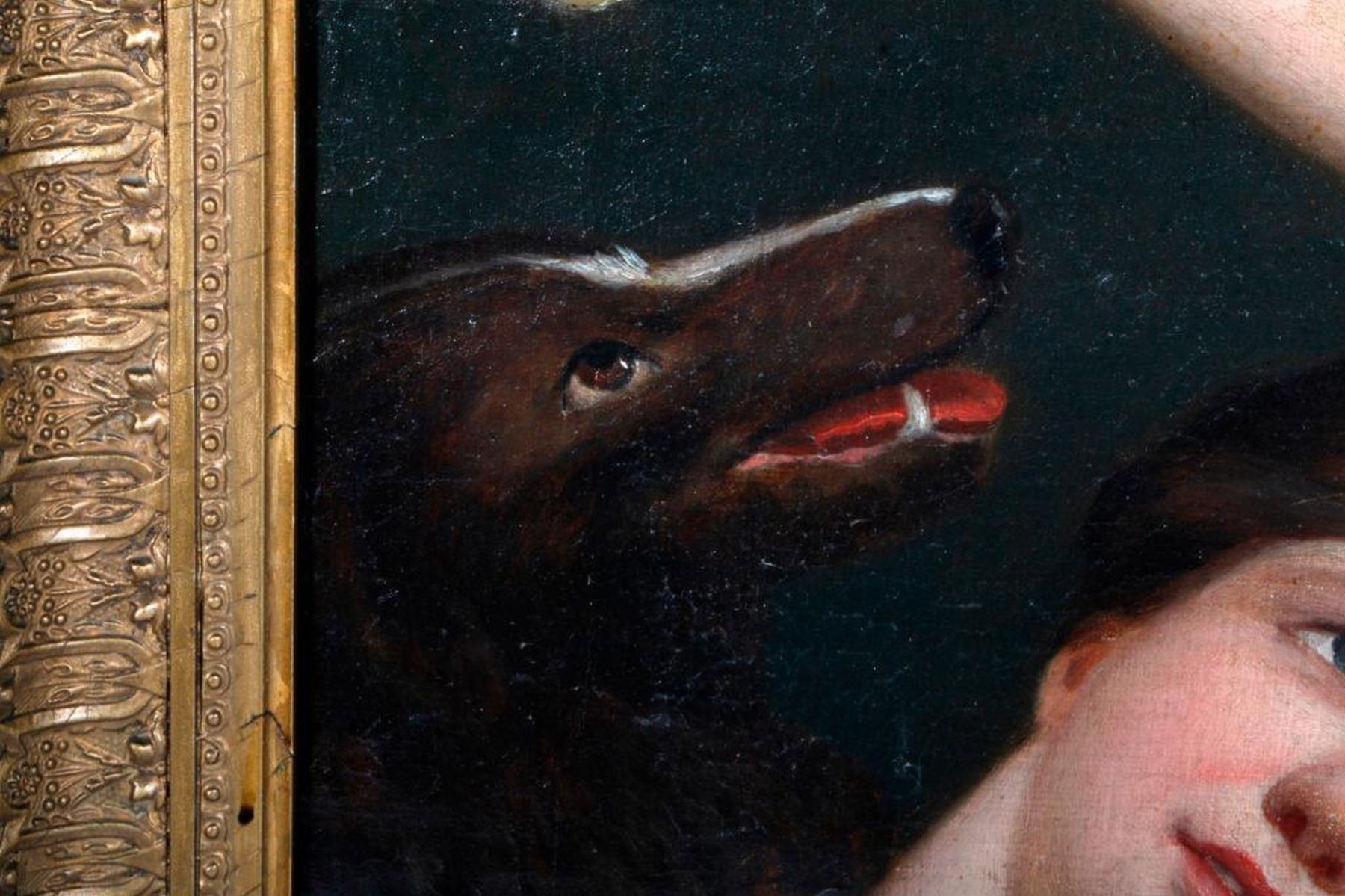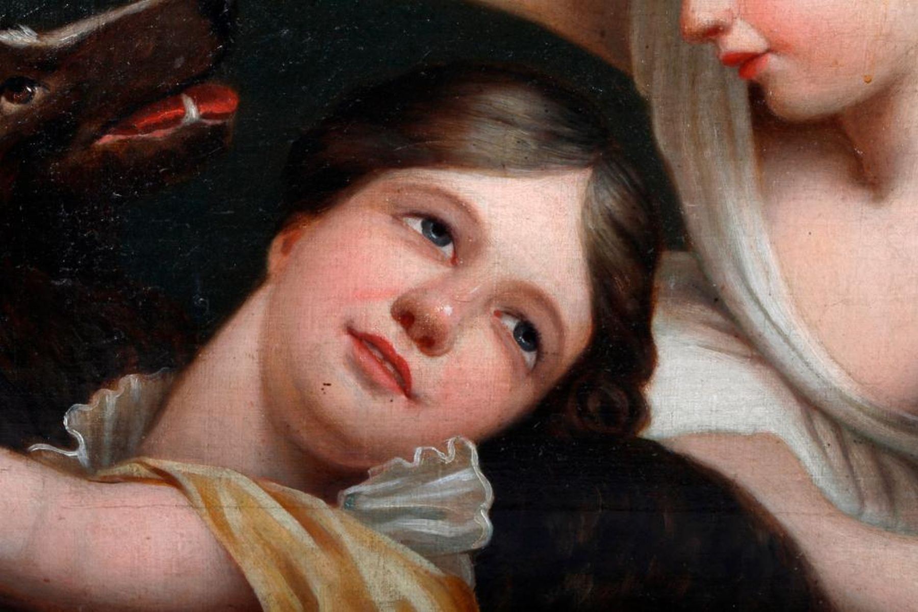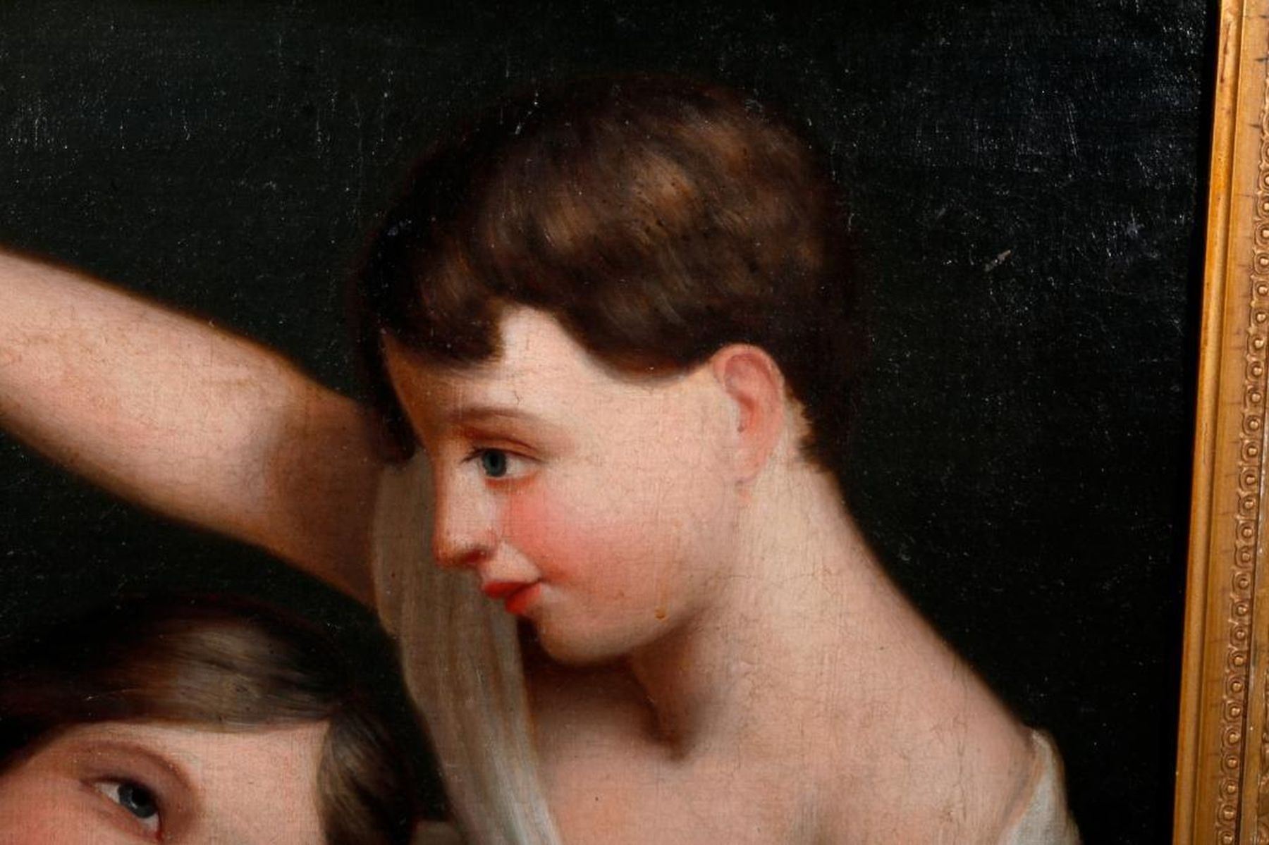 Artist: After Sir Joshua Reynolds. Title/Subject: "Children and the Dog". Signature: None. Medium: Oil on canvas. Size image: H - 14" W - 17". Size frame: H - 19 1/2 " W - 22 1/2". Created: 19th century. Condition: Good, frame slightly chipped.