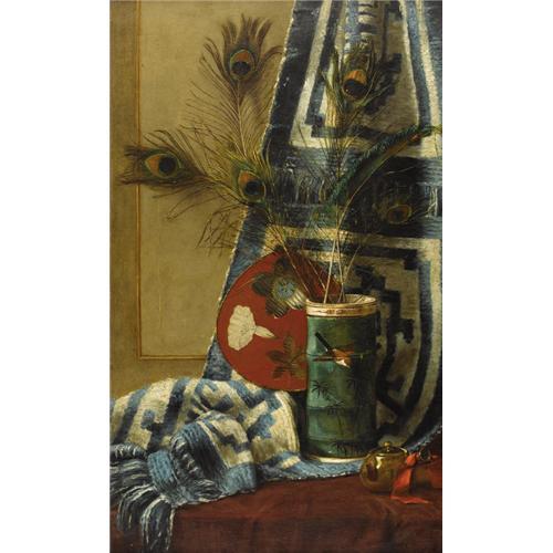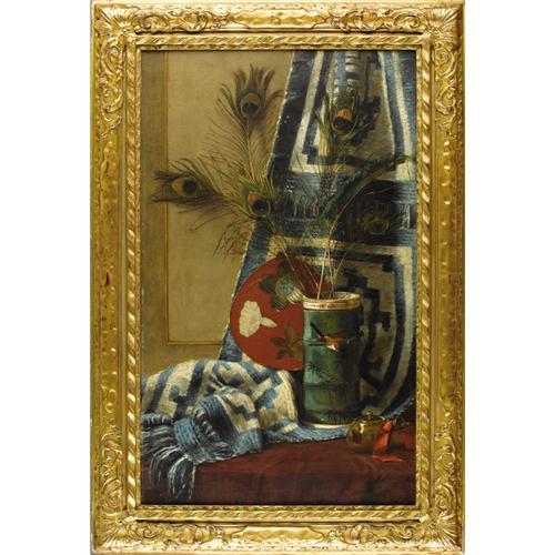 <B>Manner of WILLIAM MERRITT CHASE</B></I> (American 1849-1916)<BR><I>Still Life with Peacock Feathers</B></I><BR>Oil on canvas<BR>36 x 22 inches (91.4 x 55.8 cm)<BR>With signature lower right and dated: <I>Chase 89</B></I><BR><BR>Provenance:<BR>Private collection (Glendora, California) <B>Condition Report:</B> Normal signs of wear as appropriate with age, relined and with masking varnish and some scattered strengthening, colors remain vibrant and detail strong<BR><BR><b>Shipping:</b> Requires 3rd Party Shipping (<a target="_blank" href="http://www.heritageauctions.com/common/shipping.php">view shipping information</a>)