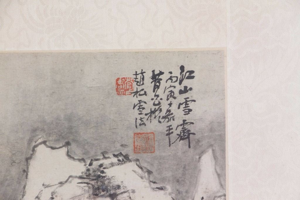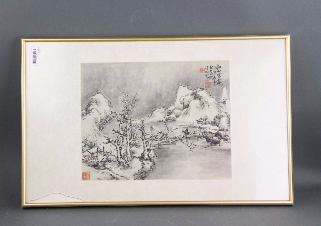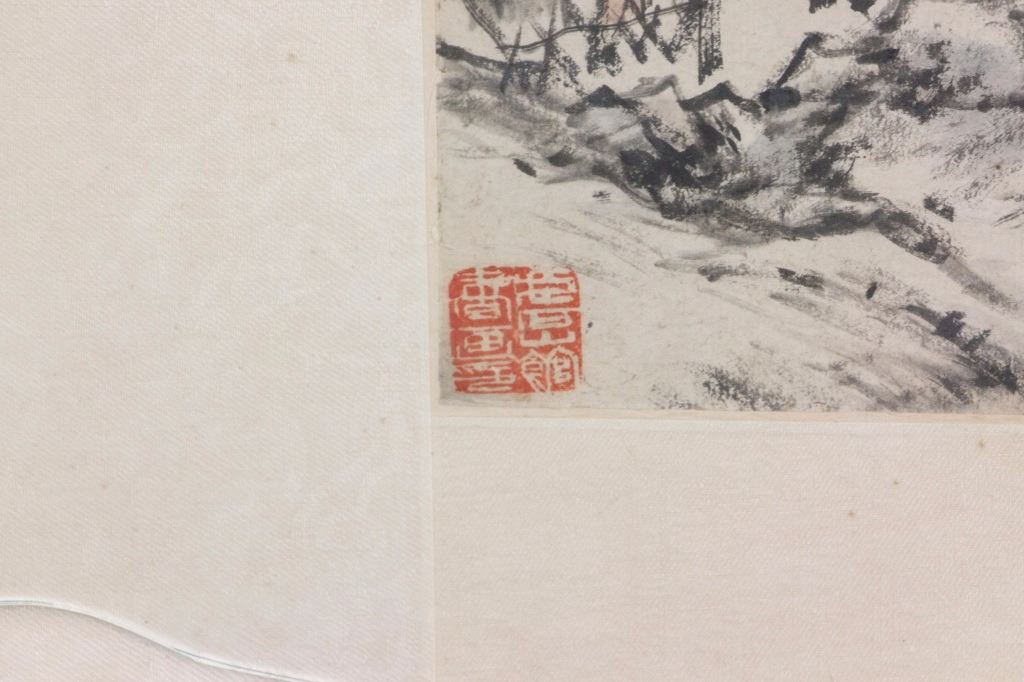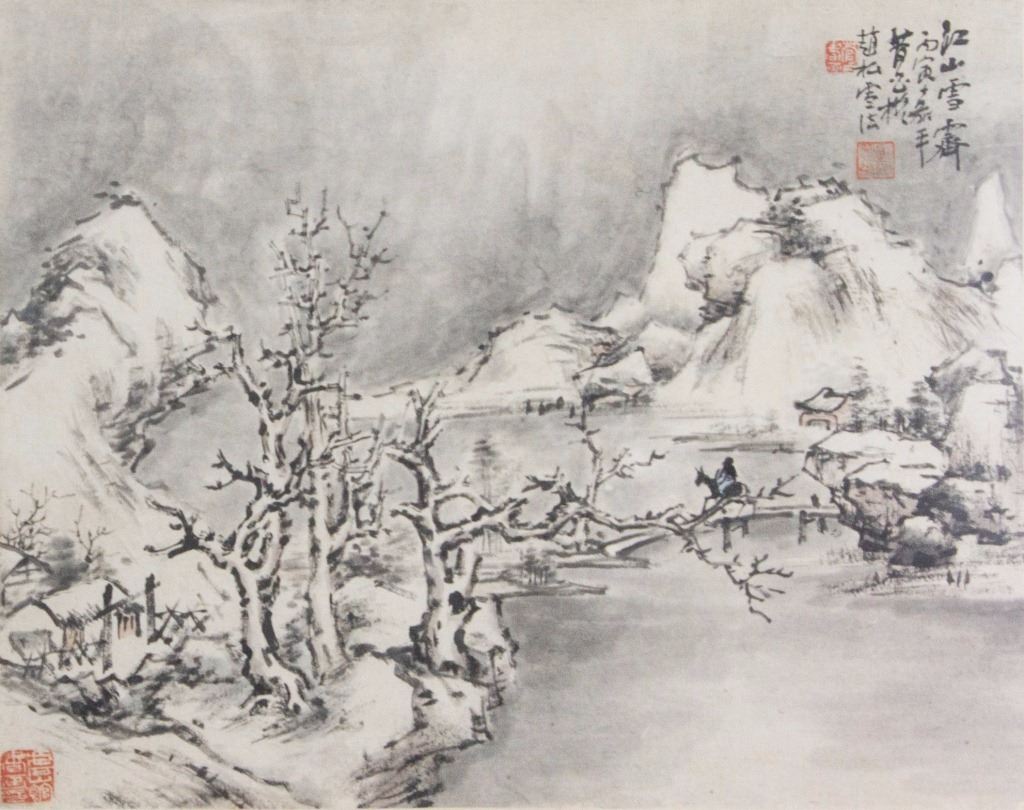 Mountainous landscape in winter; Chinese in and watercolour on paper; framed; signed Zhao Mengfu (1254-1322); inscribed with 3 artist seals; republic period; 26.5 cm x 33.5 cm