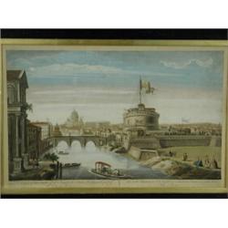 SIX 18TH CENTURY COLOURED PRINTS OF ROME, VERSAILLES, MARLI, ST JAMES PARK, WESTMINSTER BRIDGE AND RICHMOND