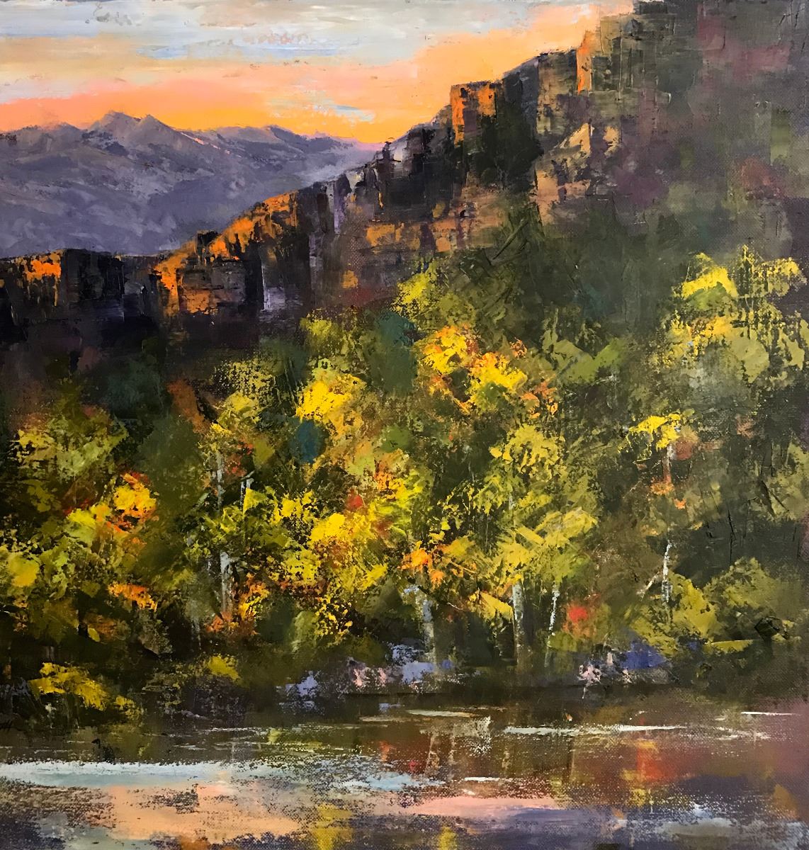 Artist: Bonnie Griffith. Title: Afterglow. Medium: Oil and cold wax on canvas. Size: 20" x 20". Framed size (if applicable): 26" x 26" Artist's description: Using oil and cold wax medium with a palette knife, layer and top of layer, the image of the Colorado River in Southern UT emerges. There is that warm glow of the evening light reflecting off the face of the cliffs and reflecting in the water below water below that makes me paint this area again and again; both in Plein air and in studio. Shipping from ZIP CODE 83646.