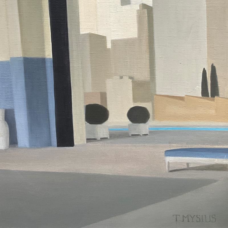 "Afternoon Shadows" is an original oil painting on canvas by Thierry Mysius, hand signed by the artist. This piece comes framed. Includes Letter of Authenticity. Measures approx. 30" x 46" (frame), 24.5" x 31" (image). There is some wear on the frame and some minor flaws on the canvas (small scuffs on the top and bottom left corners and the canvas is loose/wavy on the top corners).