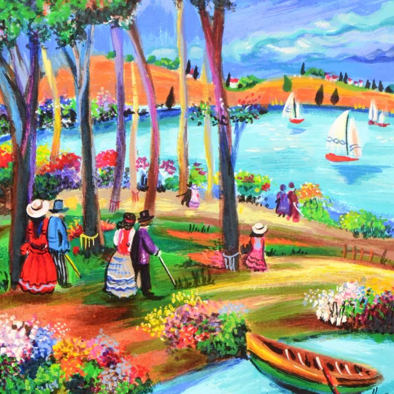 "Afternoon Stroll" is a limited edition serigraph on paper, numbered hand signed by Shlomo Alter. Includes Certificate of Authenticity. Measures approx. 13" x 15.5" (with border), 11.5" x 14" (image).