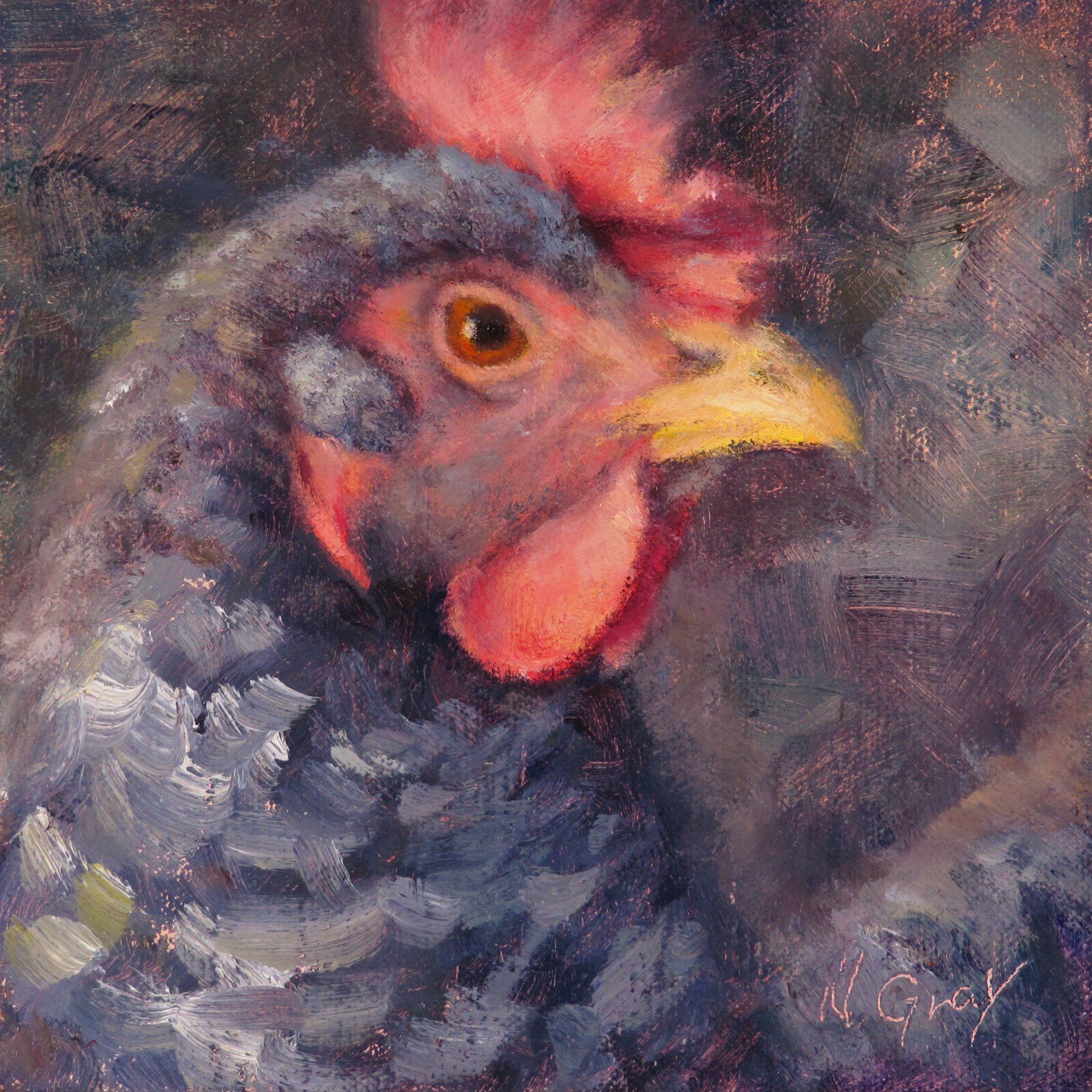 Artist: Naomi Gray. Title: Afternoon Tea with Kiki the Chicken. Artwork size: 6" x 6". Frame: 12" x 12". Medium: Oil. Artist's description: Kiki is one of our pet chickens, and I have painted her many times. I also train her to do some tricks, such as spinning and ringing a cow bell. After growing up with many other pet chickens, I realized that the chickens can be great companions. They are also quite intelligent and have feelings. Kiki has her own unique personality, as well as grace. Because her comb stands out and looks like a crown, I call her "Princess Kiki." I enjoy sharing my perspective of the chickens through my art.