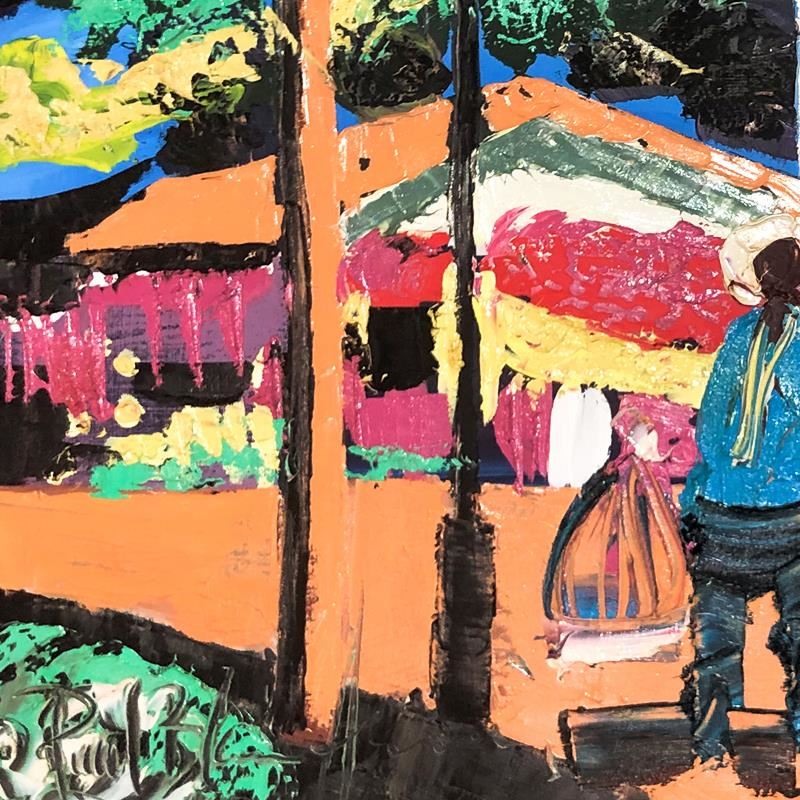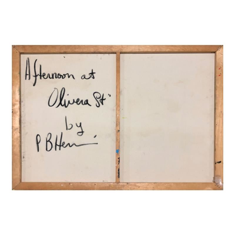 "Afternoon on Olivera St" is an original oil painting on stretched canvas by Paul Blaine Henrie (1932-1999). The piece is hand signed by the artist and comes with a letter of authenticity. Please note that due to the age of this piece and the way it was stored, there are minor sings of wear, particularly on the corners and edges. Measures approximately. 30" x 40" (image).