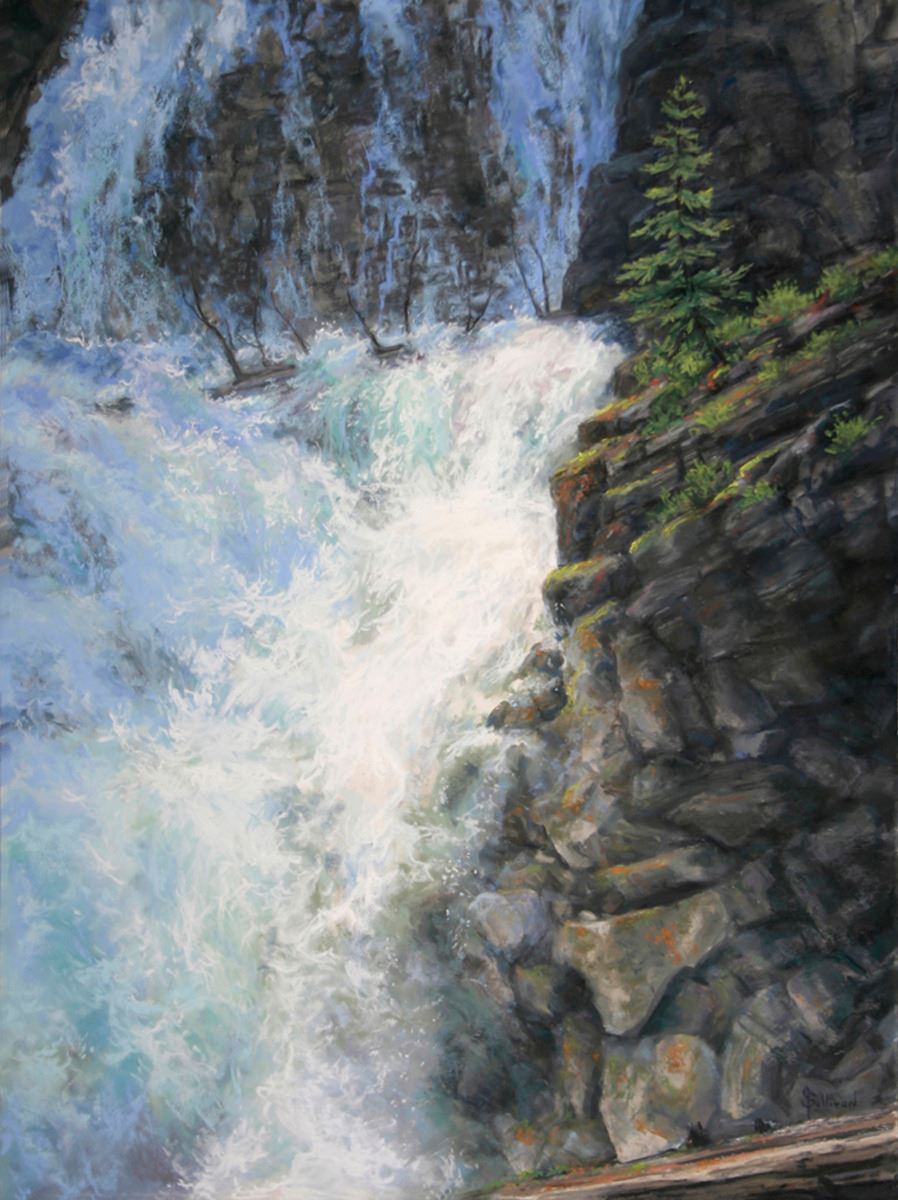 Artist: Janet Sullivan. Title: Against All Odds. Medium: Pastel. Size: 18" x 24". Framed size (if applicable): 24" x 30" Artist's description: Life seems to survive the elements. One small tree seed was forced into a rock crack from this powerful waterfall. When the sun’s ray’s heated the dark rocks the seed sprouted. The strong roots found their way through the cracks in the rocks and created a strong bond to withstand the tremendous force of the waterfall. The roots crack open the rocks. A root one inch wide can move a multi-ton rock slowly as it grows and expands. Wind, water and leaves will bring nutrients to form soil for the tree and for other plants to become established.