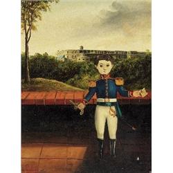 Agapito Labios (Mexican, 1898-1996), “Portrait of a Boy”, c. 1960; oil/canvas, 24” x 18”, signed. Labios was self-taught , and was actually recognized as an artist for paintings he did on his jail cell wall while imprisoned for his participation in the Mexican Revolution. He later had a shop called Mercado de Artesanias at La Ciudadela in Mexico City. He painted portraits in a traditional style, similar to those done before photography, which are both representational and narrative.