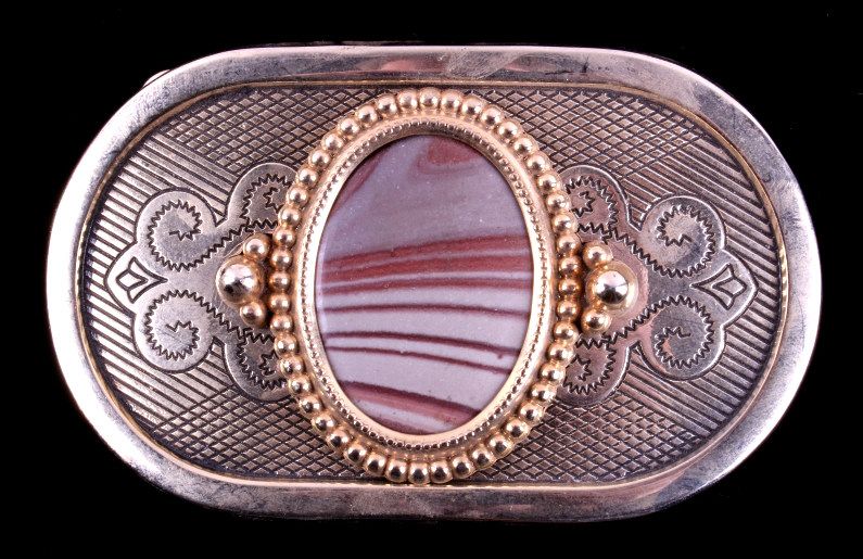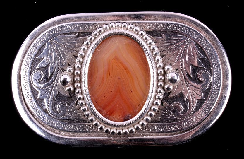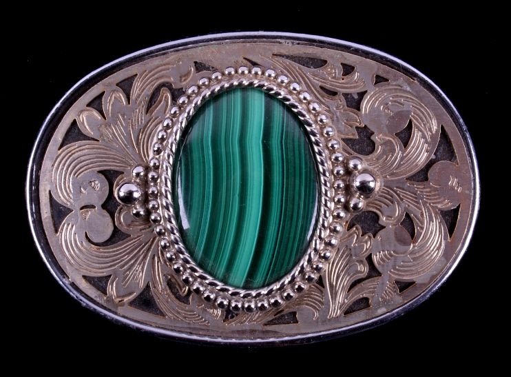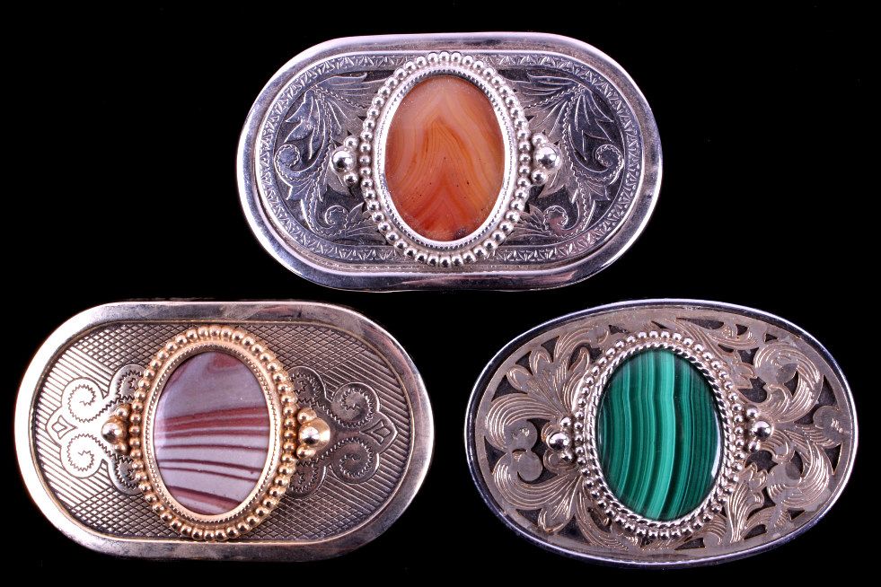 This is a collection of three agate belt buckles. Each buckle features a unique polished agate stone in the center of the buckle. All three buckles are in very good condition. They measure 2.25" x 3.5".