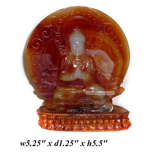 This Buddha meditation agate display is carved with a moon plate at the back. Also, there is a Chinese character " Buddha " engraved at the backside too. It is a good small size desk top meditation Buddha for home or office.
