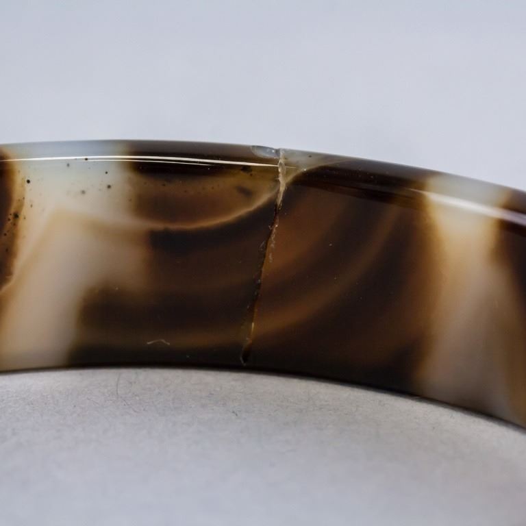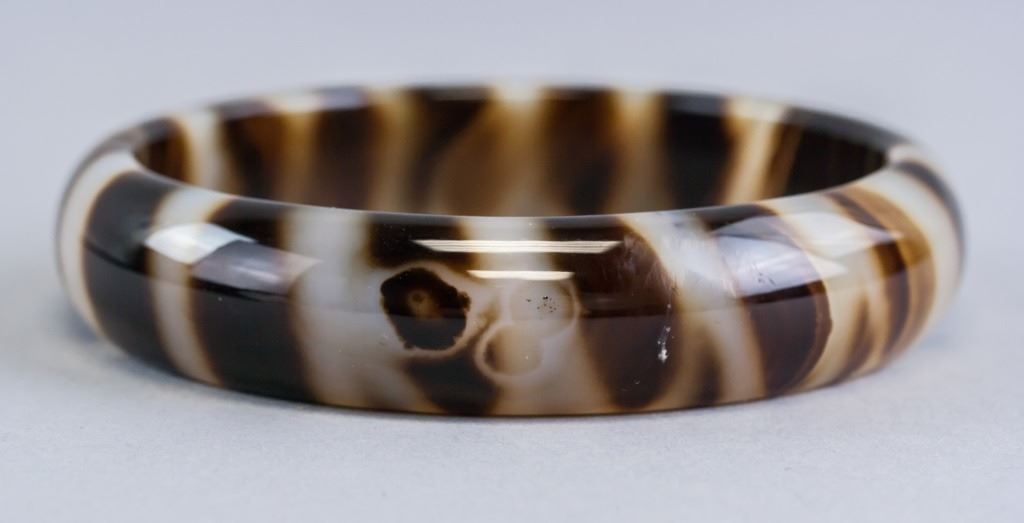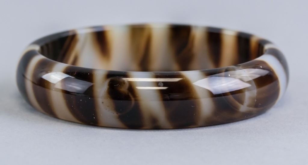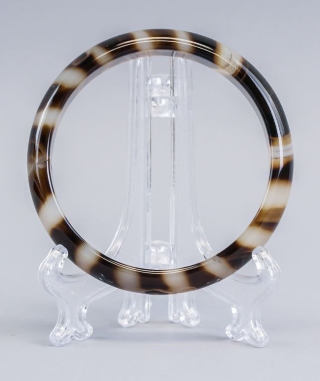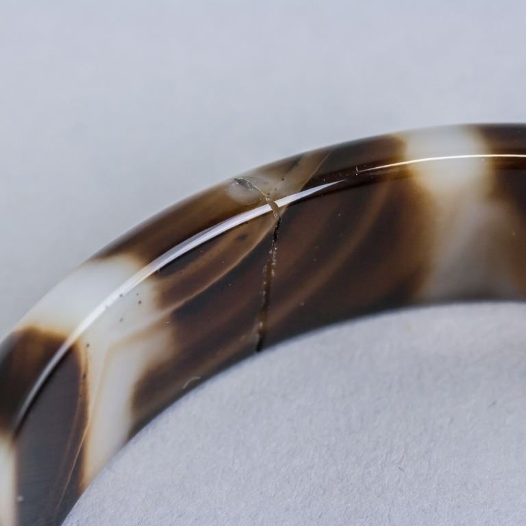 Agate bangle Of brown and white tone. Of flat inside and rounded outside. Inner diameter: 7 cm. Outer diameter: 9 cm. 74 grams.