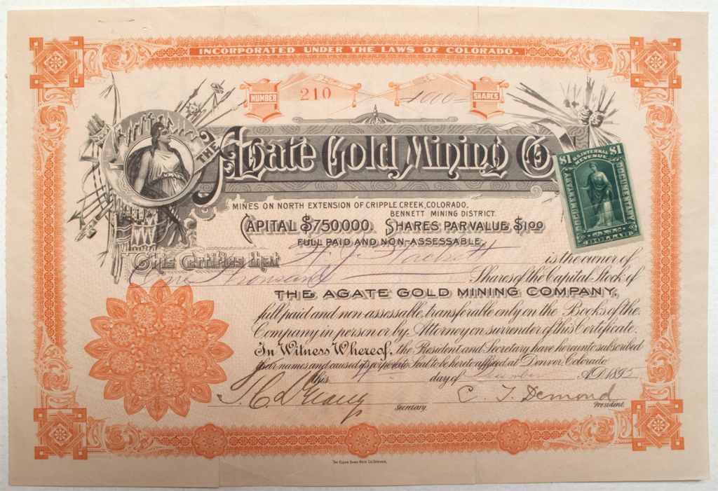 Bennett Mining District. Incorporated in Colorado. Cert. #210 issued to H.J. Hackett for 1000 shares. Signed by C.T. Demond, president, and T.C. DeNally, secretary. Indian theme vignette, orange border and safety print. U/C. Printer: Elgan BNCo., Denver. A single $1 green adhesive documentary revenue stamp at right, imperf. Fold creases. An early and rare certificate. VF. City: Cripple CreekCounty: TellerState: CO