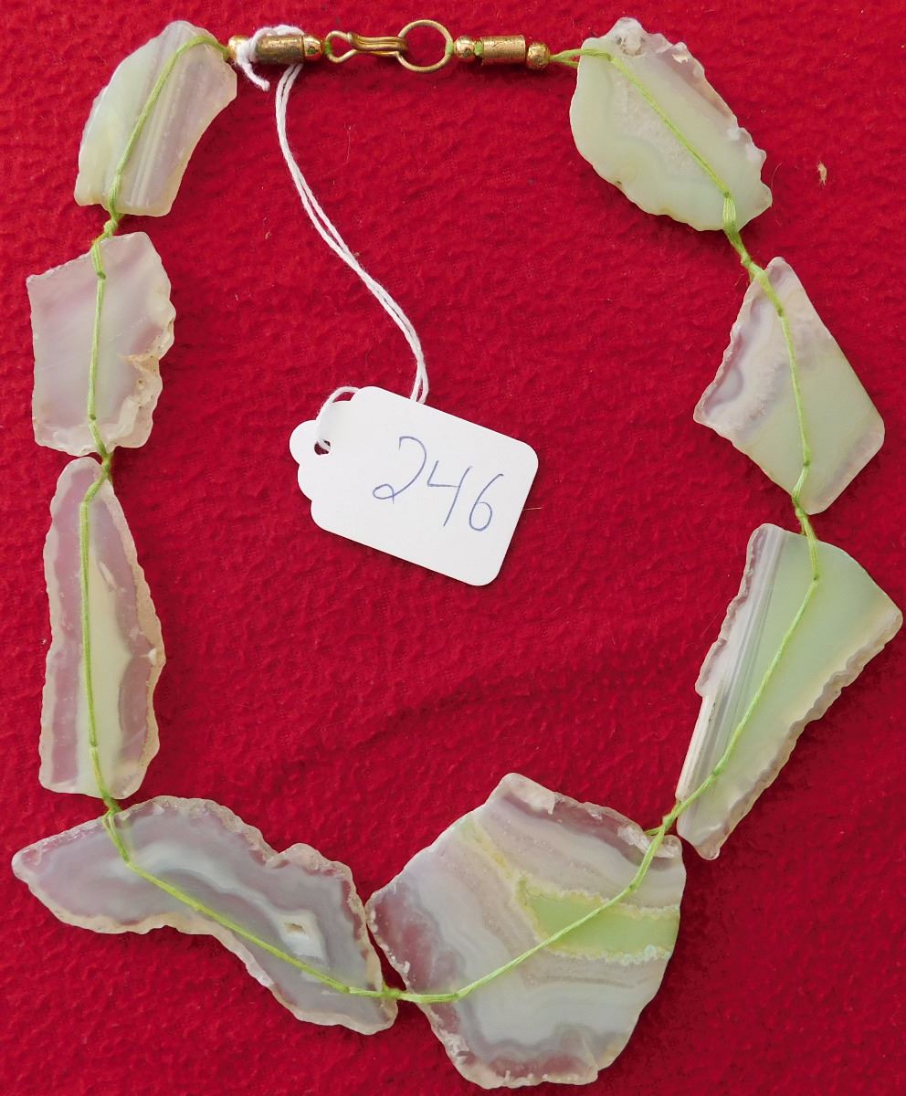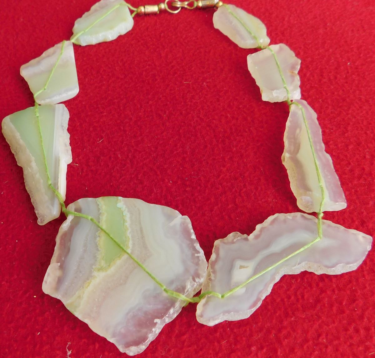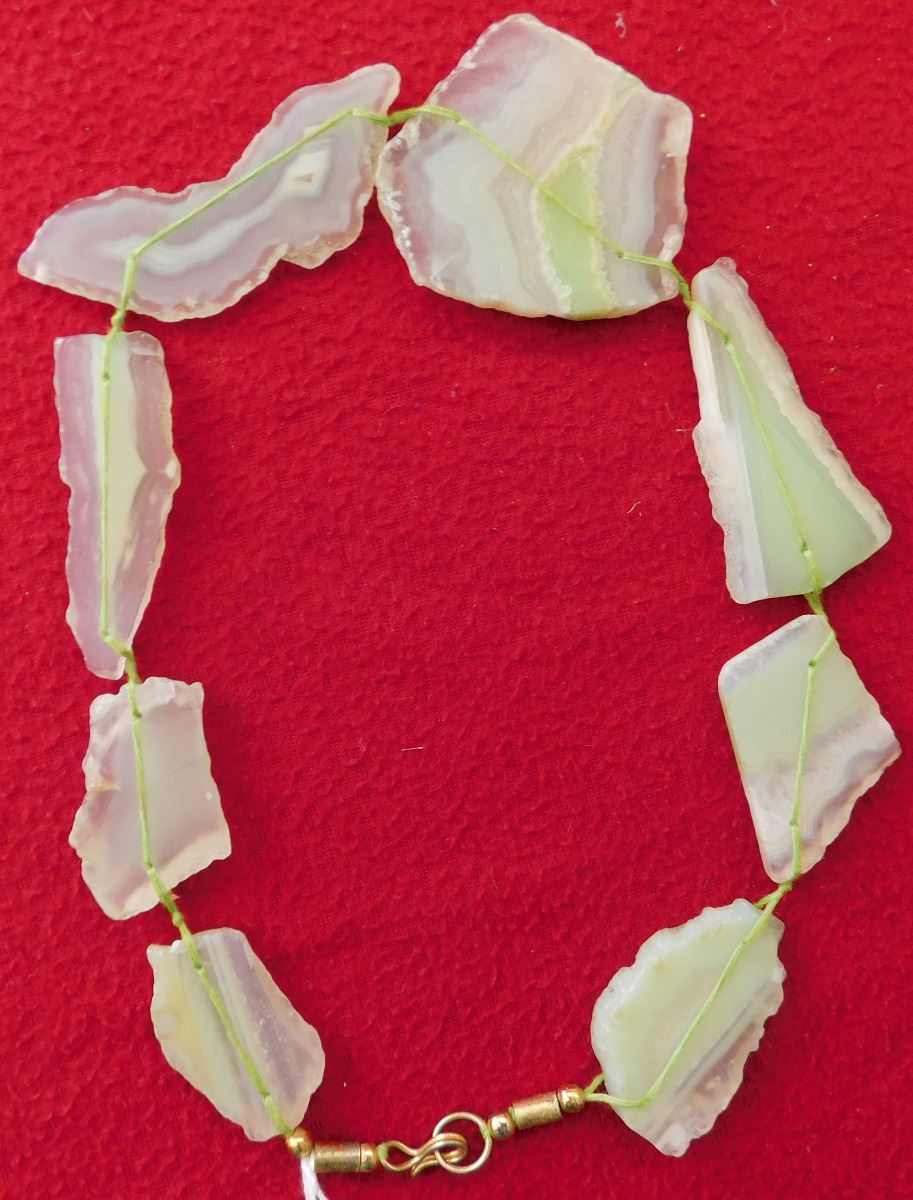 Agate Slab Necklace, circa 1990s. Made of agate and brass fittings, the item is 18" long. From the Southwest, USA. Light green agate! Condition: Good, see images. Shipping: $18.50 w/insurance and signature.