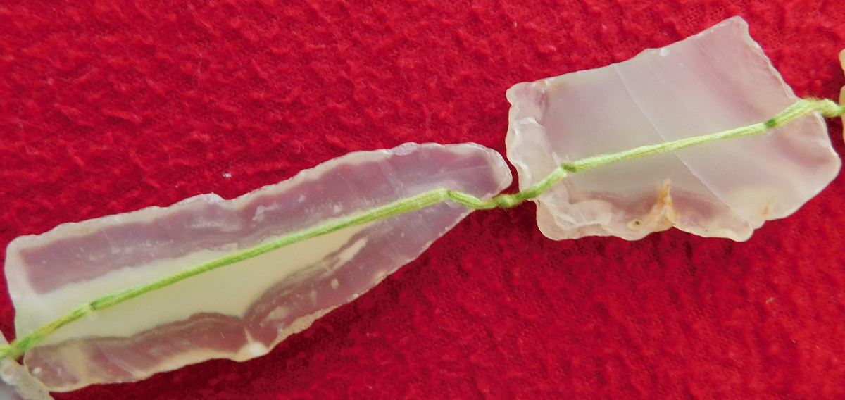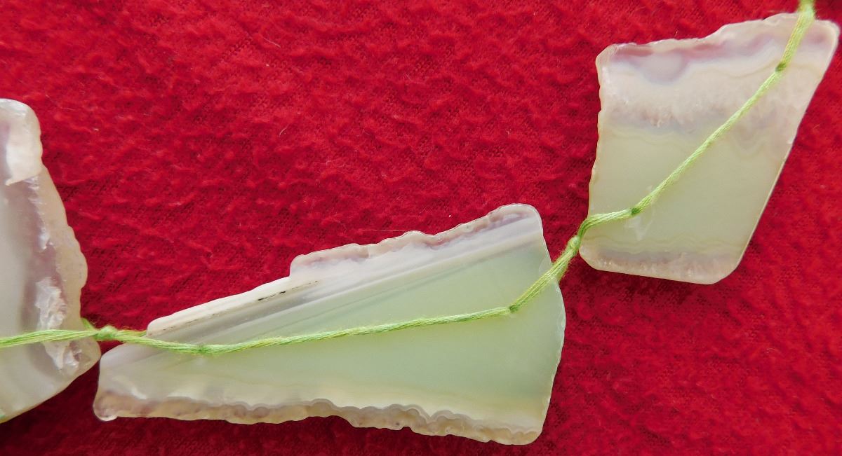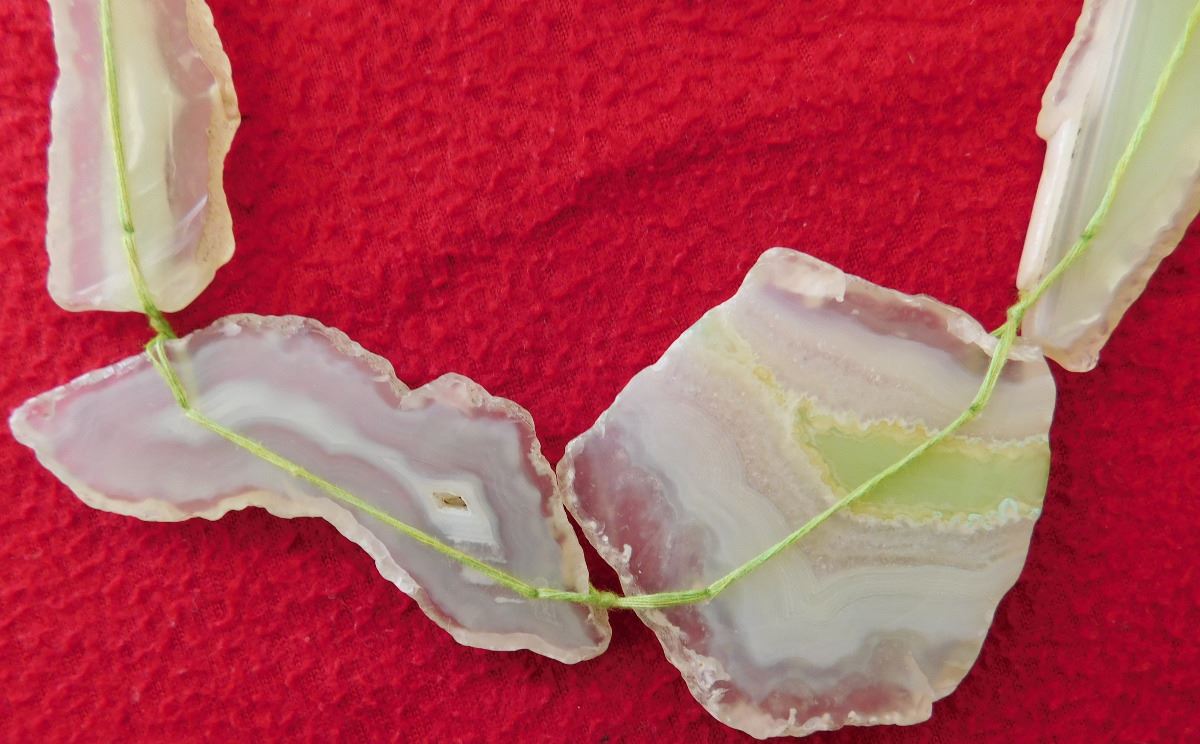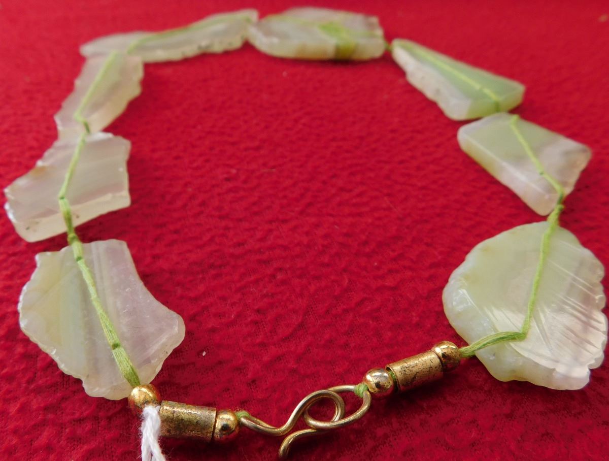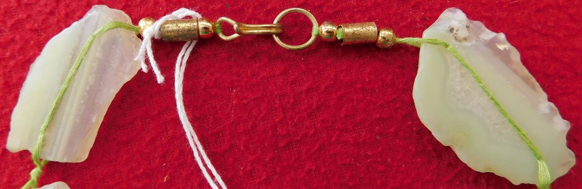 Agate Slab Necklace, circa 1990s. Made of agate and brass fittings, the item is 18" long. From the Southwest, USA. Light green agate! Condition: Good, see images. Shipping: $18.50 w/insurance and signature.