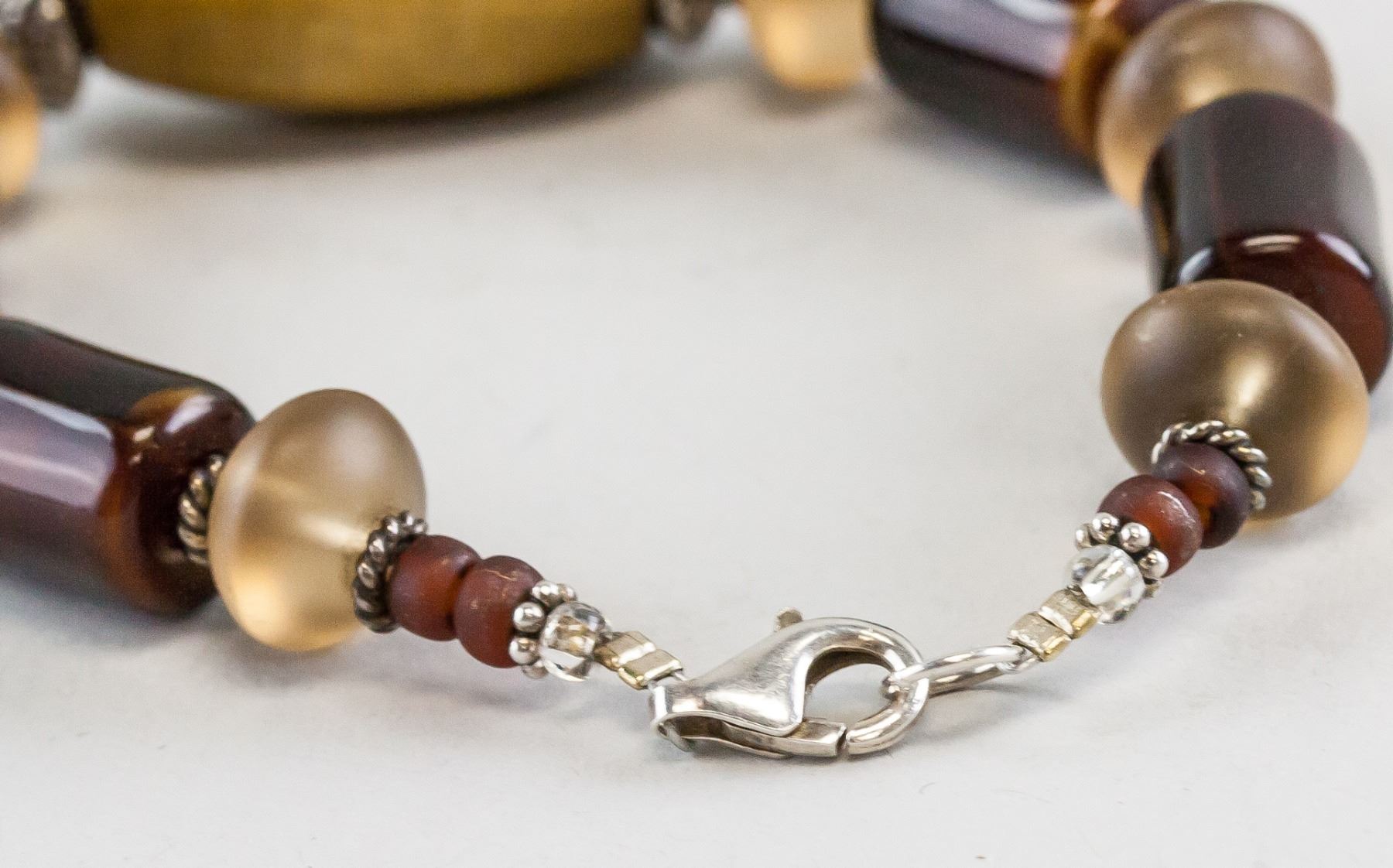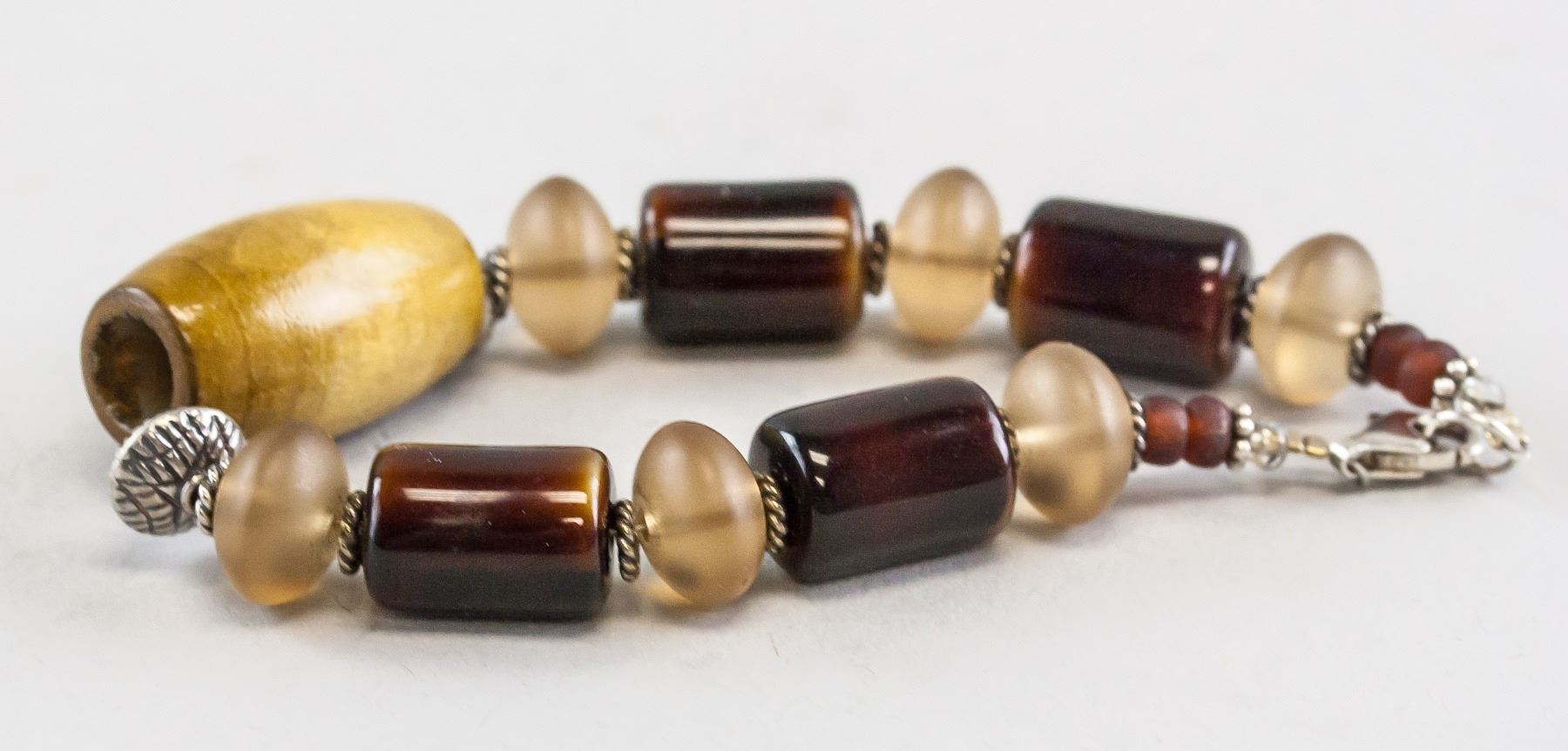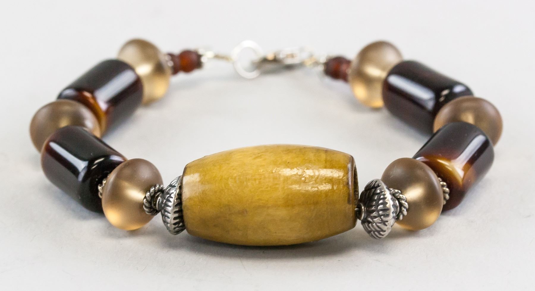Agate bracelet. Of assorted shaped beads. Silver bail ring. 18 x 1.25 cm, 22 grams