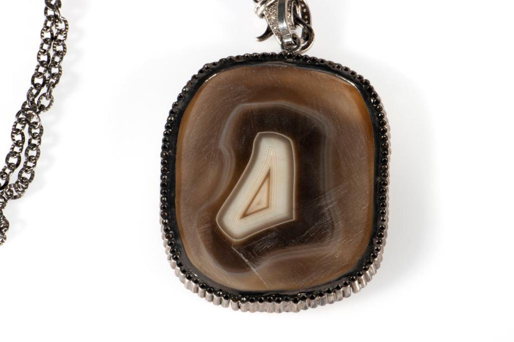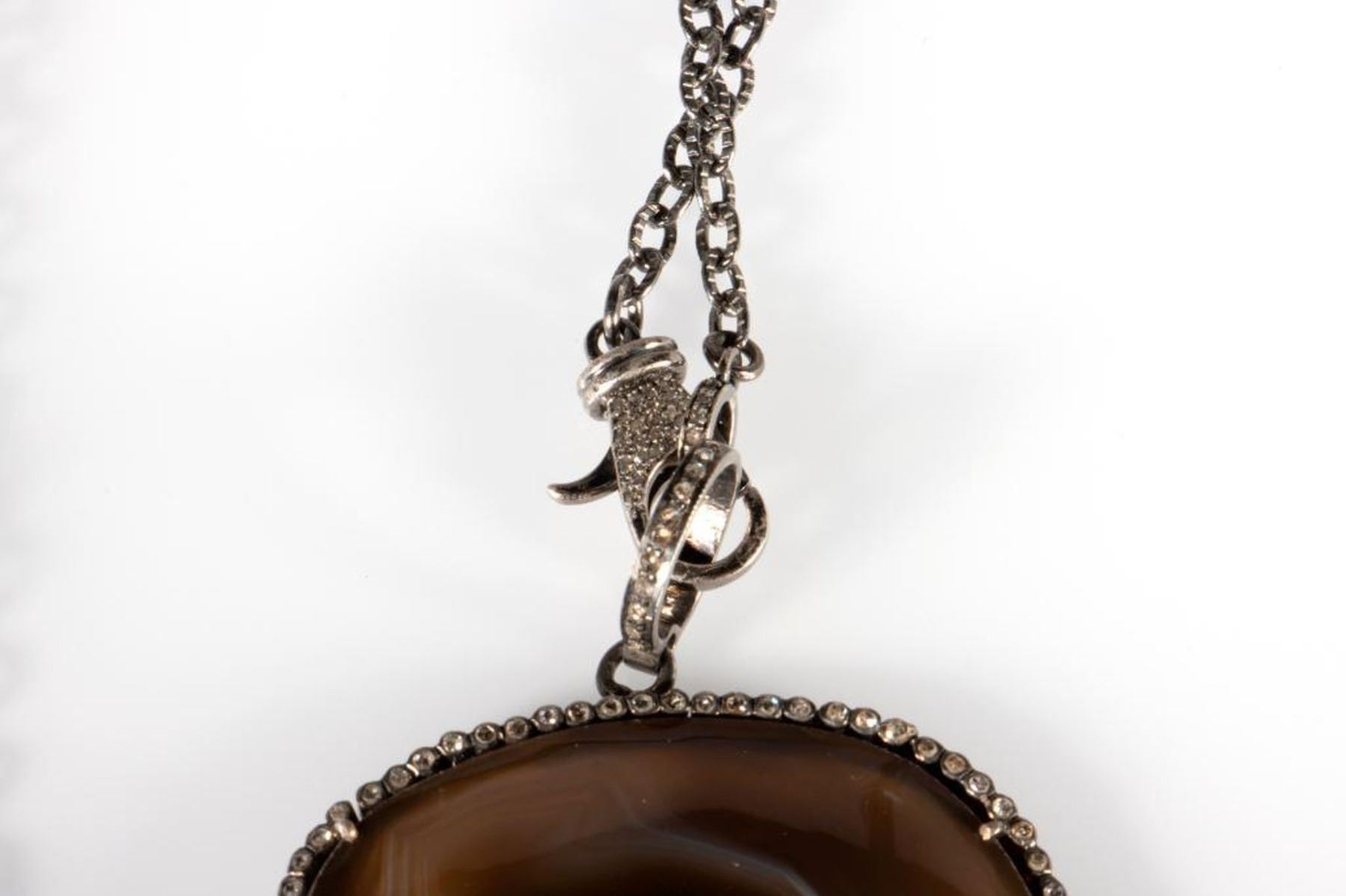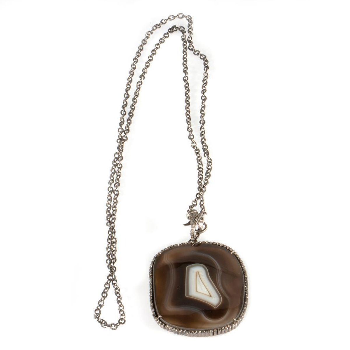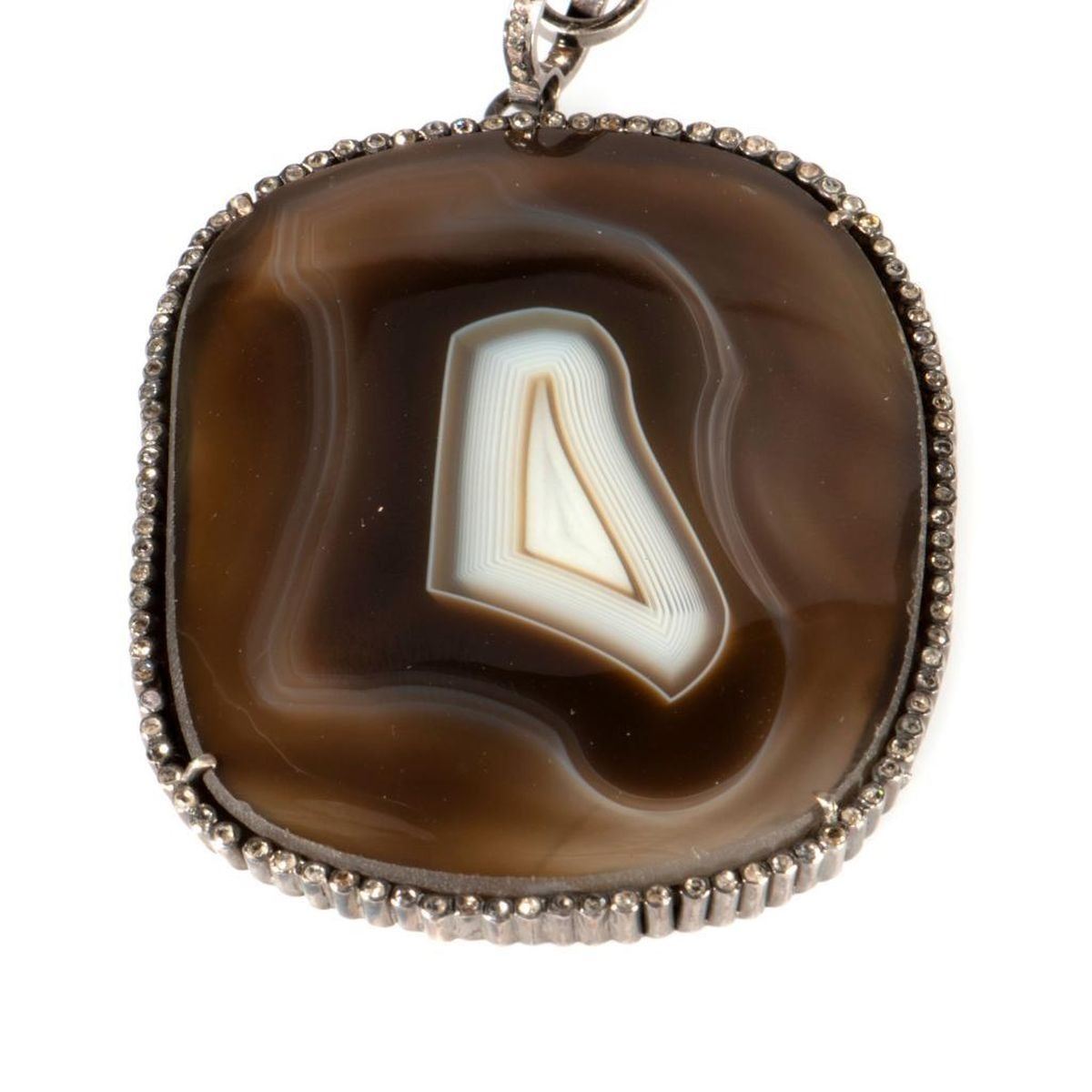 the large, cushion-shaped agate slice is framed with 108 rose-cut diamonds, suspended from a diamond-set, open link chain; length: 36in.; pendant length: 3 1/8in.