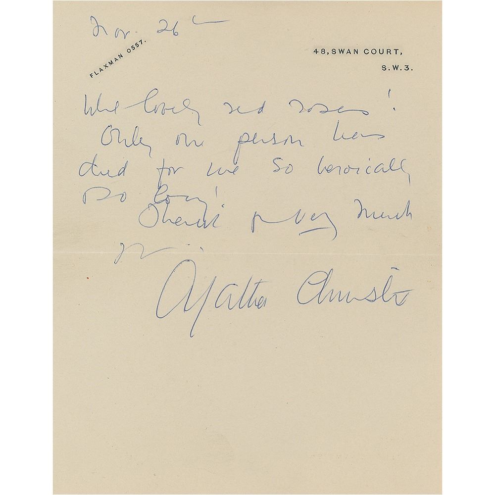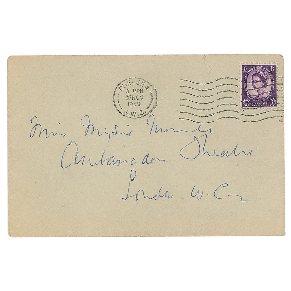 ALS, one page, 5.5 x 7, personal letterhead, November 26, 1959. Short letter of thanks for roses. In full: "What lovely red roses! Only one person has died for me so heroically so long!" In fine condition. Accompanied by the original mailing envelope addressed in Christie's hand.