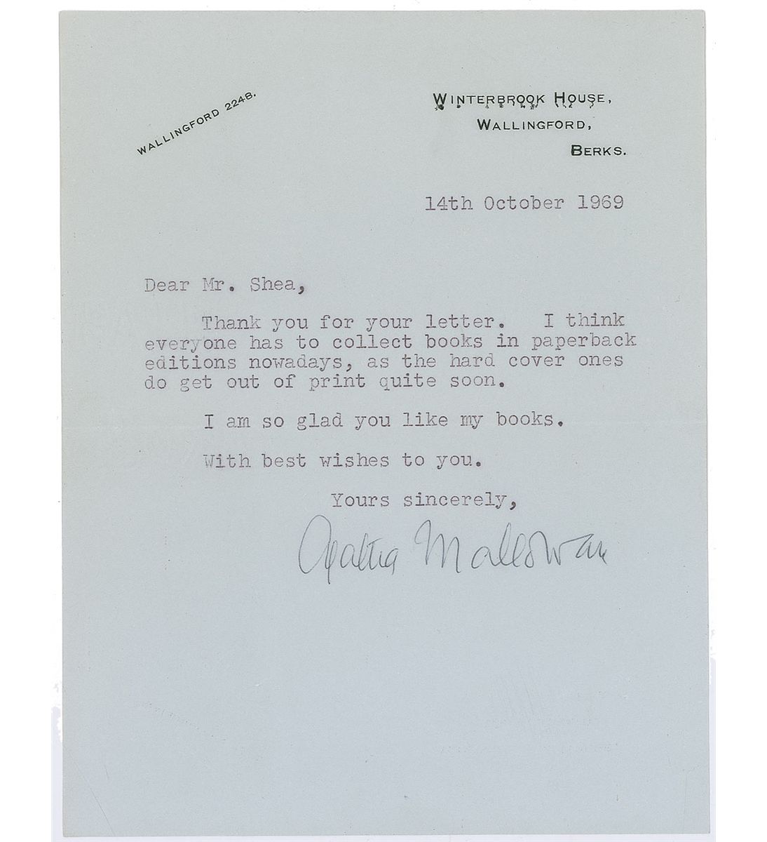TLS signed “Agatha Mallowan,” one page, 5.5 x 7, Winterbrok House letterhead, October 14, 1969. Letter to an admirer. In full: “Thank you very much for your letter. I think everyone has to collect books in paperback editions nowadays, as the hard cover ones do get out of print quite soon. I am so glad you like my books. With best wishes to you.” In fine condition. Accompanied by the original mailing envelope.