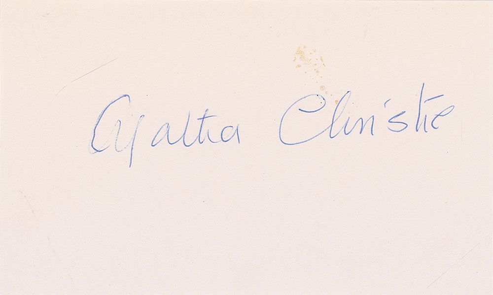 Ballpoint signature, “Agatha Christie,” on an off-white 5 x 3 card. Some light soiling affecting the top of the signature, otherwise fine condition. Accompanied by the original mailing envelope.
