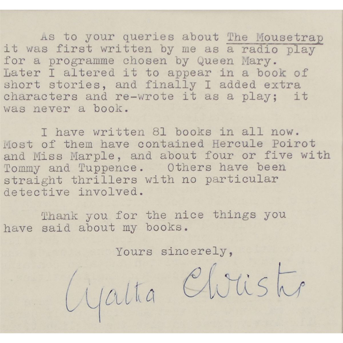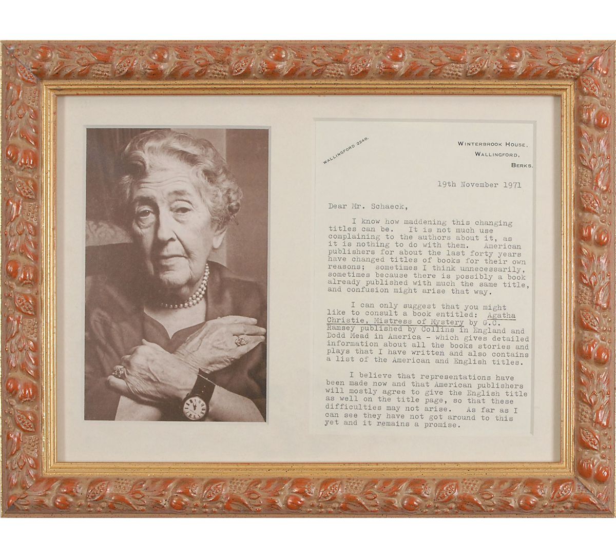 TLS, one page both sides, 4.75 x 7, Winterbrook House letterhead, November 19, 1971. Letter to an admirer. In part, “I know how maddening this changing titles can be. It is not much use complaining to the authors about it, as it is nothing to do with them. American publishers for about the last forty years have changed titles of books for their own reasons…As to your queries about The Mousetrap it was first written by me as a radio play for a programme chosen by Queen Mary. Later I altered it to appear in a book of short stories, and finally I added extra characters and re-wrote it as a play; it was never a book. I have written 81 books in all now. Most of them have contained Hercule Poirot and Miss Marple, and about for or five with Tommy and Tuppence. Others have been straight thrillers with no particular detective involved.” Matted and framed, so both sides may be viewed, with a portrait of Christie to an overall size of 13.25 x 10.25. In fine condition. A rare letter in which the renowned novelist mentions her iconic characters.