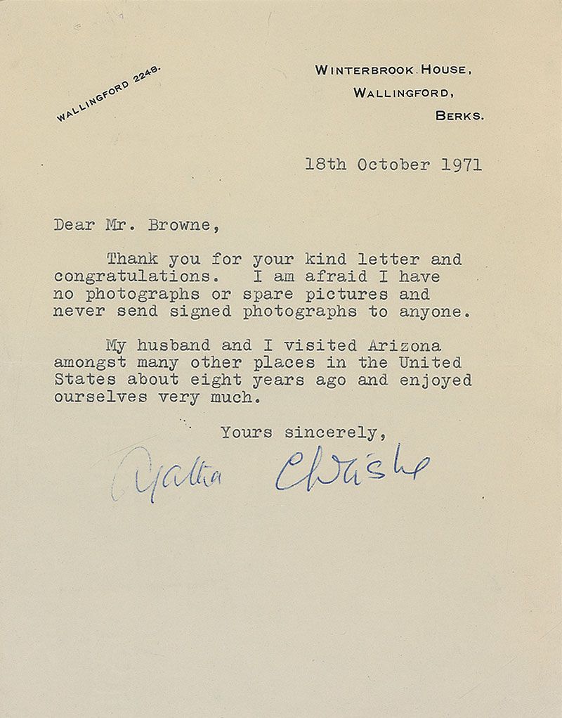 TLS, one page, 5.5 x 7, Winterbrook House letterhead, October 18, 1971. Letter to Mr. Browne. In full: “Thank you for your kind letter and congratulations. I am afraid I have no photographs or spare pictures and never send signed photographs to anyone. My husband and I visited Arizona amongst many other places in the United States about eight years ago and enjoyed ourselves very much.” In fine condition, with a staple hole to top edge.