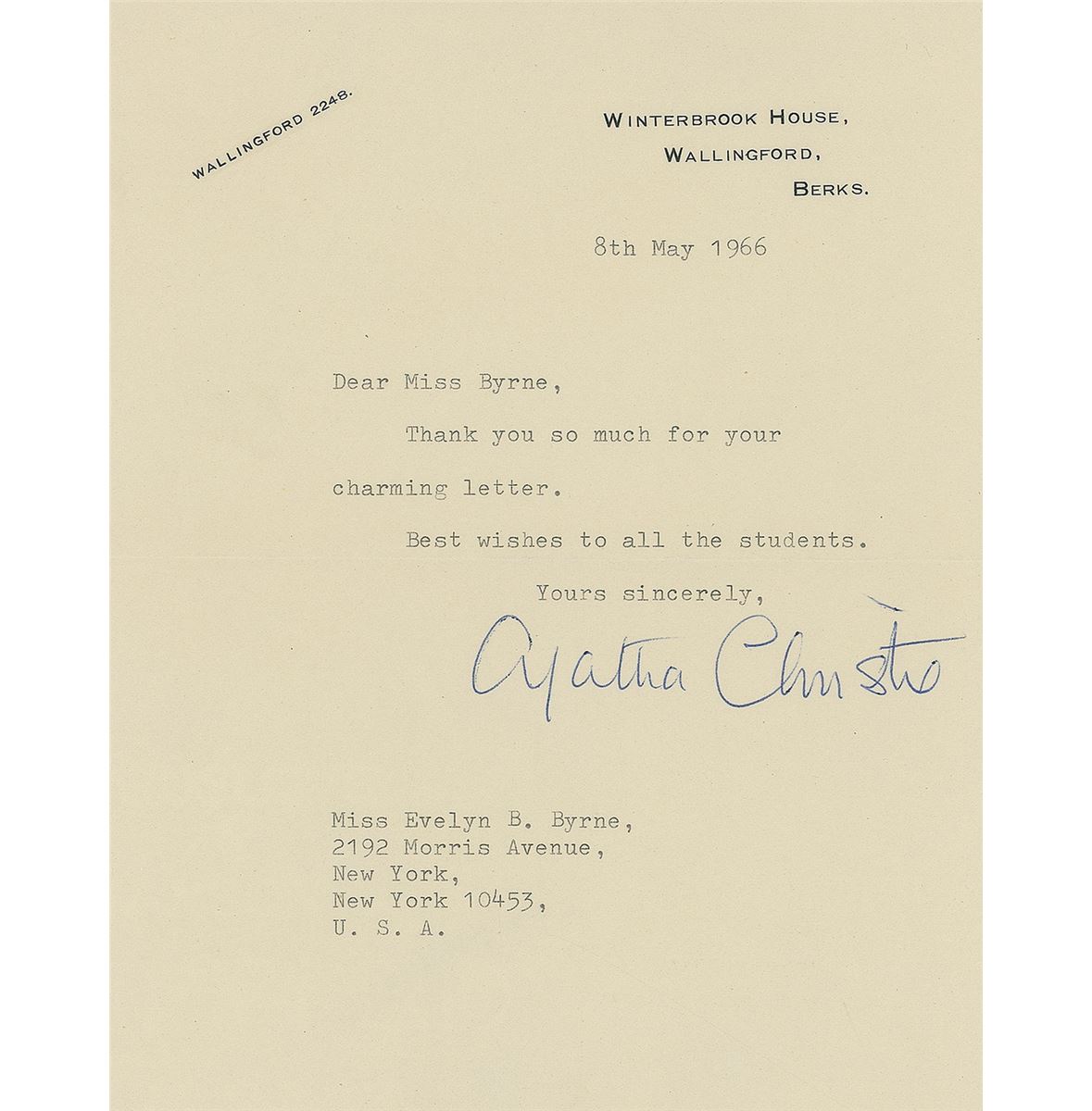 TLS, one page, 5.5 x 7, personal letterhead, May 8, 1966. Letter to Evelyn Byrne, in full: “Thank you so much for your charming letter. Best wishes to all the students.” In fine condition. Accompanied by the original mailing envelope, an 8 x 10 glossy unsigned MGM publicity photo of Christie and actress Margaret Rutherford, with a caption on the reverse detailing Murder She Said, a film based on Christie’s novel 4:50 From Paddington, and a photocopy of a previous letter to the recipient, dated February 19, 1966, concerning books the authoress read as a teenager.