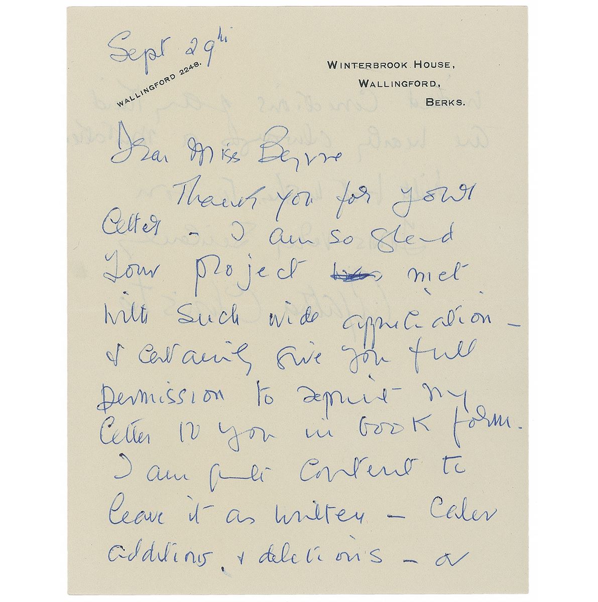 ALS, one page both sides, 5.5 x 7, personal letterhead, September 29, 1967. Letter to E. B. Byrne, in part: “I am so glad your project met with such wide appreciation—I certainly give you full permission to reprint my letter to you in book form. I am quite content to leave it as written—later additions & deletions—or indeed corrections of any kind are nearly always a mistake.” In fine condition, with expected horizontal mailing fold passing through the signature. Accompanied by the original mailing envelope and a glossy photo of Christie. Byrne ran a program at New York City's Elizabeth Barrett Browning Junior High School where she asked major literary and artistic figures for recollections of what books inspired them; some responses were published in the 1971 book Attacks of Taste.