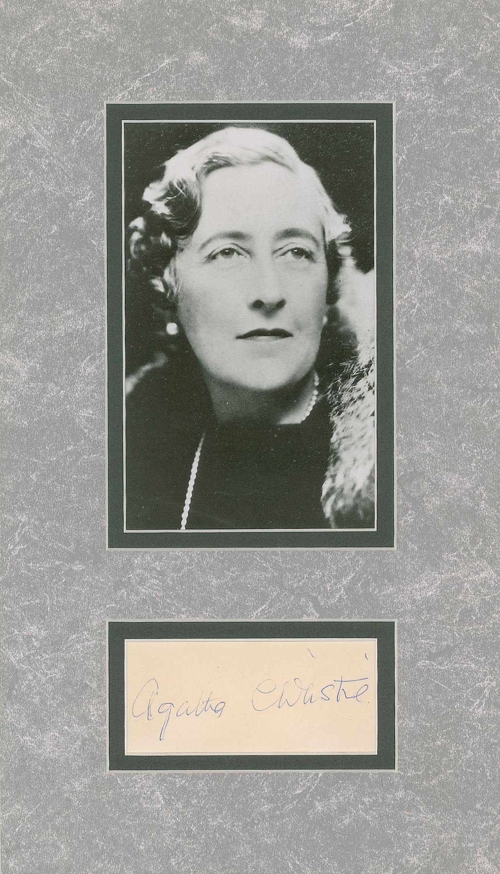 Ballpoint signature, "Agatha Christie,” on an off-white 4 x 1.75 card. Double-matted with a portrait of the mystery author to an overall size of 8 x 14. In fine condition.