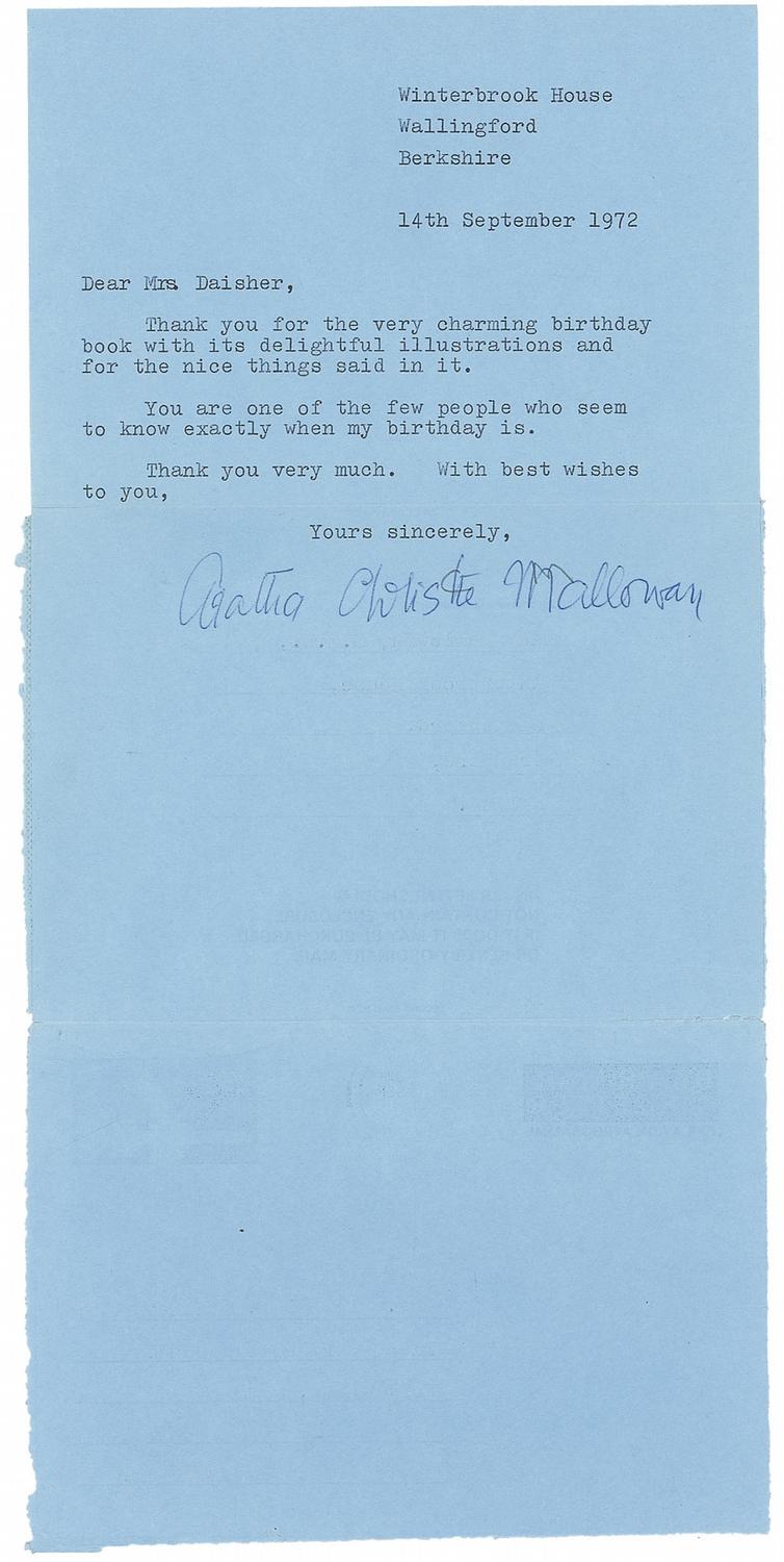 TLS signed “Agatha Christie Mallowan,” one page of a self-contained air mail letter, 6 x 12, September 14, 1972. Christie writes Mrs. Millard K. Daisher of North Lima, Ohio. In full: “Thank you for the very charming birthday book with its delightful illustrations and for the nice things said in it. You are one of the few people who seem to know exactly when my birthday is.” In fine condition, with scattered creasing and wrinkling.