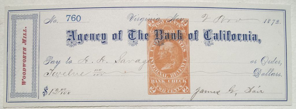 November 2, 1872. From James Fair (signed by him) and the Woodworth Mill to A. A. Savage. The Savage Mine was one of the big producers on the Comstock. The name is still big in Reno as A. A. Savage's descendants run the Savage Plumbing and Heating Company. Scott type E orange two cent imprinted revenue stamp.