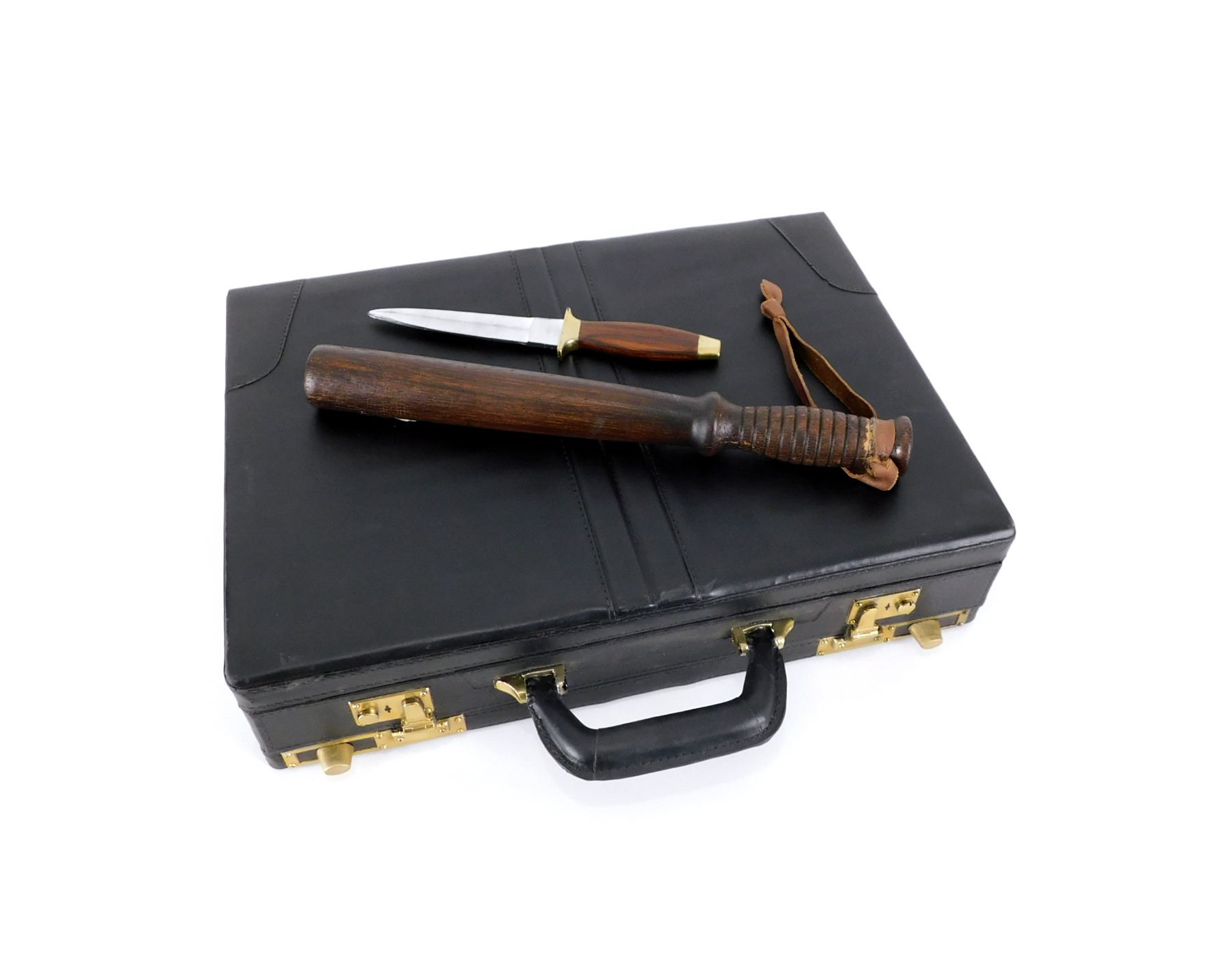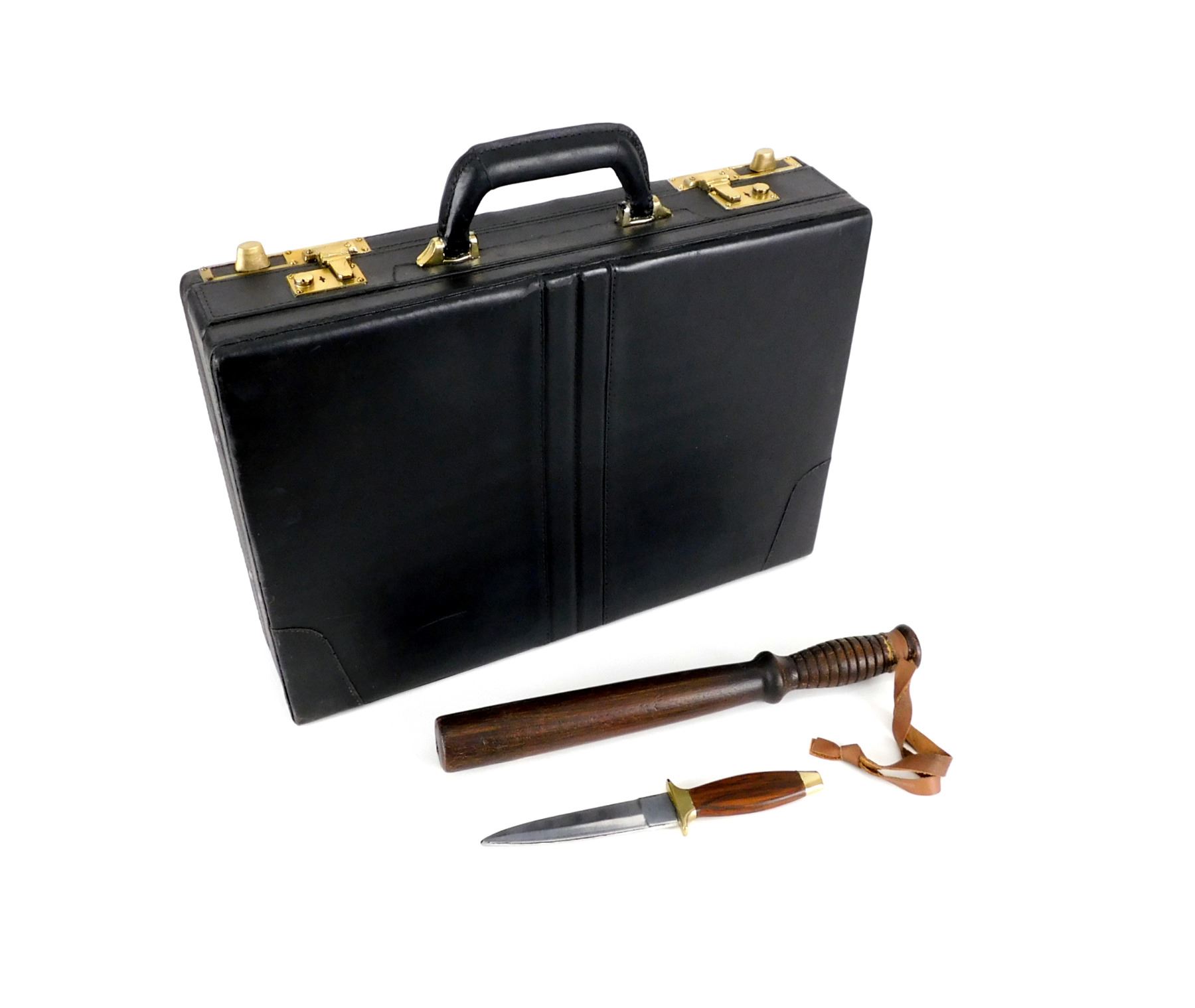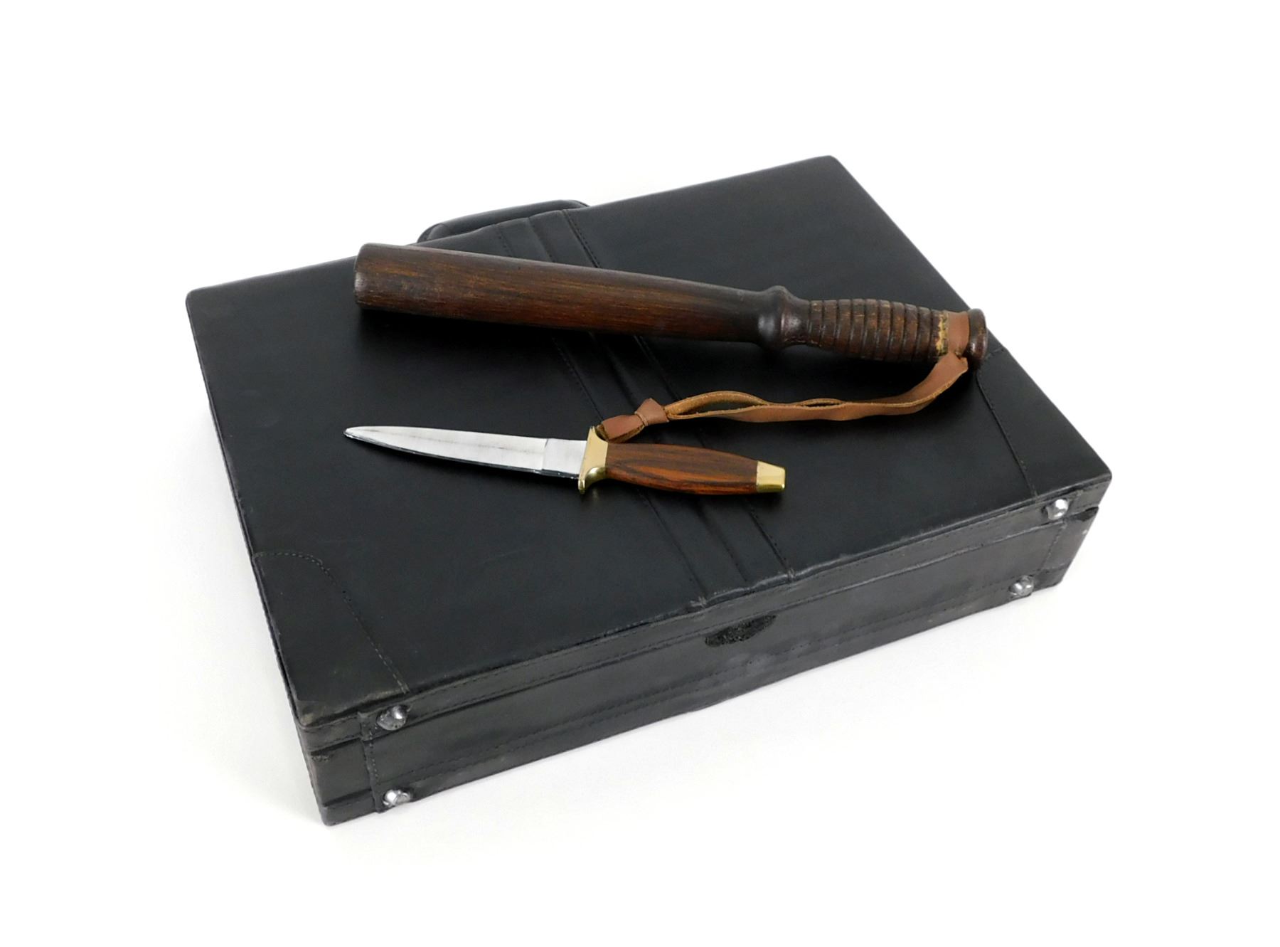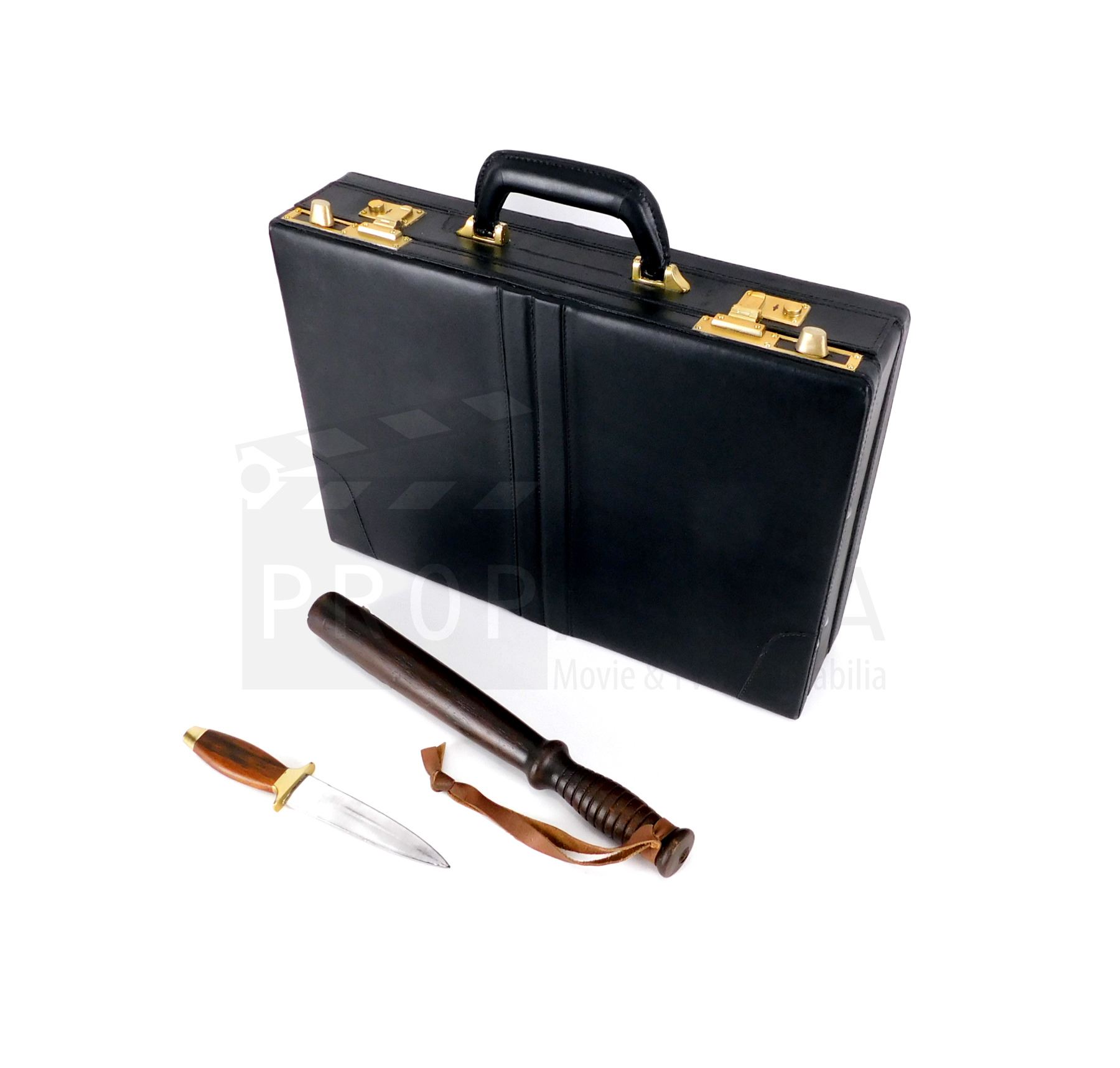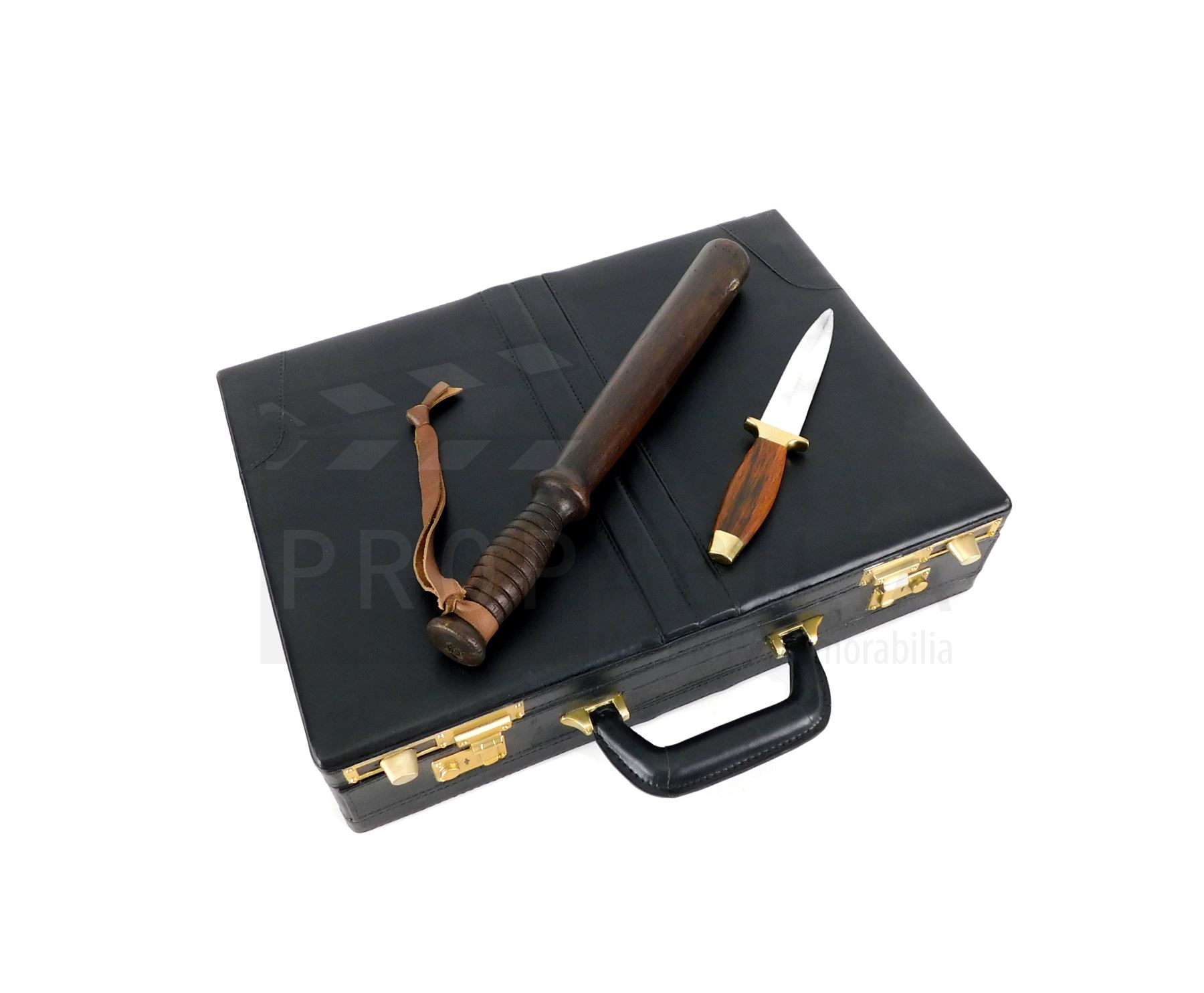 This briefcase, stunt rubber baton, and plastic knife were made for use in the Agent Carter One Shot episode.
