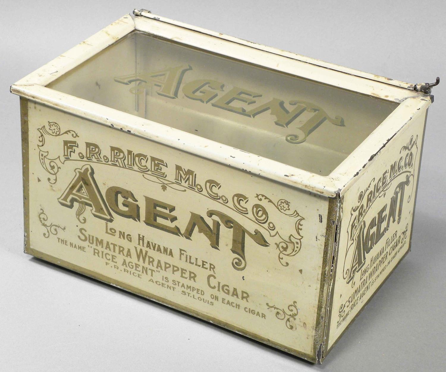 Agent Cigar Store Display Tin. F. R. Rice Mfg. St. Louis. Glass lid with decal and tin litho sides. Excellent condition. 8 1/2 X 5 3/4 X 4 3/4 inches. Starting bid $50