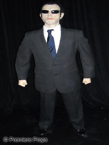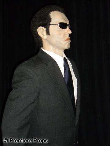 Agent Smith Life Size Figure - A life size figure of Hugo Weaving's character in the "Matrix" films. The face was made from an original face casting of the actor. The entire costume is replica. The figure is made of silicone (the most expensive and longest lasting material for figures also giving the skin a more life like texture) with punched hair and realistic eyes.
