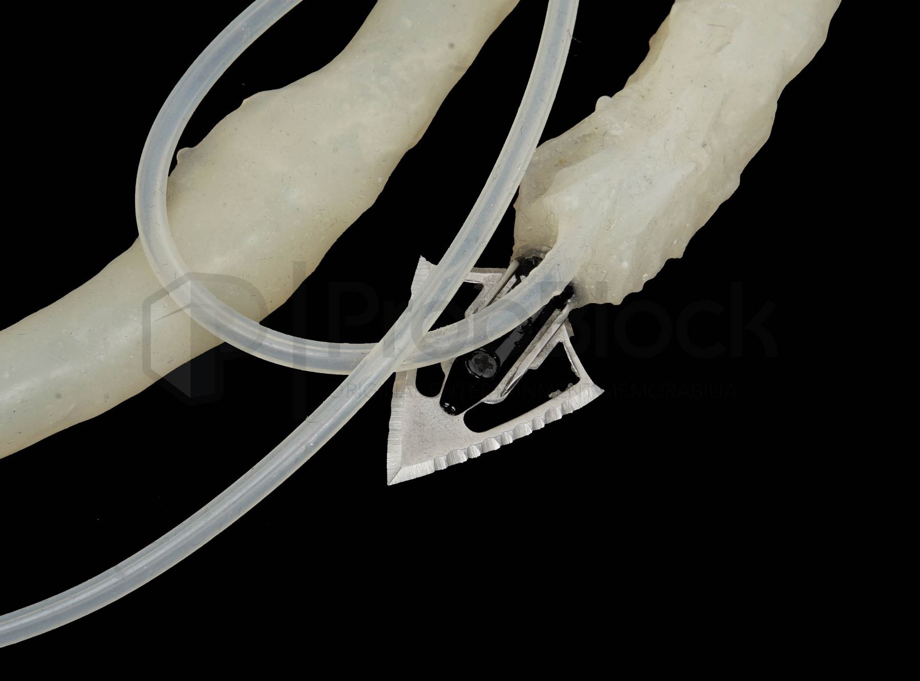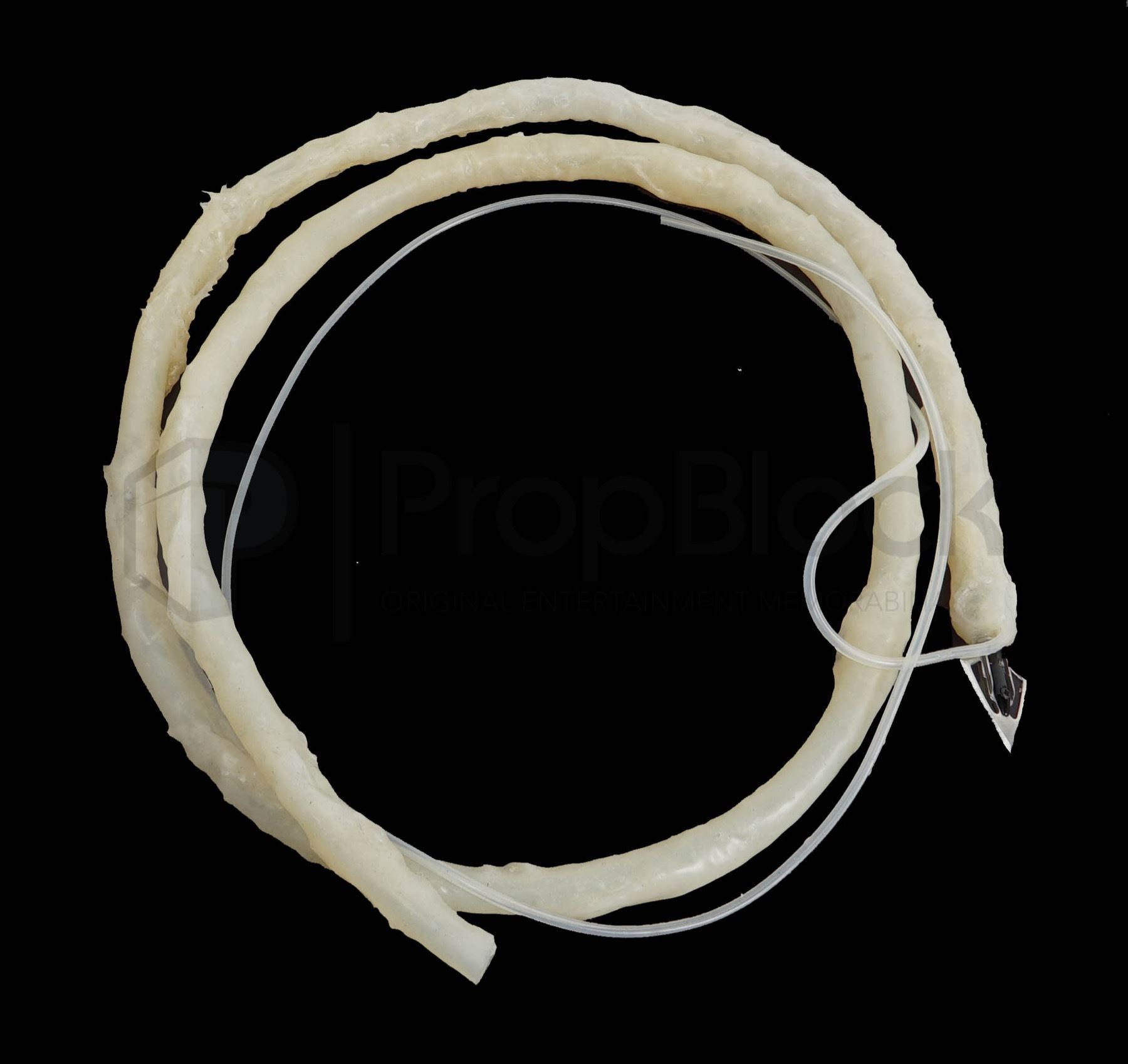 Alien style tubing featured in the hit ABC Marvel series Agents of Shield. The missions of the Strategic Homeland Intervention, Enforcement and Logistics Division. This piece was sued when the Kree first landed on Earth and created the Hive in season three. The tubing is made form a clear rubber with a textured coating. The tubing features a small clear piece of rubber attached to the end and a very sharp metal arrow tip fixed inside one of the ends. This item remains in excelled, production used condition.