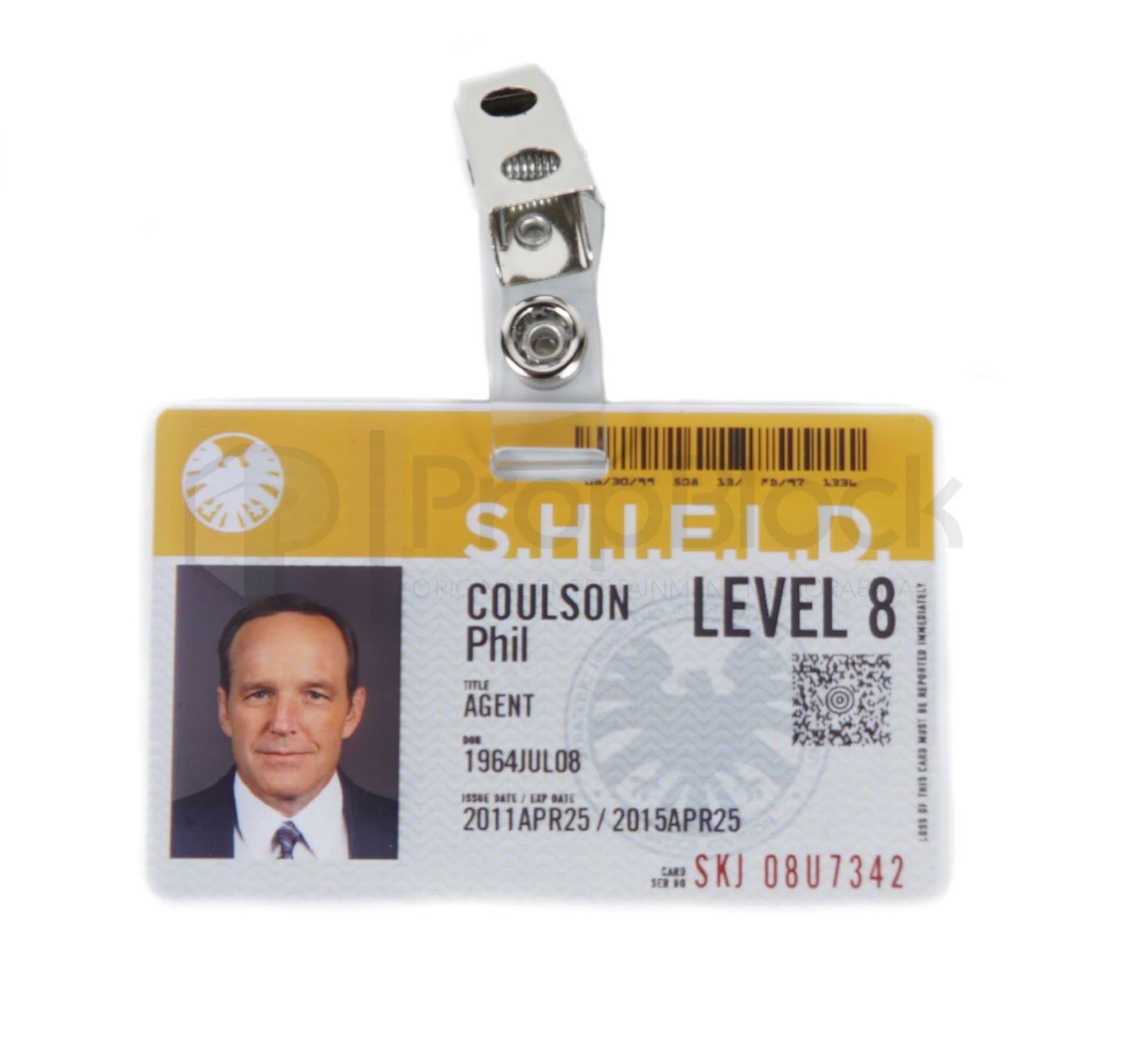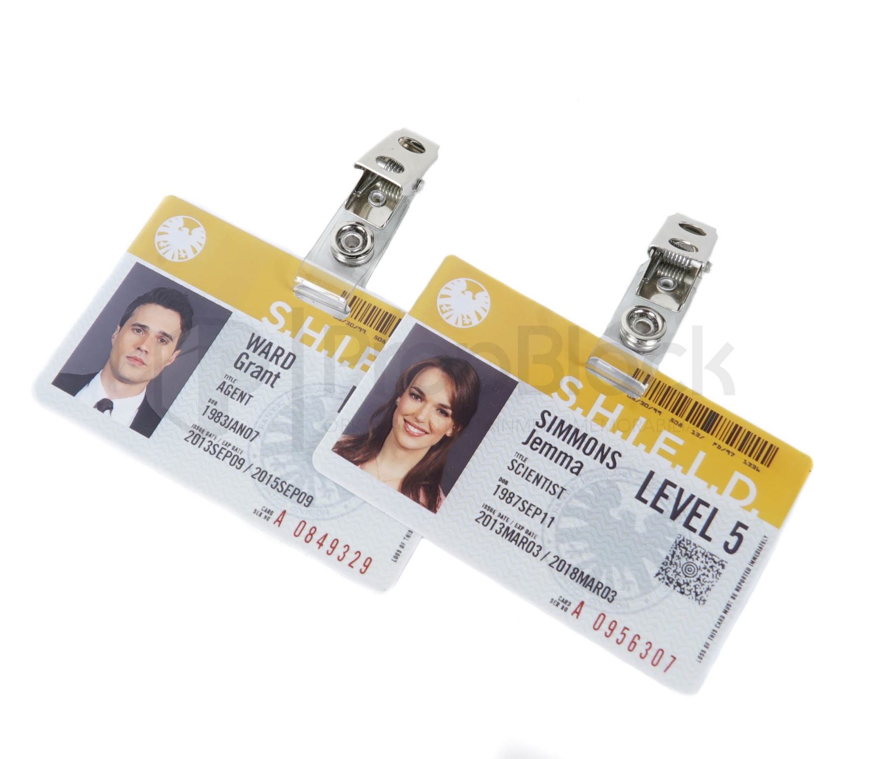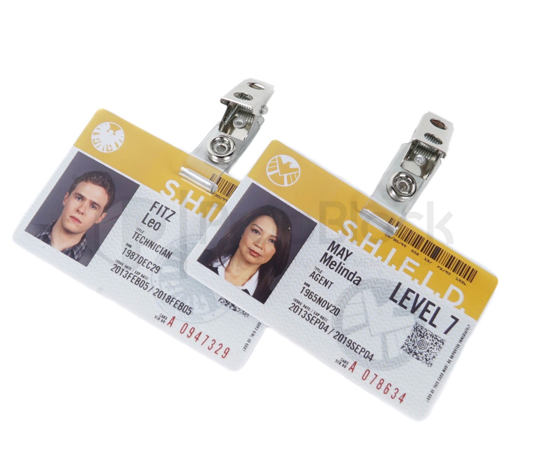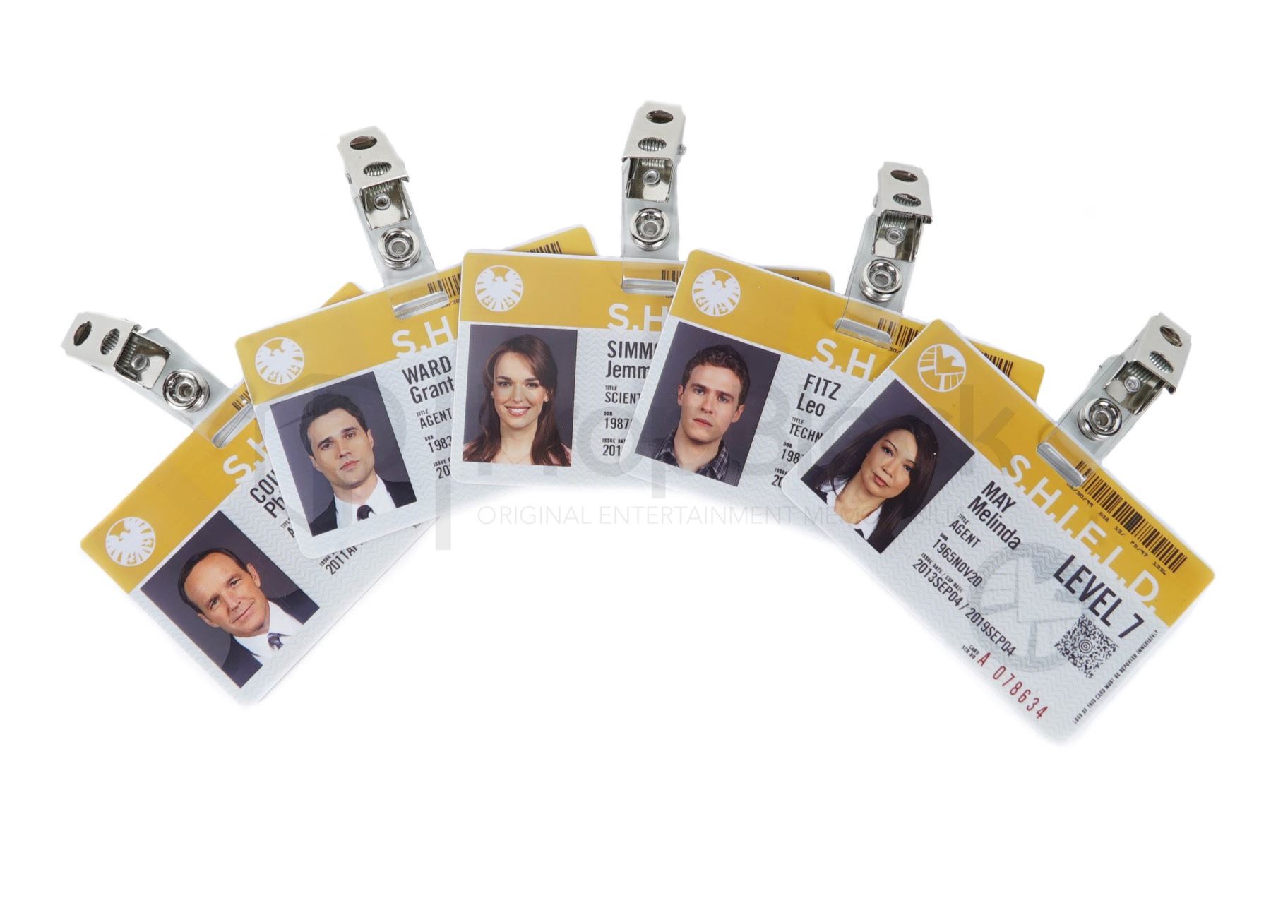 Collection of ID cards used by the main cast of the hit ABC series Agents of S.H.I.E.L.D. The worldwide law-enforcement organization known as S.H.I.E.L.D. (Strategic Homeland Intervention Enforcement and Logistics Division) employs an elite team of agents who investigate strange occurrences around the globe and beyond. This set features cards for the characters of Melinda May, Leo Fitz, Grant Ward, Jemma Simmons and Phil Coulson. Each card features a metal clip, an image of the actor and printed details such as the Shield logo and barcode. Each card remains in excellent, production made condition.