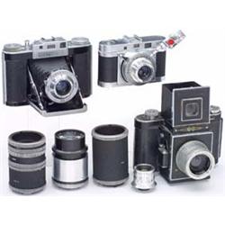 Agilux Ltd., England: 1) "Agiflex I", 1946, 6 x 6 cm, Reflex-Korelle-Nachbau, ohne Verschlußtuch. - Reflex Korelle copy, no curtains. (3/5) - Mit Agilux Anastigmat 3,5/80, Dallmeyer Dalmac 3,5/5" und 4 Zwischenringen. - With 2 lenses and 4 extension tubes. (3/3) - Und: 2) "Agimatic", 1956, mit 2 Objektiven: Anastigmat 2,8/45 und Anastigmat 5,5/85. Rainbow Selftimer und Filter. Taschen. - Agimatic with 2 lenses, selftimer, filter and cases. (3+/3+) - Sowie: 3) "Agifold", 1955, Agilux Anastigmat 4,5/75, 1-1/350 Sek., Entfernungsmesser. - Rangefinder. (3/3+). - € 200/250 - (62/165)