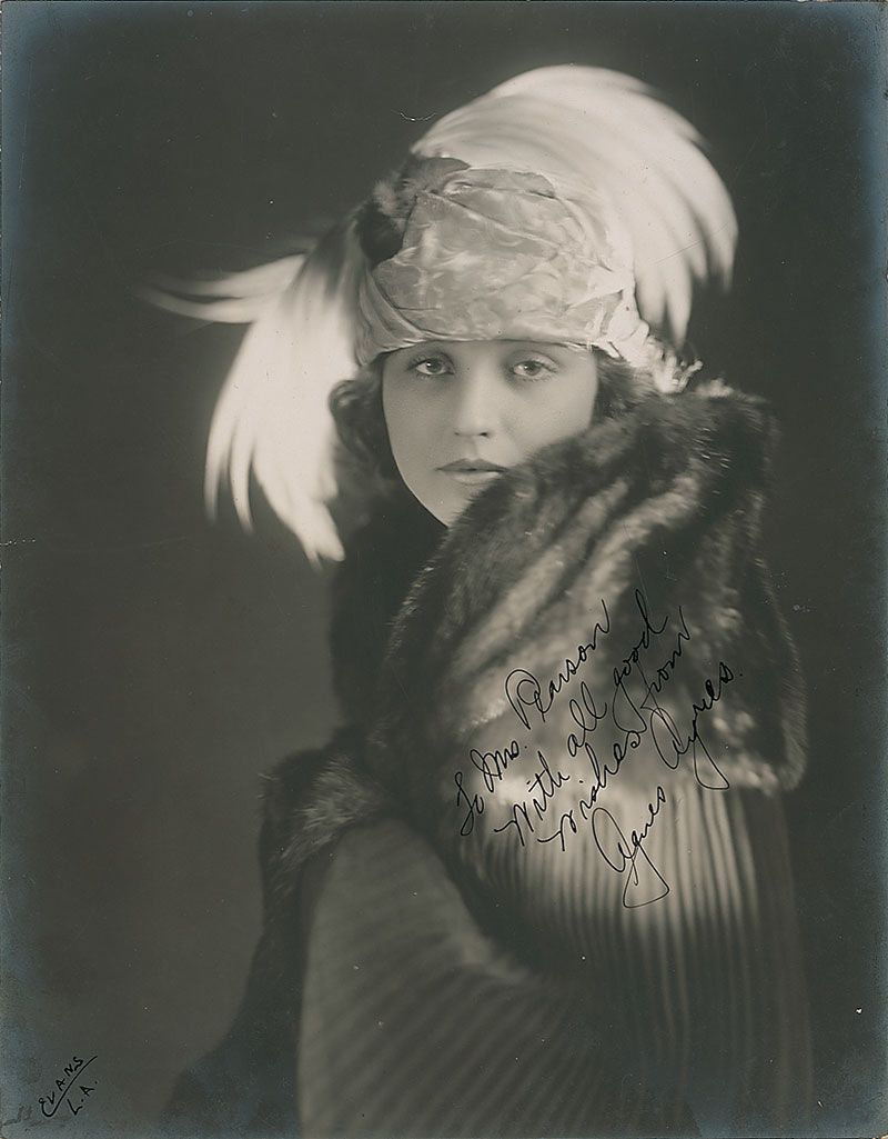 American silent film actress (1898–1940) remembered for portraying Lady Diana Mayo in The Sheik and The Son of the Sheik opposite Rudolph Valentino. Gorgeous vintage matte-finish 7.5 x 9.5 portrait of Ayres wrapped in fur and wearing a fancy hat, signed and inscribed in fountain pen, “To Mrs. Pearson, With all good wishes, from Agnes Ayres.” Also signed in the lower left by the photographer, “Evans, L. A.” In fine condition, with silvering to borders.