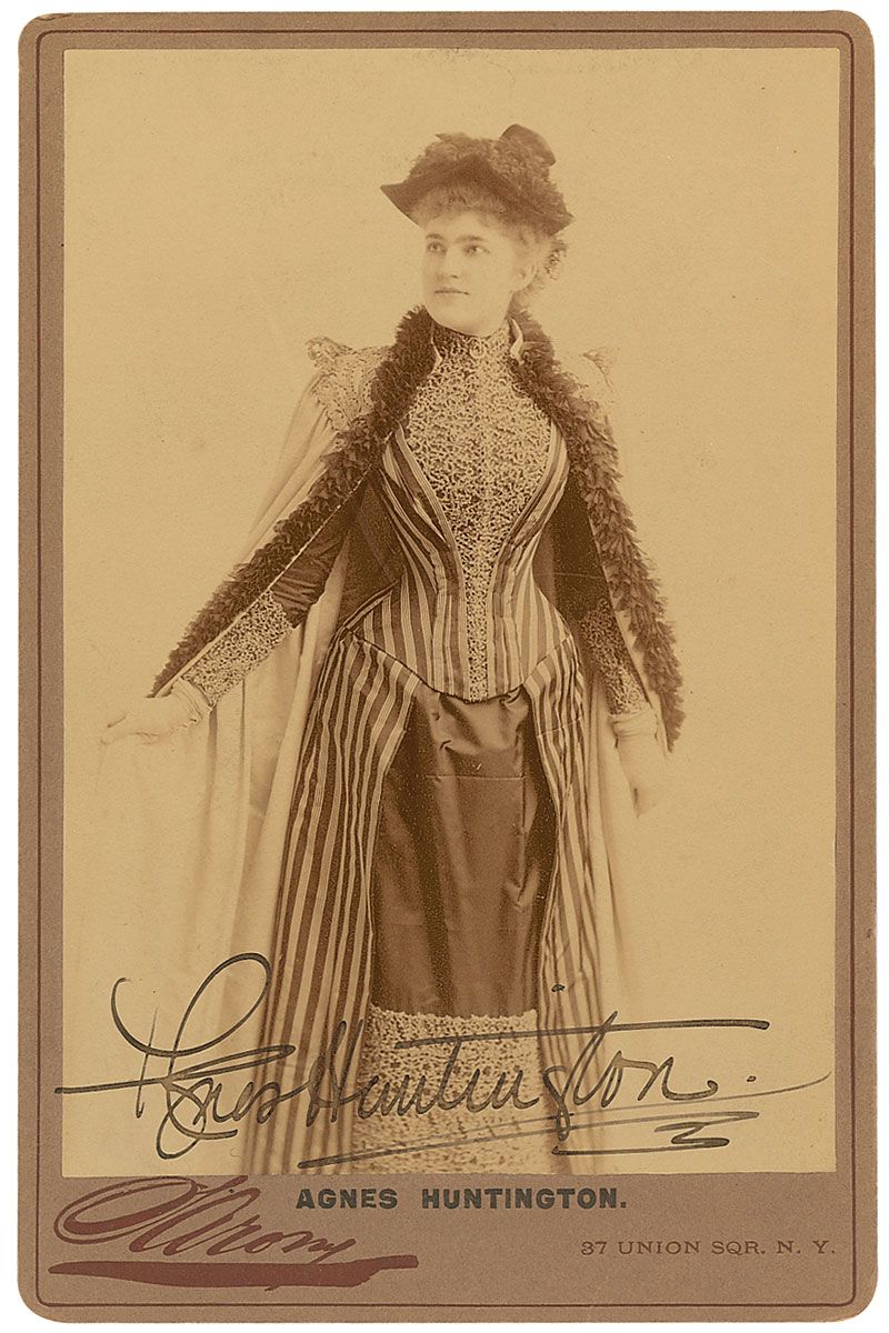 Soprano best known for her work in comic opera. Original 4.25 x 6.5 cabinet photo by Sarony of New York, signed at the bottom of the image in black ink, “Agnes Huntington.” In fine condition.