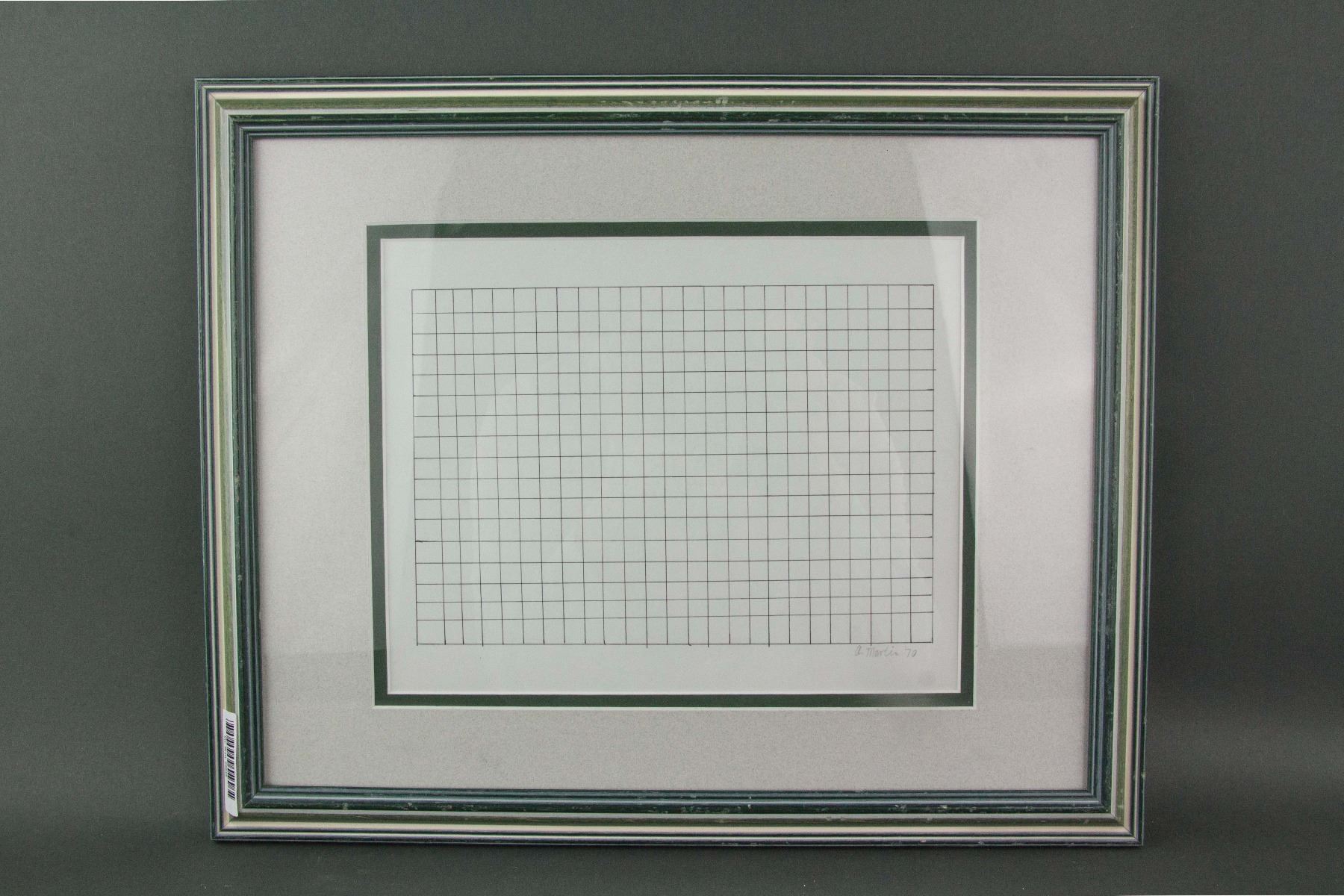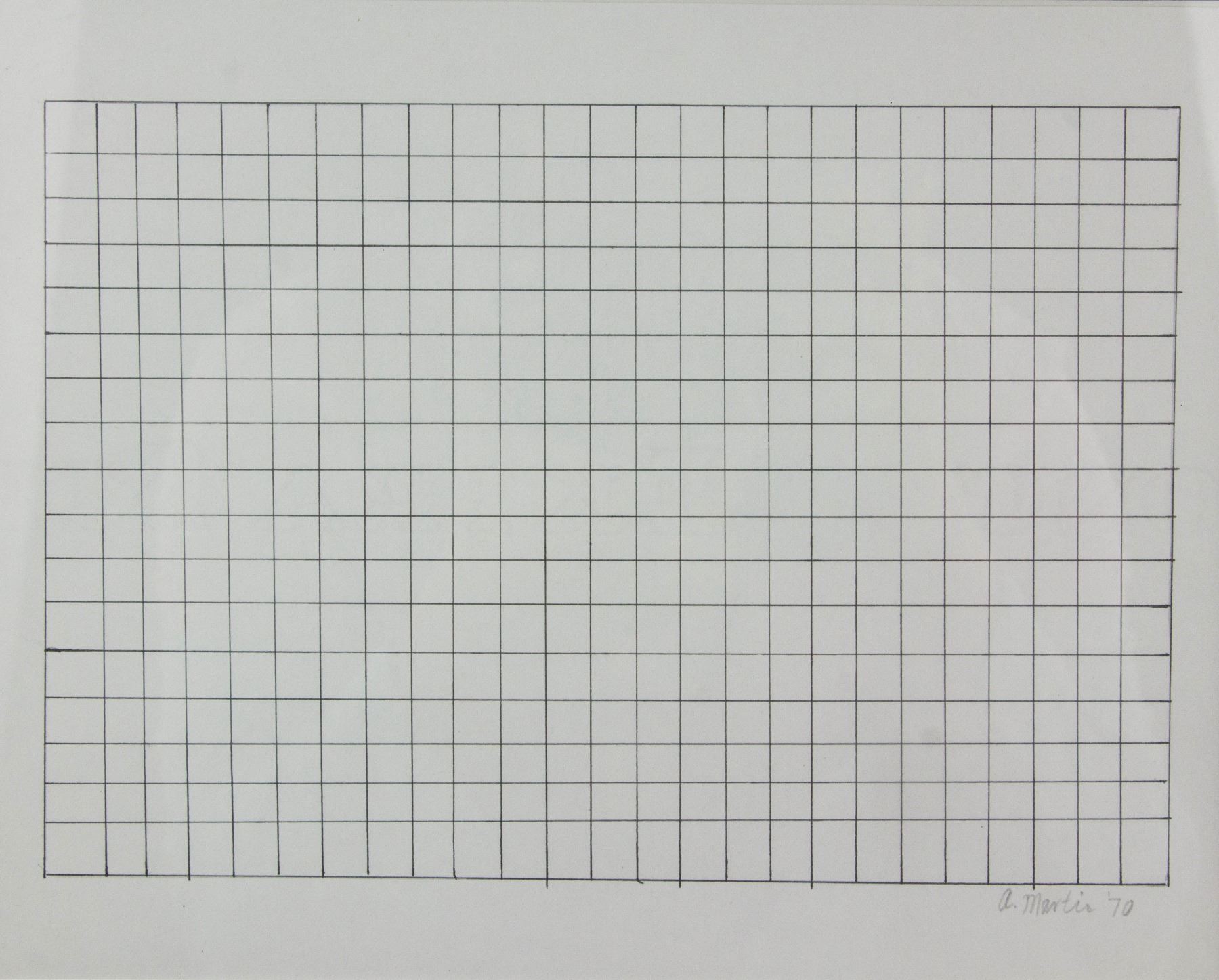 Abstract painting; graphite and ink on paper; framed; signed Agnes Martin (1912-2004), American Canadian artist; dated 1970; 7.5 inches x 9.5 inches
