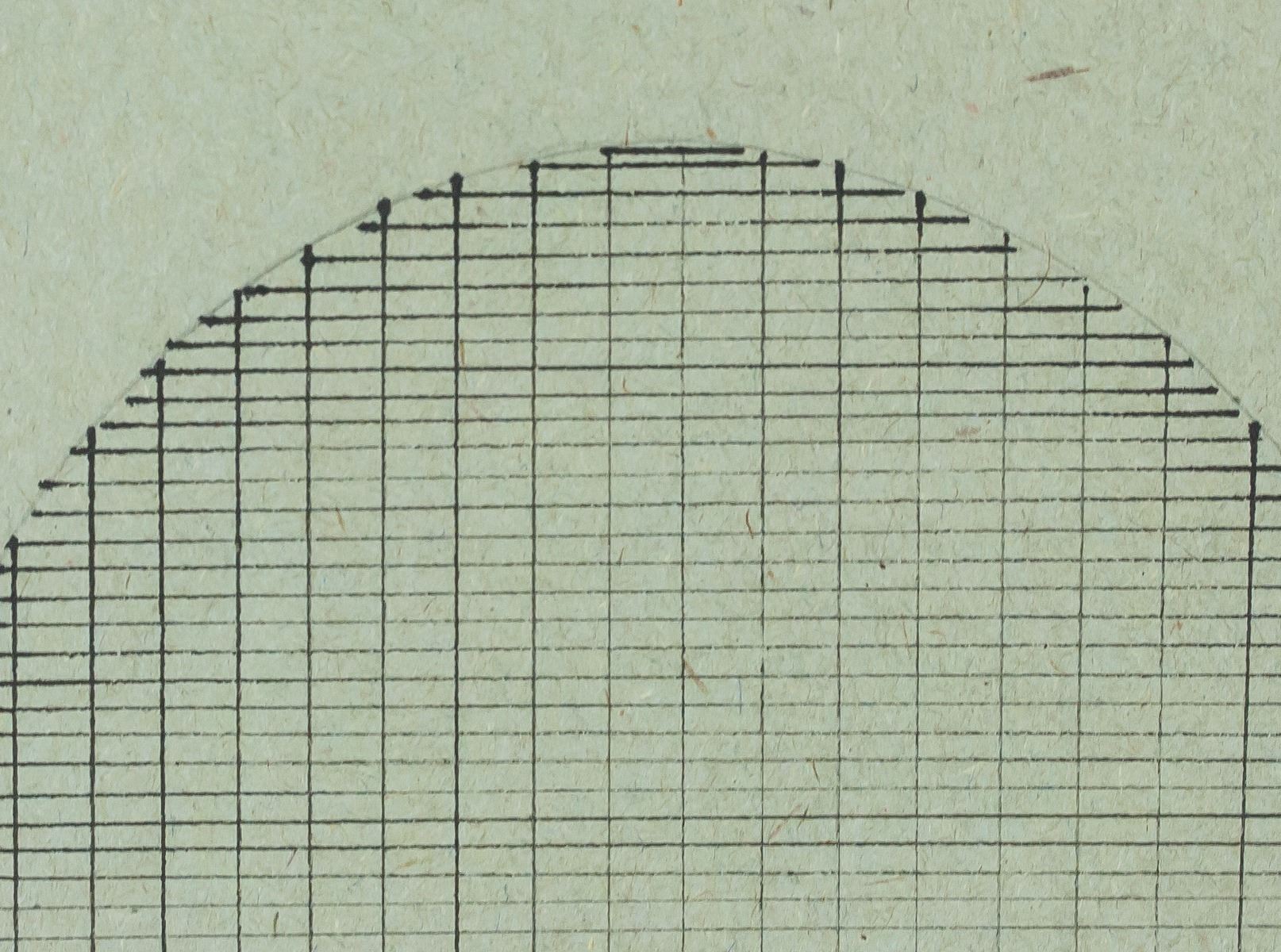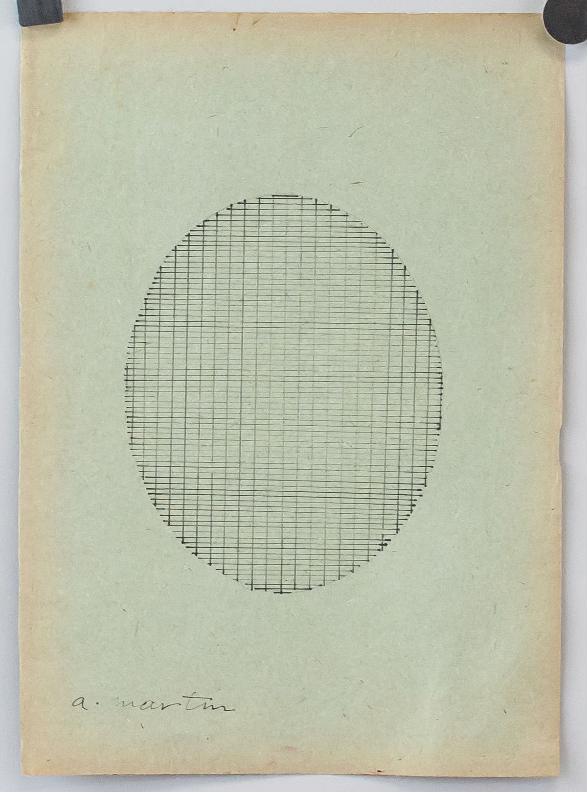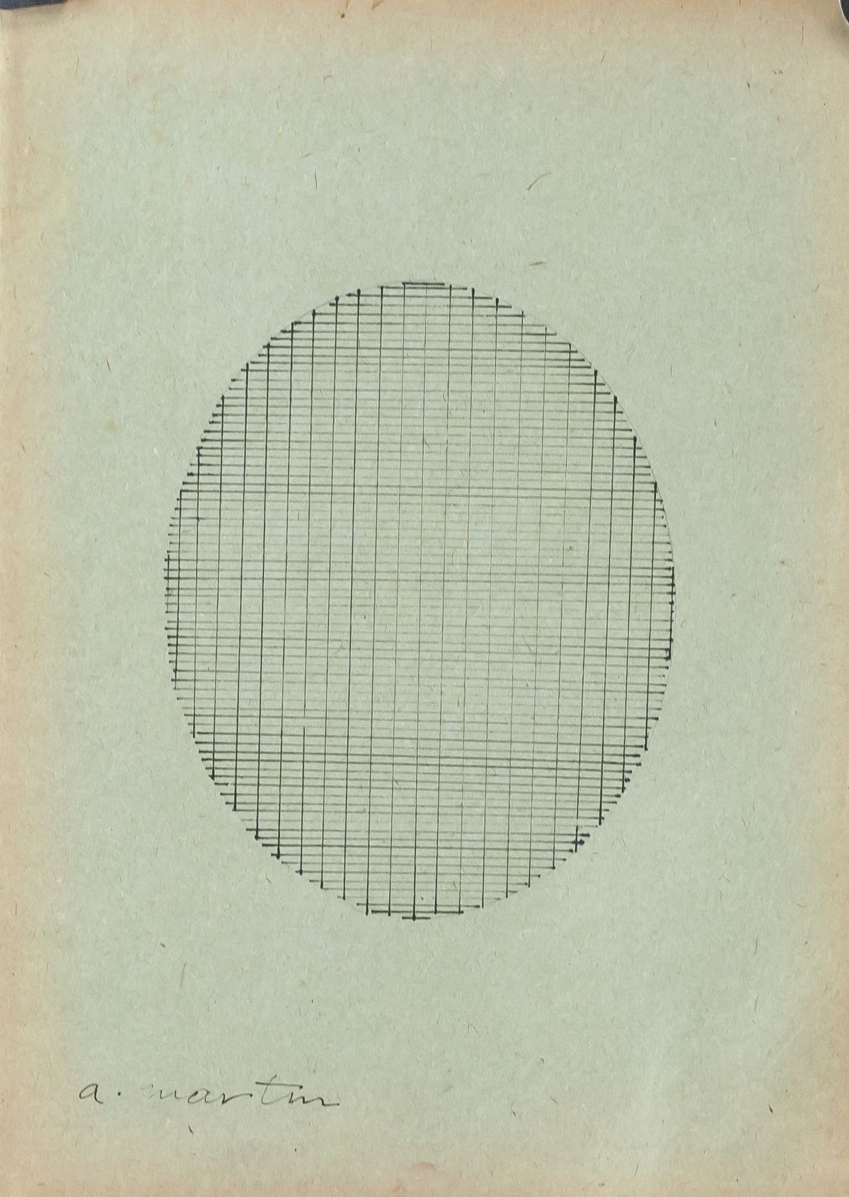 Ink on paper. Featuring modernist composition of an oval with grid lines. Signed "a. martin" in the bottom left corner. Red circular stamp on verso with "Y220G" inscribed in the center. Label affixed to verso reads "No 433B" with "4338" inscribed upside down. "SEGO ART" stamped on verso. Attributed to Agnes Martin (1902-2004, American-Canadian). 33 x 24 cm (13 x 9.25 inches). PROVENANCE: This lot carries limited provenance from a Southern Ontario estate