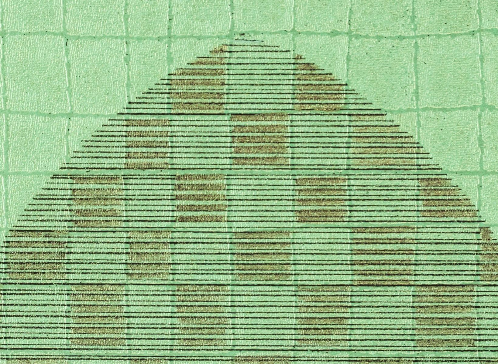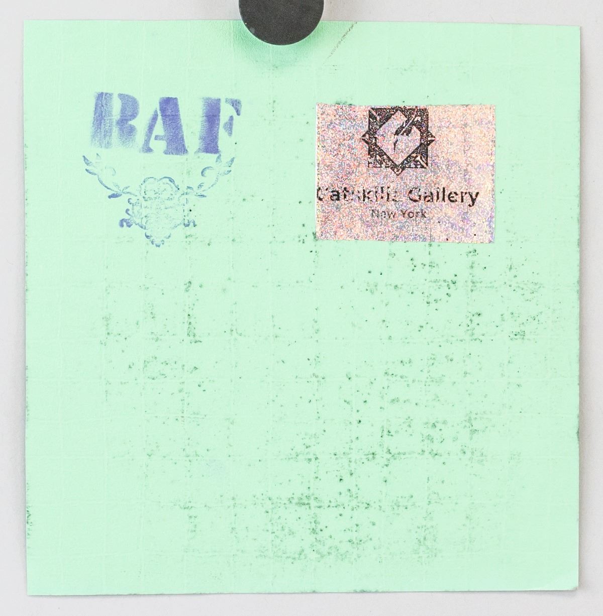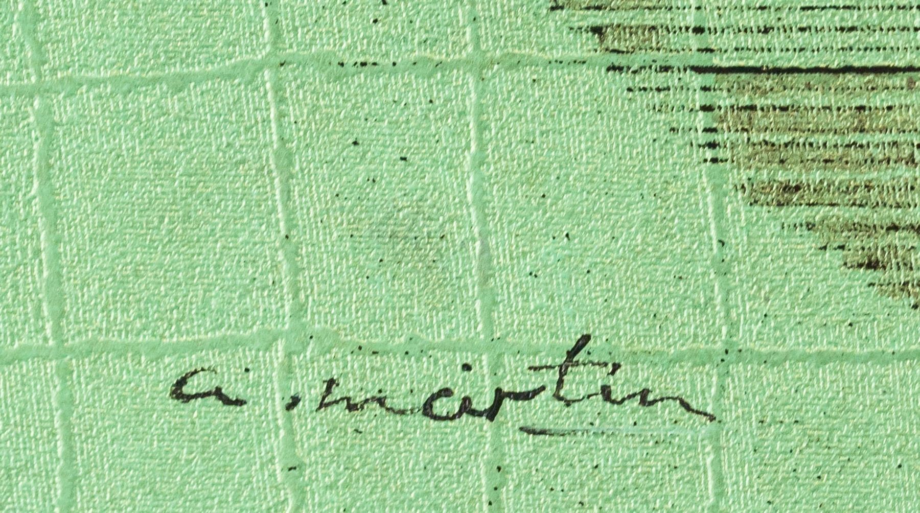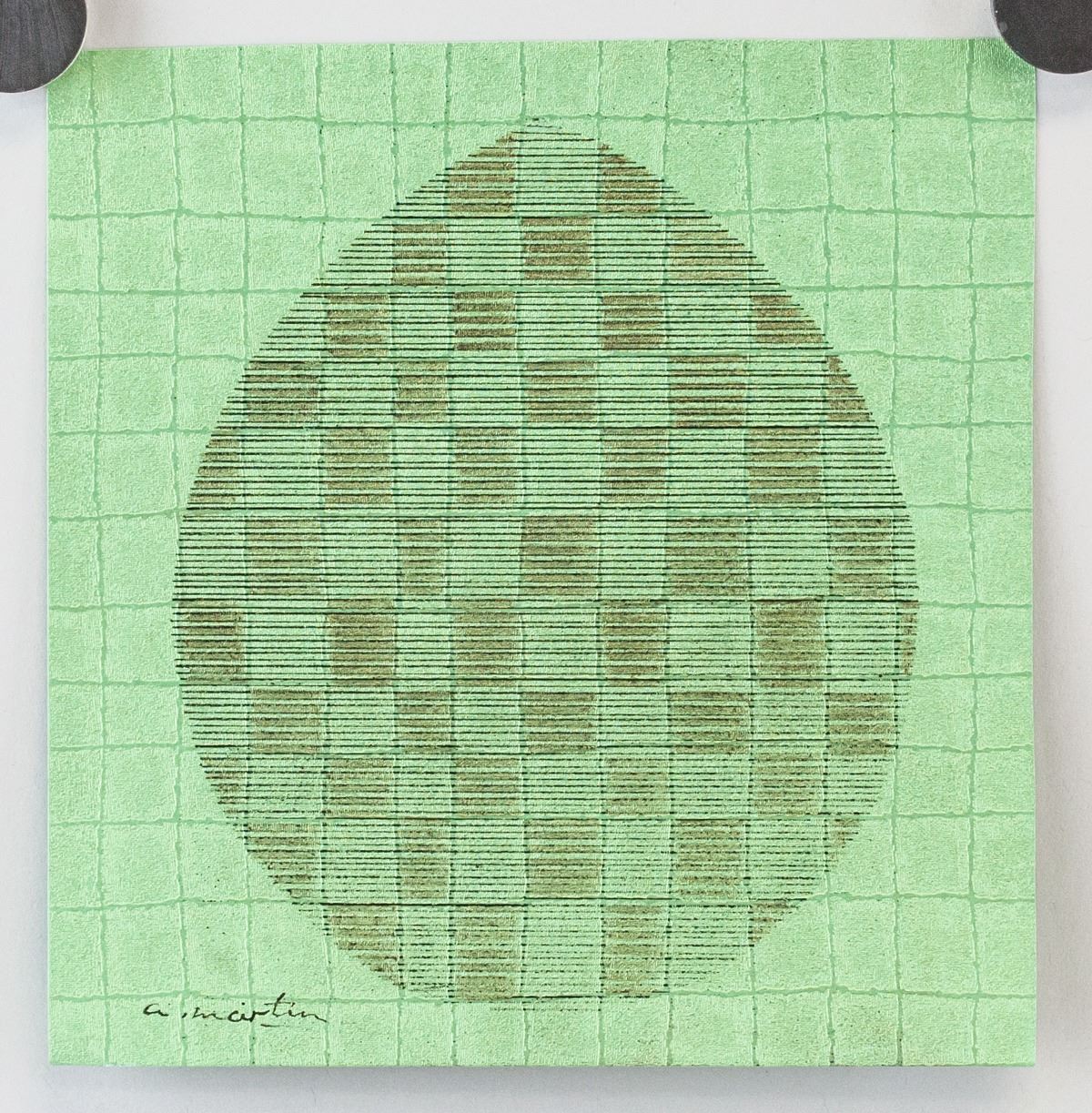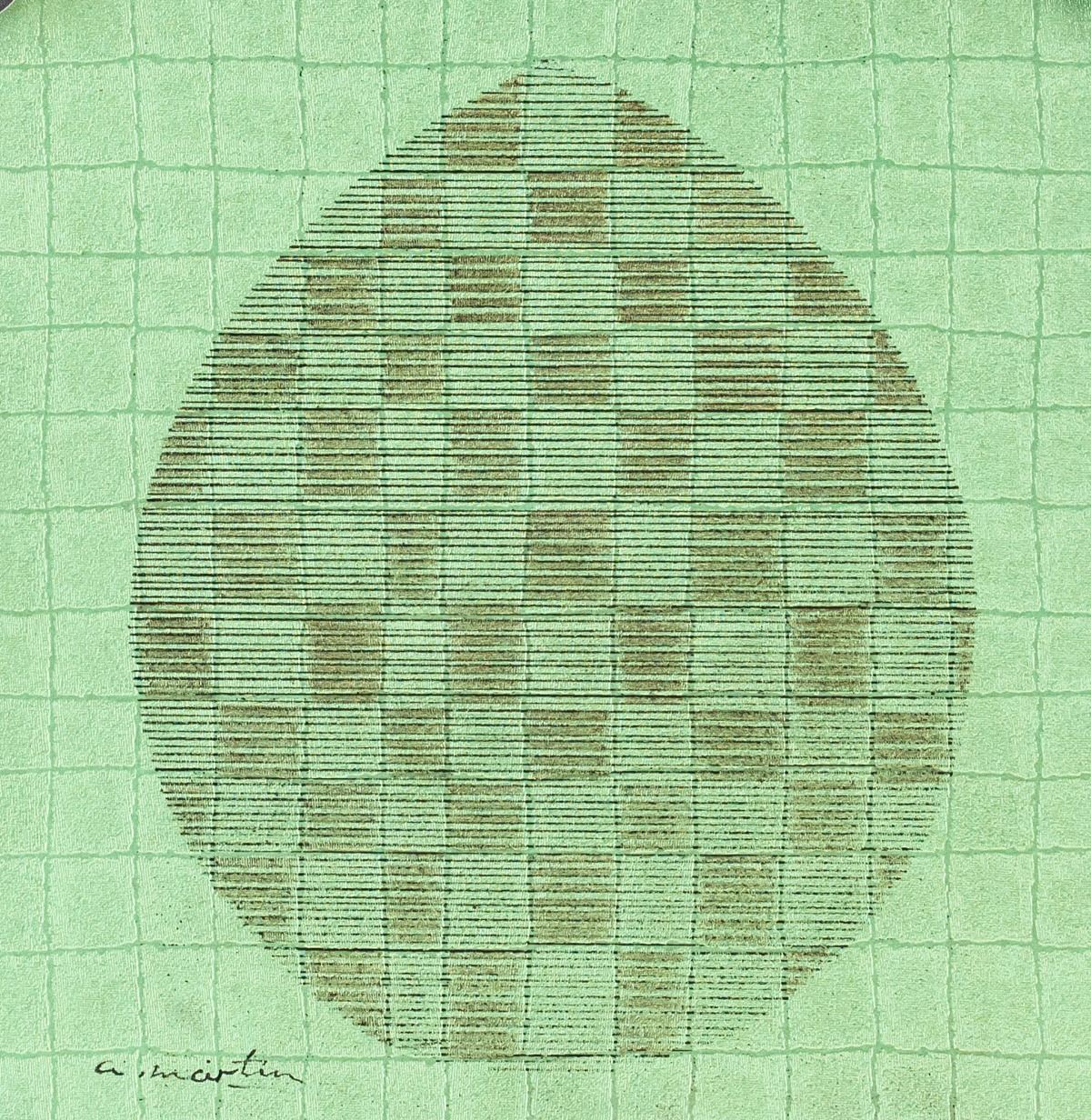 Ink on paper. Featuring tear drop shape on grid paper. Signed "a. martin" in the bottom left corner. Label on verso reads "Catskills Gallery New York". "RAF" stamped on verso. Attributed to Agnes Martin (1912-2004, American). 17 x 16.2 cm (6.6 x 6.5 inches).