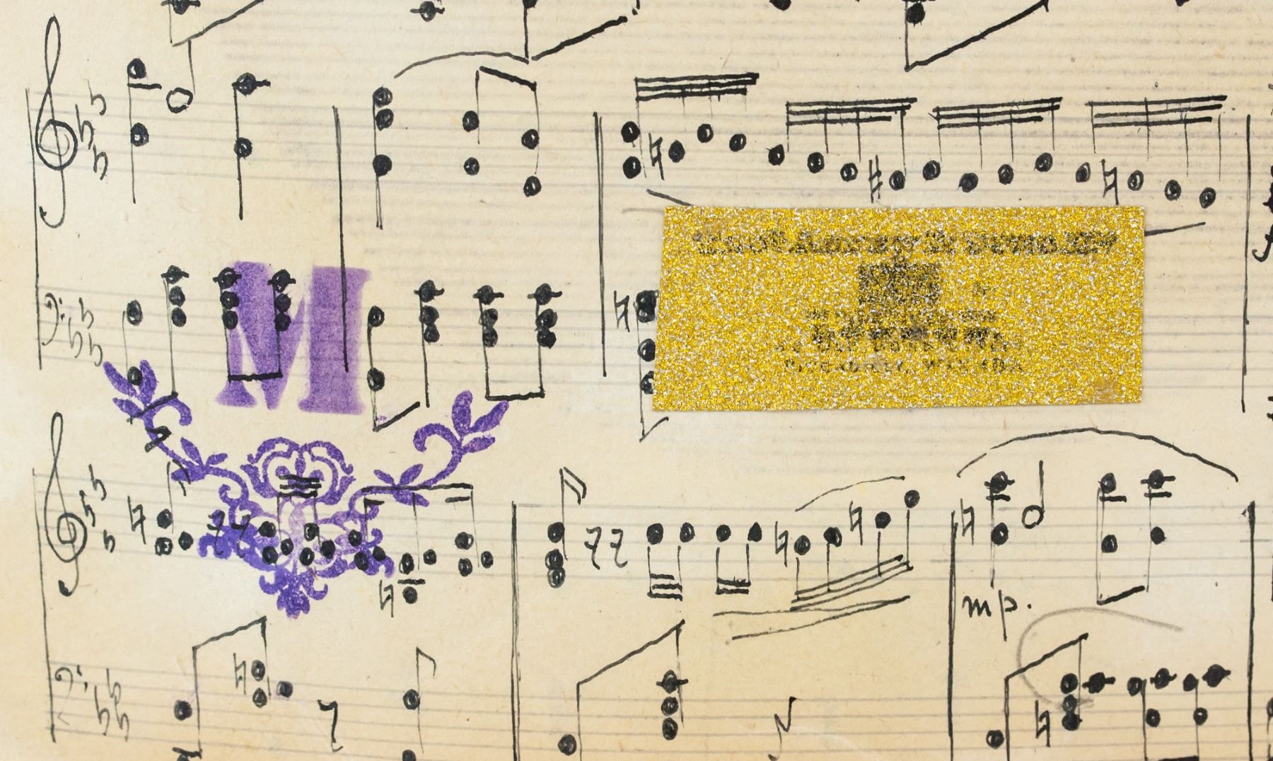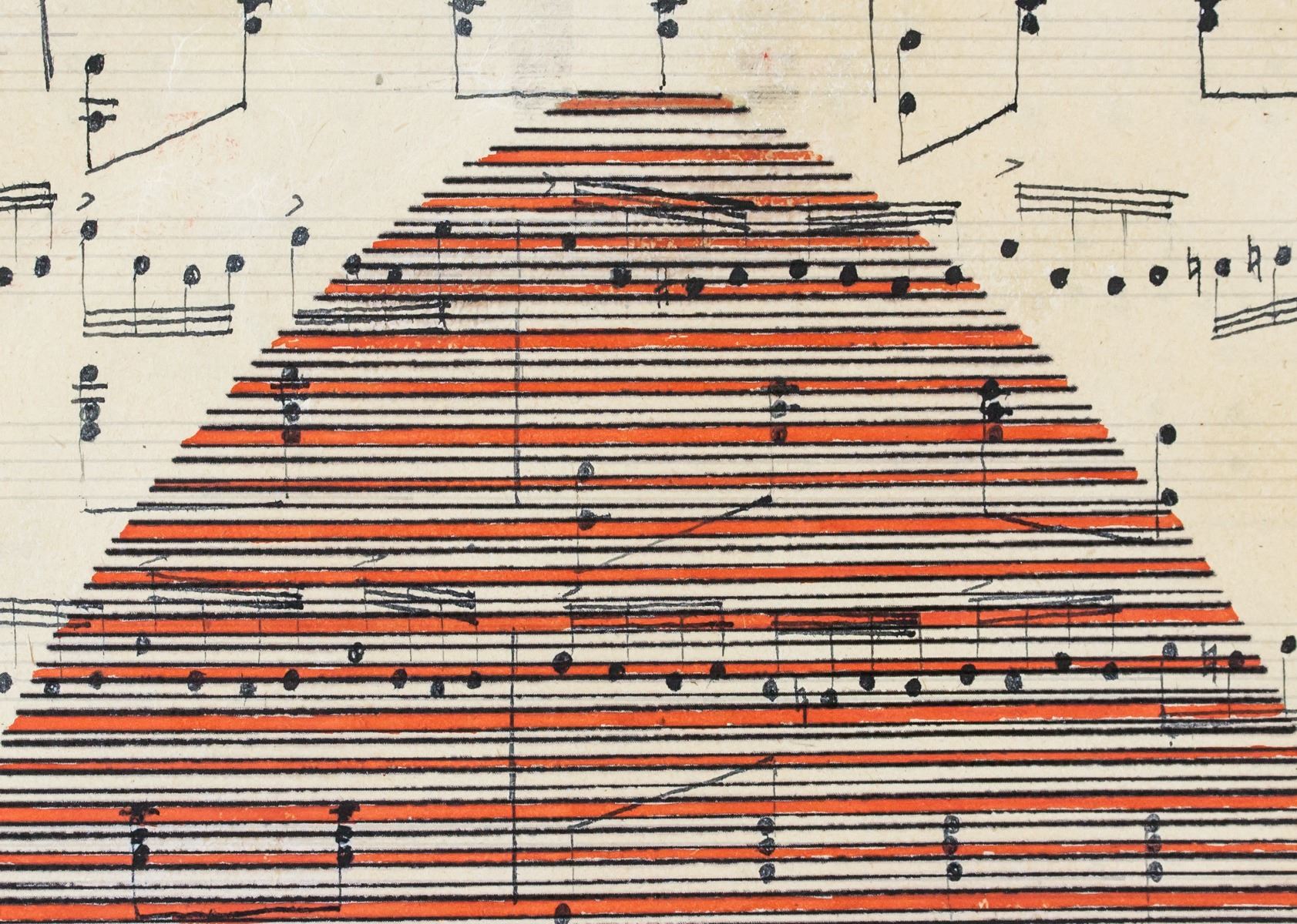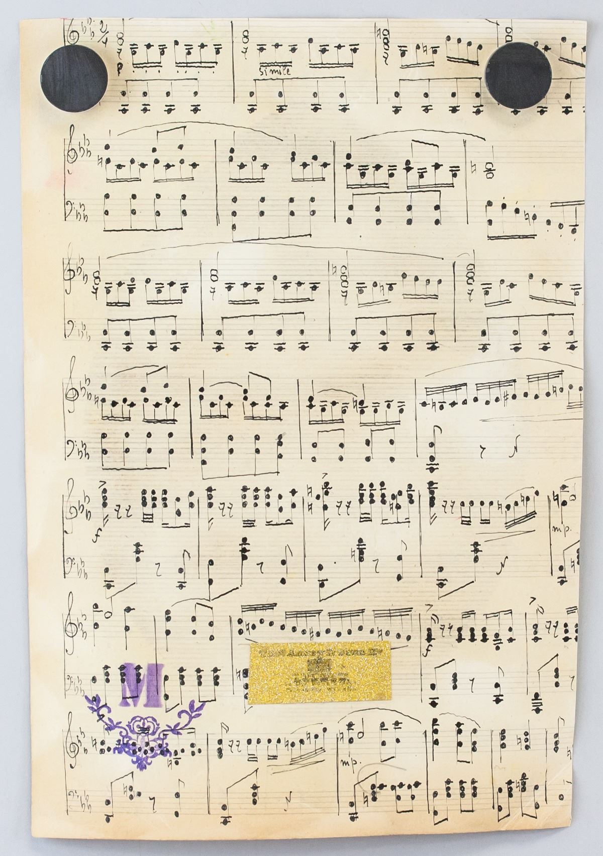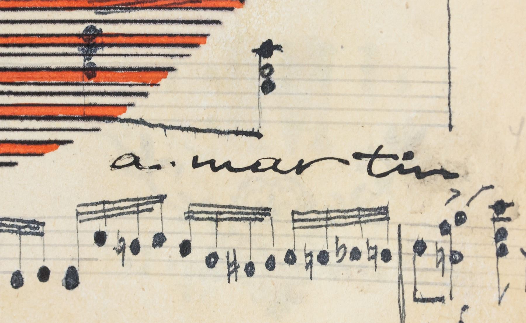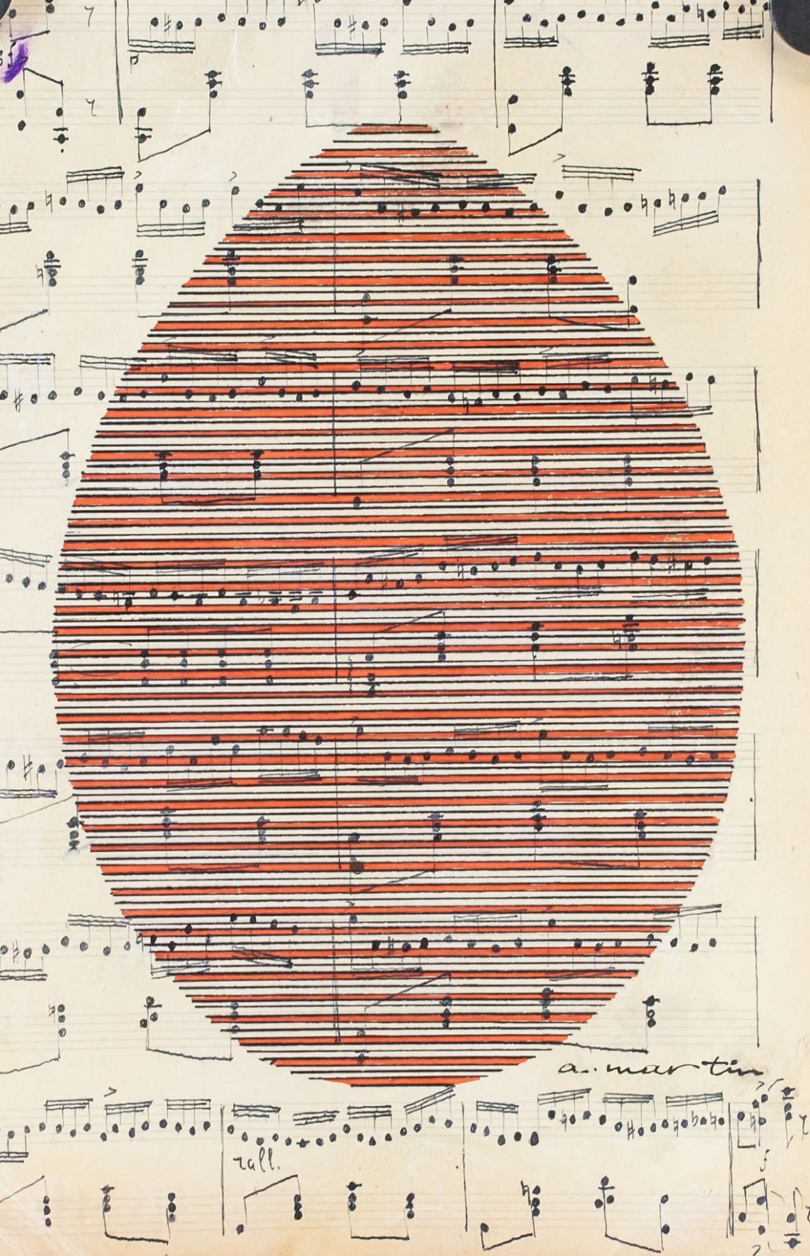 Ink on paper. Featuring stripped tear drop shape on sheet music. Signed "a. martin" in the bottom right corner. "M" stamped on verso, accompanied by illegible yellow label. Attributed to Agnes Martin (1912-2004, American). 30.5 x 21 cm (12 x 8.25 inches).