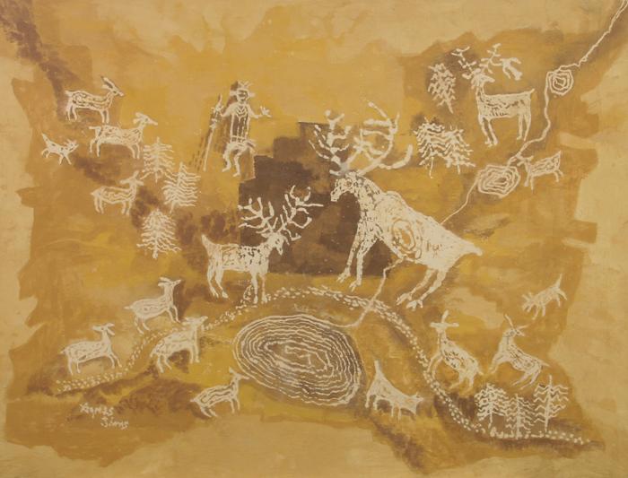 Agnes Sims (1910-1990). Watering Hole. 56" x 74" oil on canvas. signed lower right. Condition Report: Black lights clean.